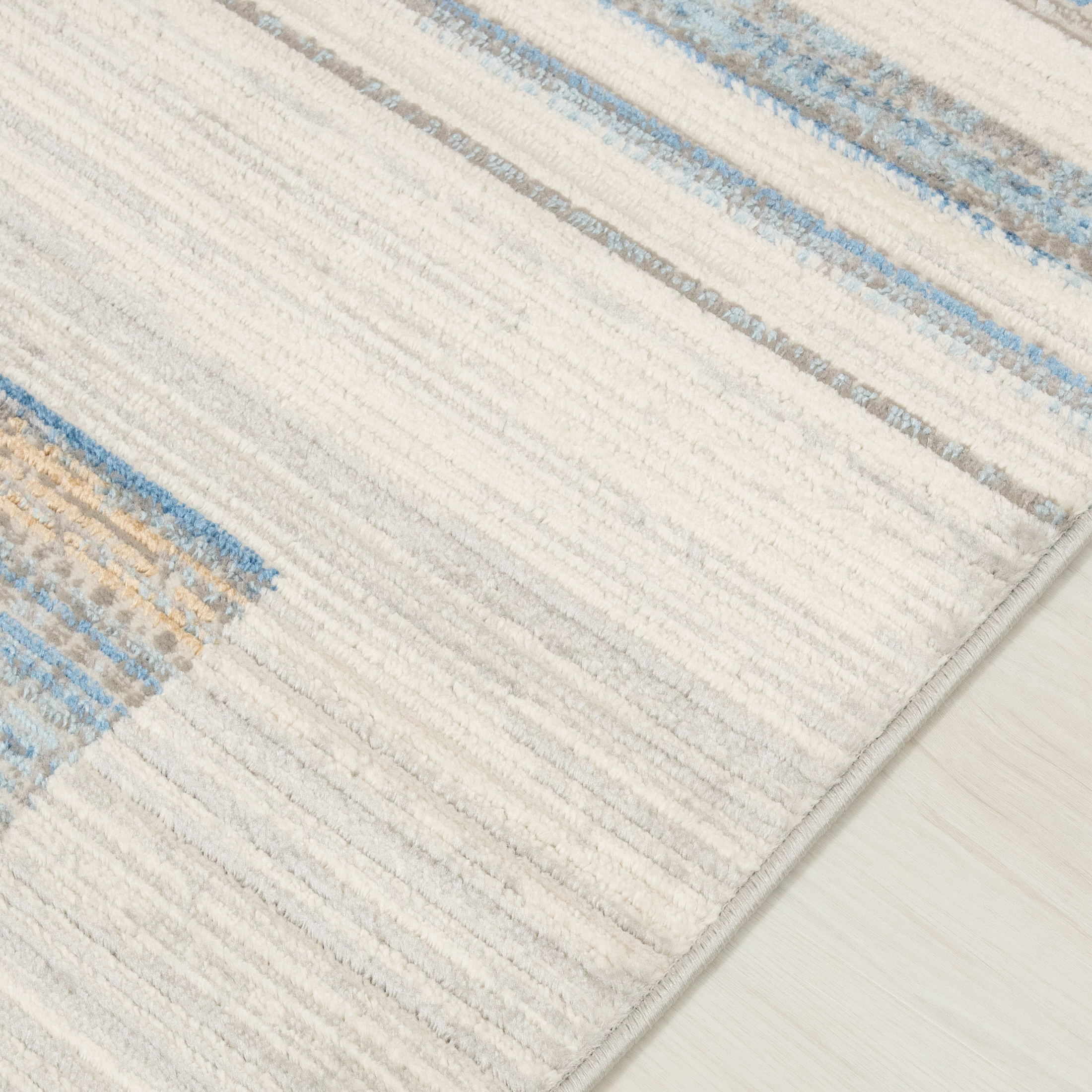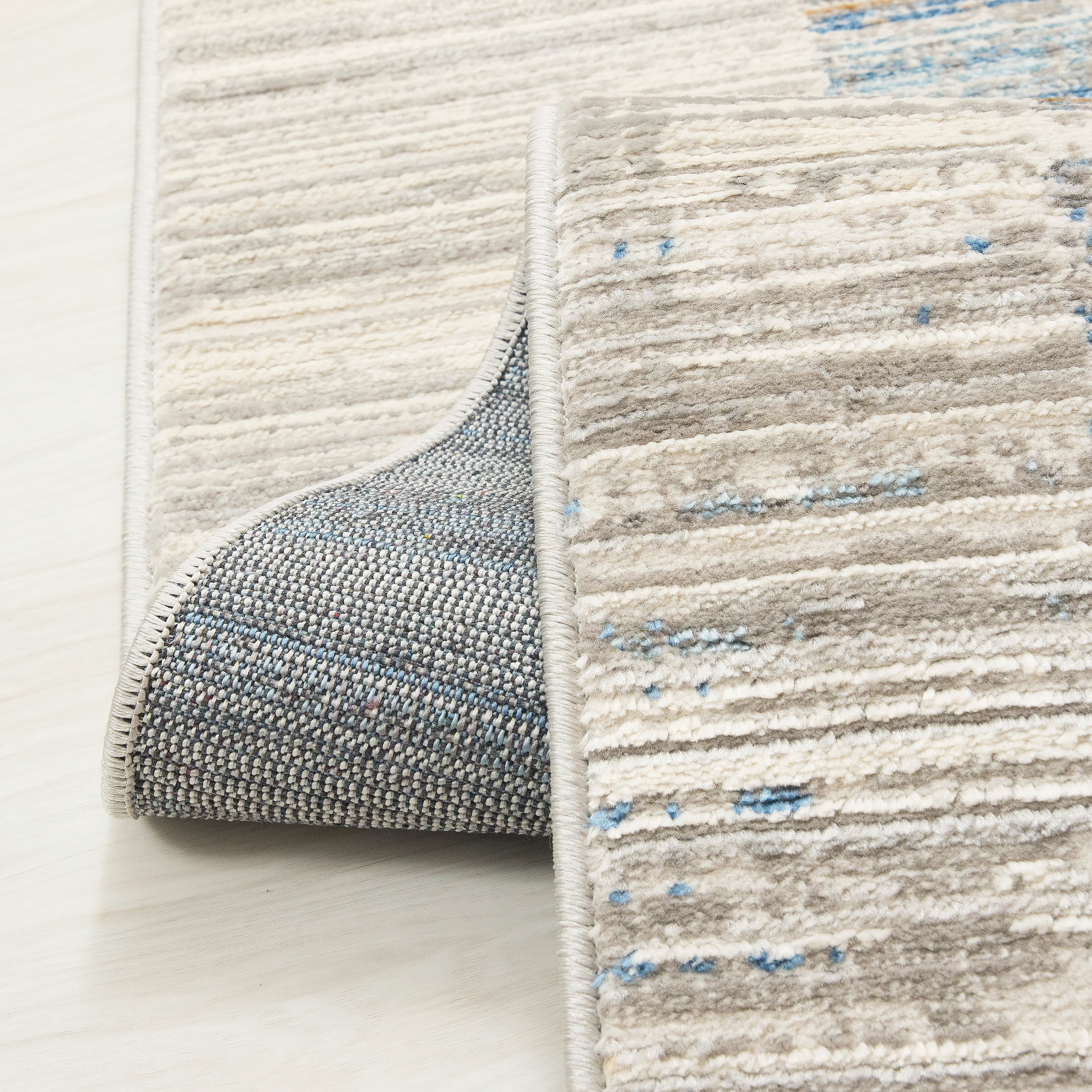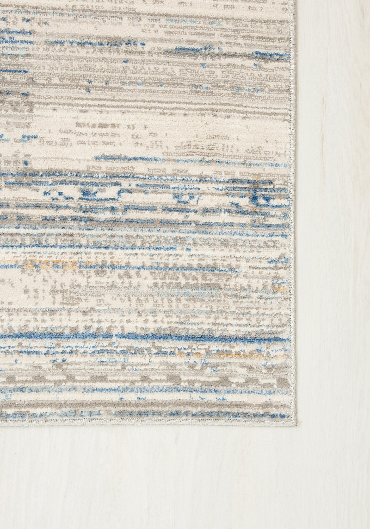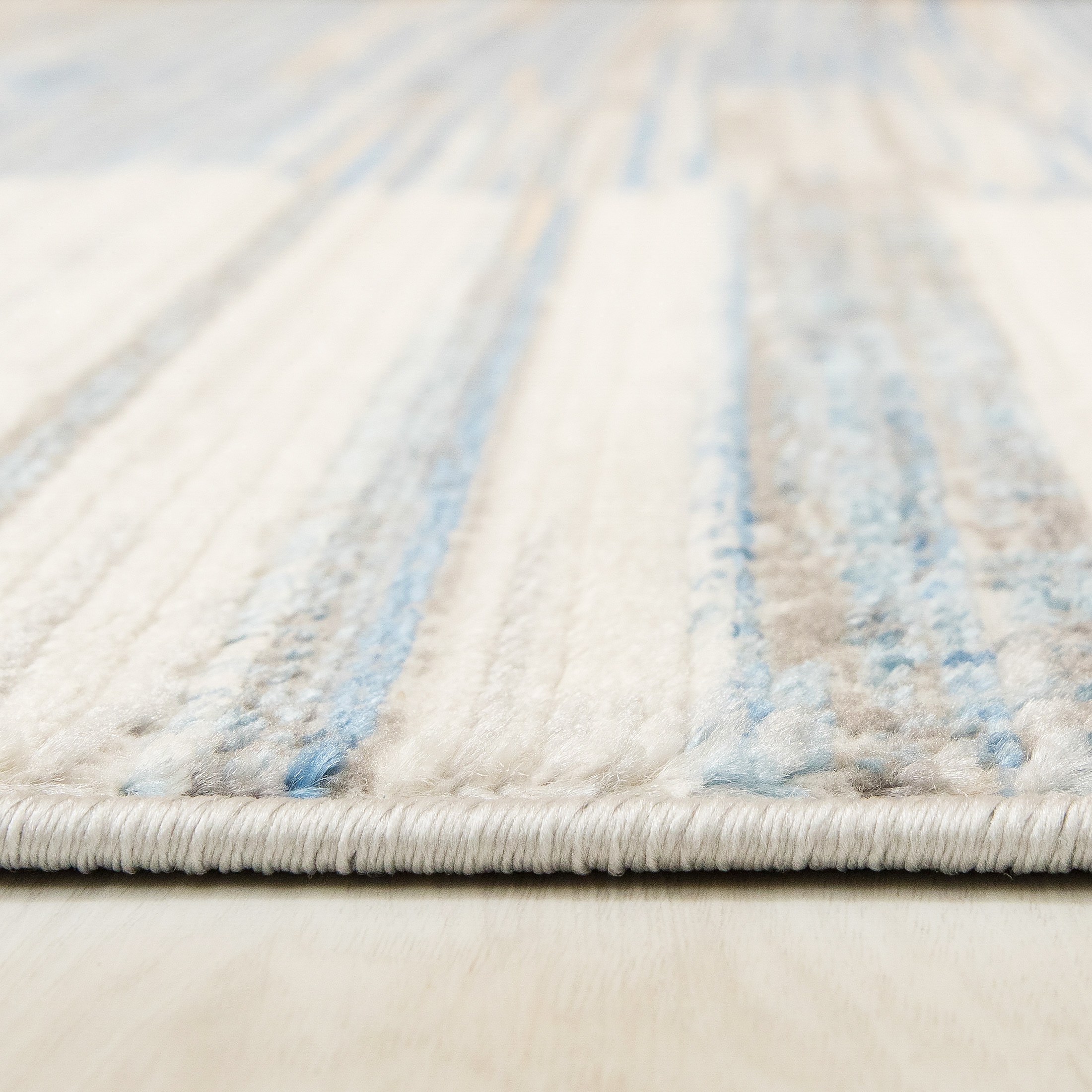 Dywan krótkowłosy wykonany z wysokiej jakości włókien syntetycznych. Dywan zdobi wzór z prostokątnych pól w odcieniach kremu, błękitu, szarości i beżu, tworzący nowoczesny, lekko przecierany efekt. Dywan jest elegancki, trwały i łatwy w utrzymaniu czystości.