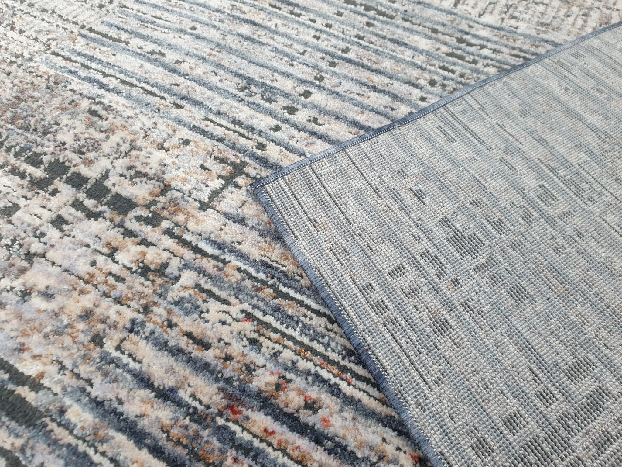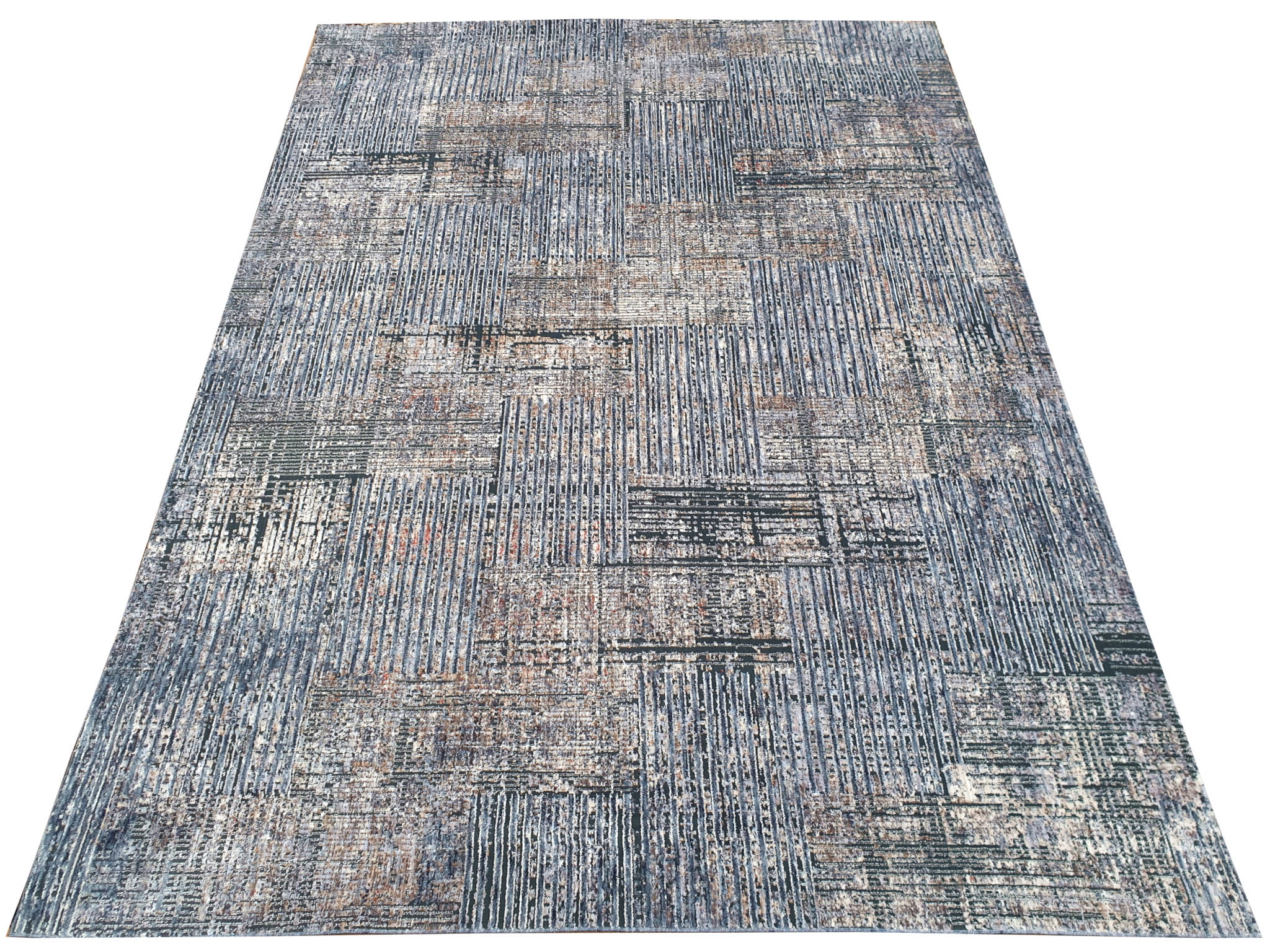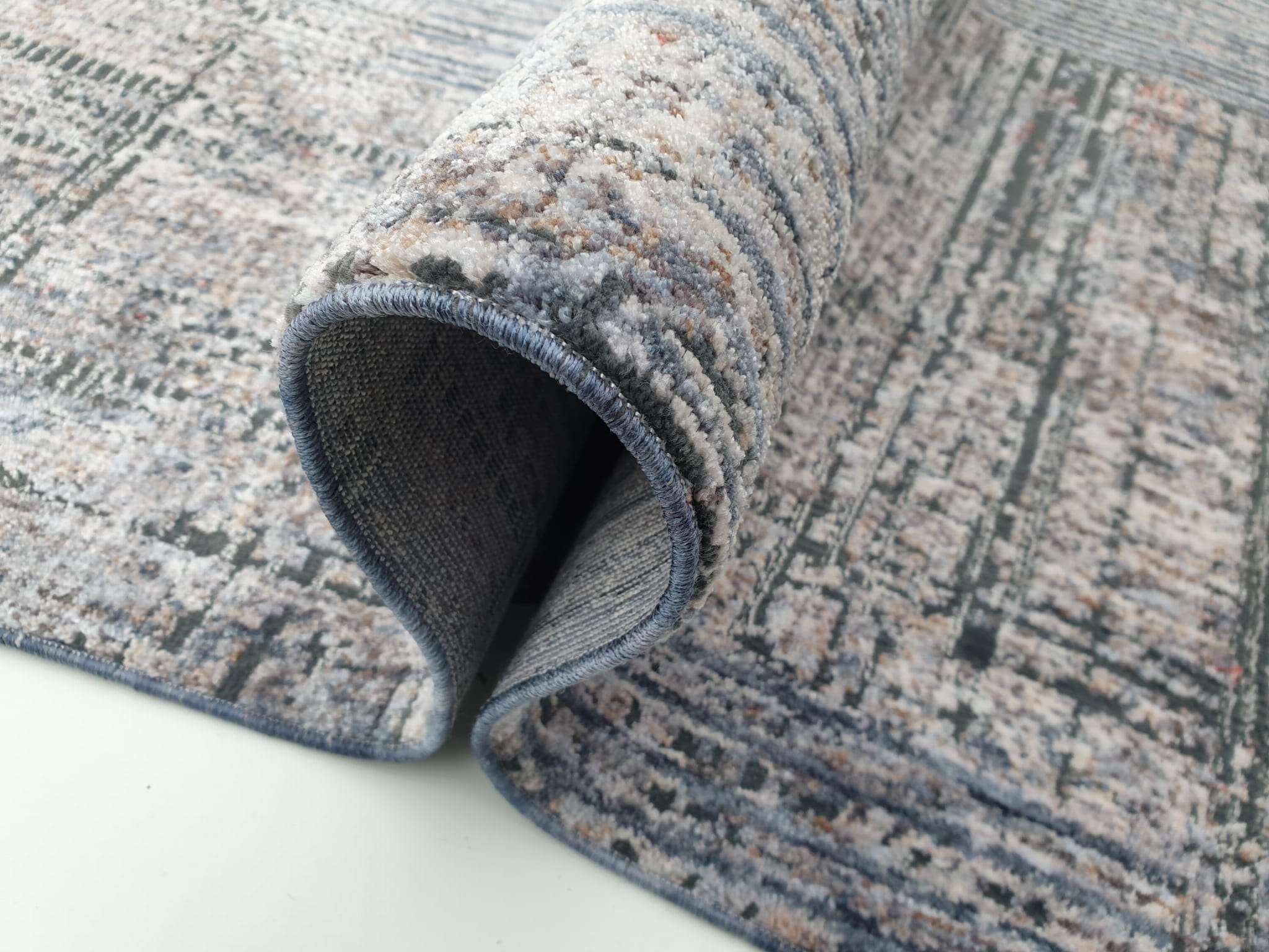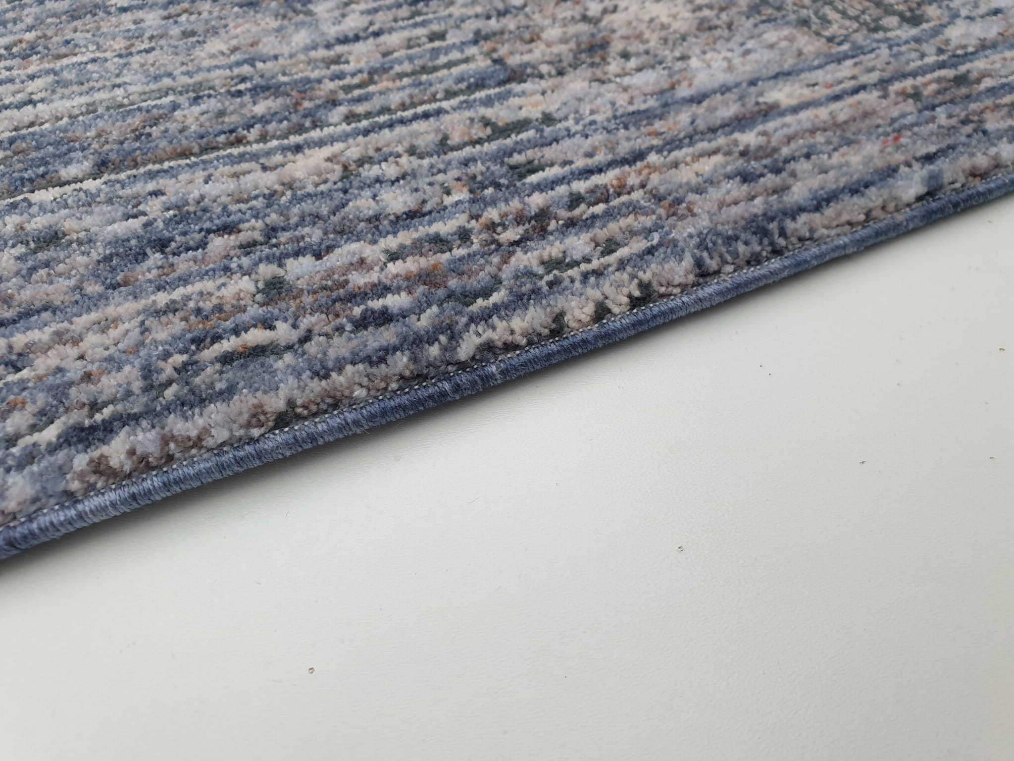 Dywan ten jest połączeniem nowoczesności ze stylem vintage. Ma przecierany wzór o wielobarwnej kolorystyce z wyraźnymi akcentami niebieskiego. Wyprodukowany z włókien syntetycznych, jest trwały i łatwy w utrzymaniu czystości.