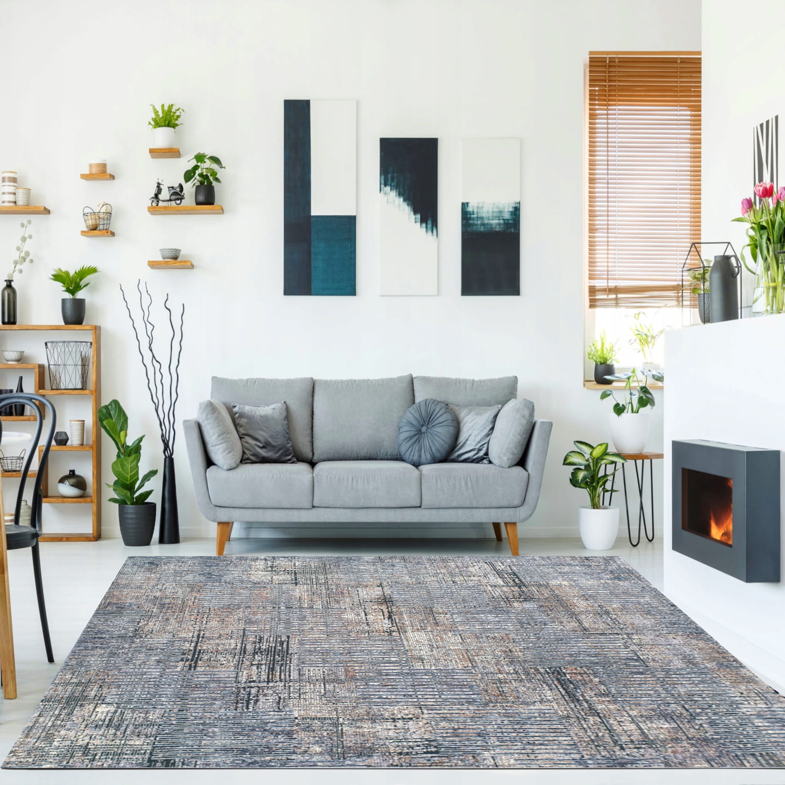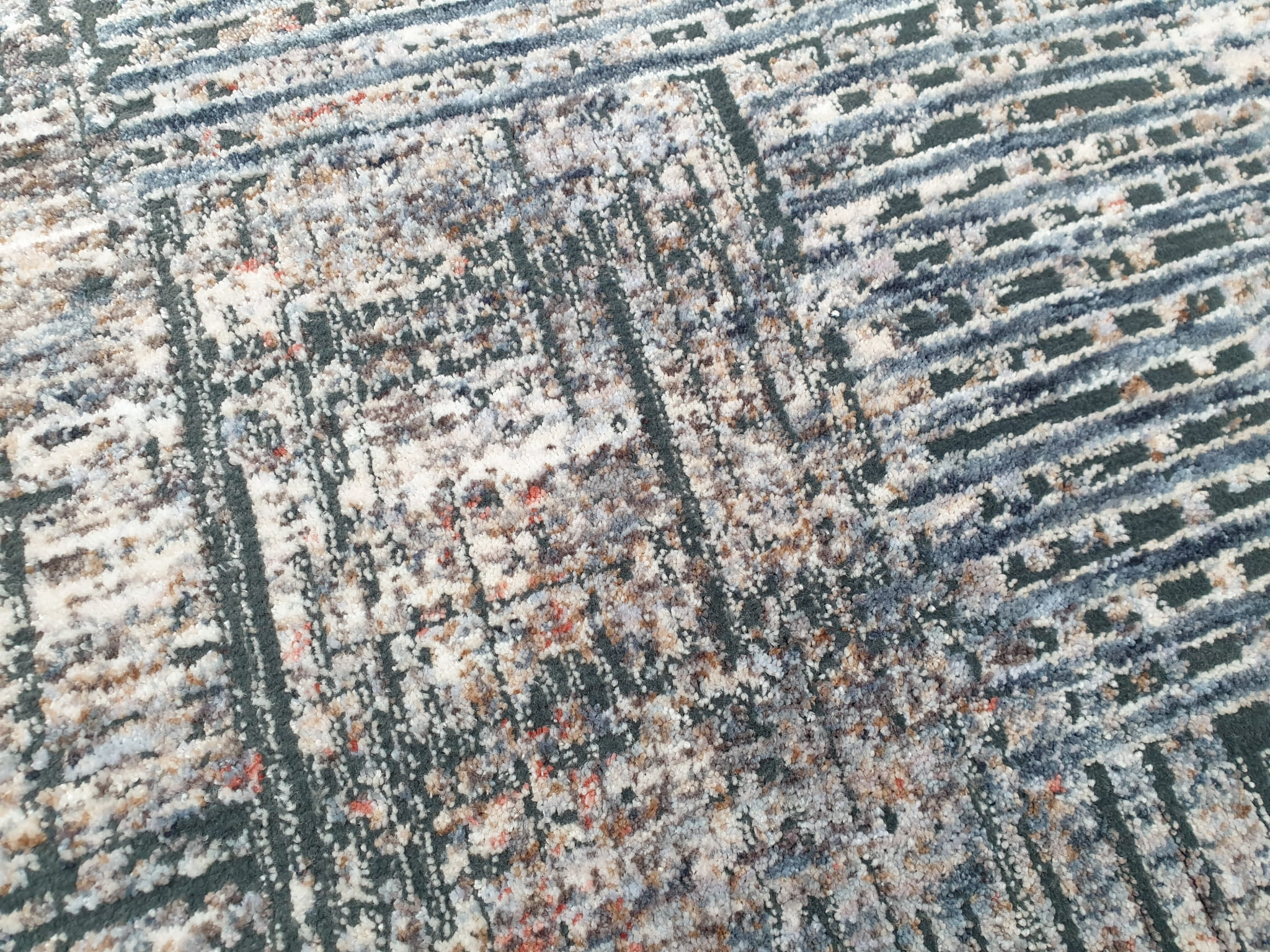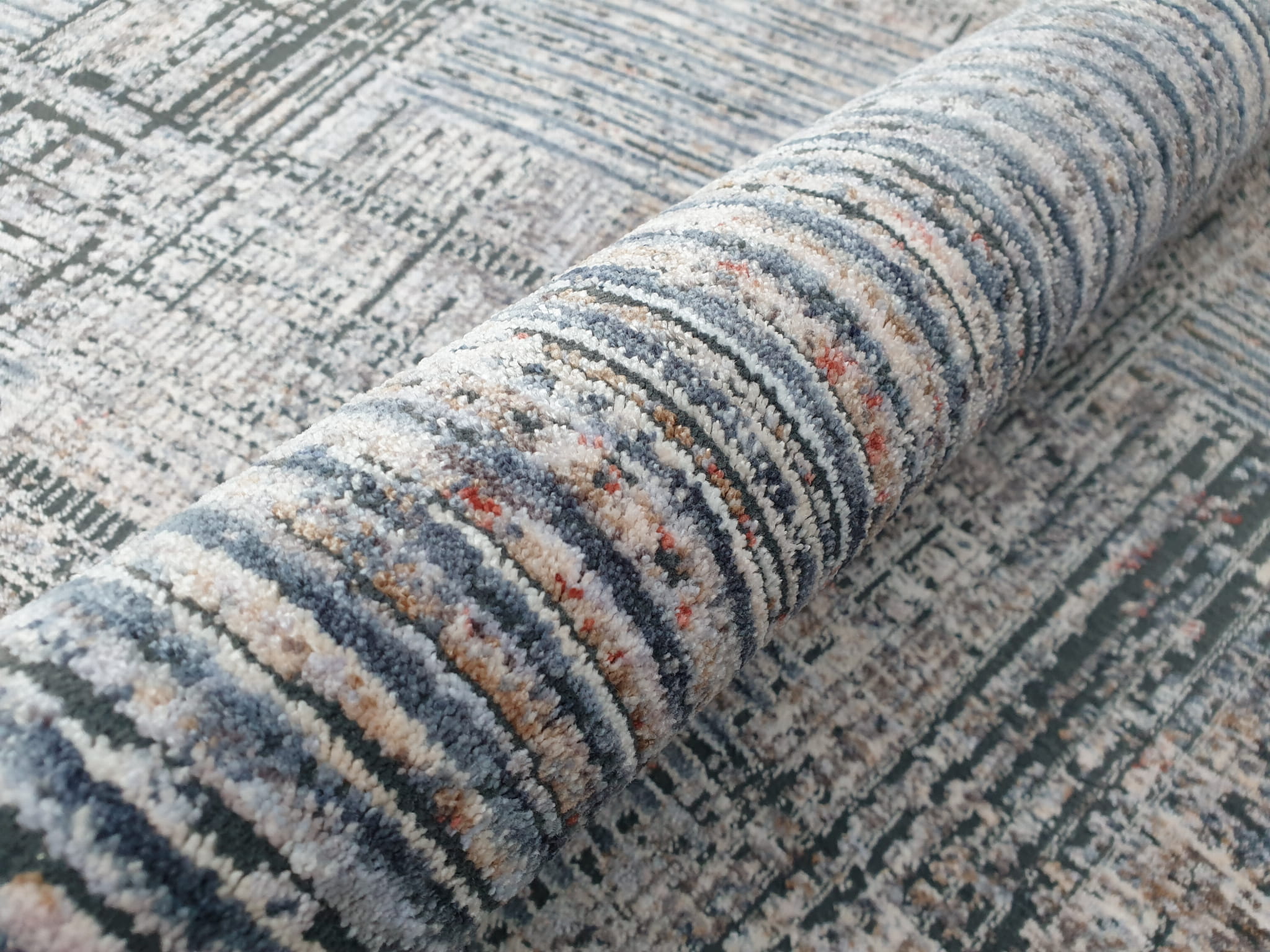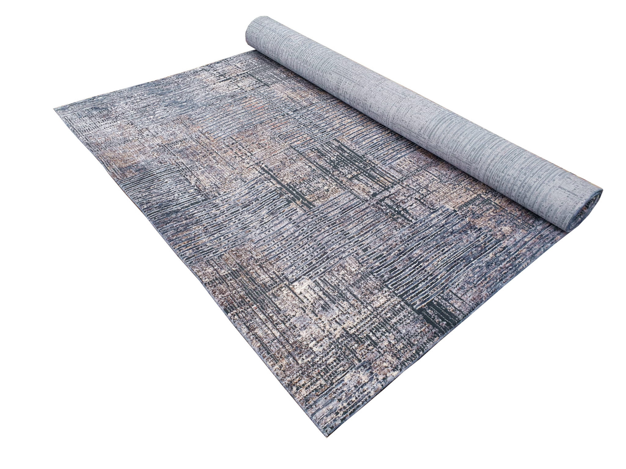 Dywan ten jest połączeniem nowoczesności ze stylem vintage. Ma przecierany wzór o wielobarwnej kolorystyce z wyraźnymi akcentami niebieskiego. Wyprodukowany z włókien syntetycznych, jest trwały i łatwy w utrzymaniu czystości.