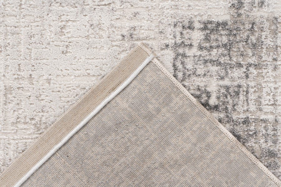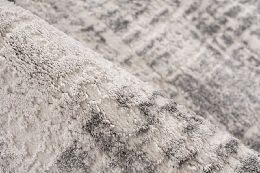 Miękki syntetyczny dywan z dodatkiem kurczliwego poliestru, tworzącego efekt 3D. Wysoka gęstość runa i przecierany wzór nadają mu nowoczesny charakter. Trwały, ze spodem z naturalnej juty.