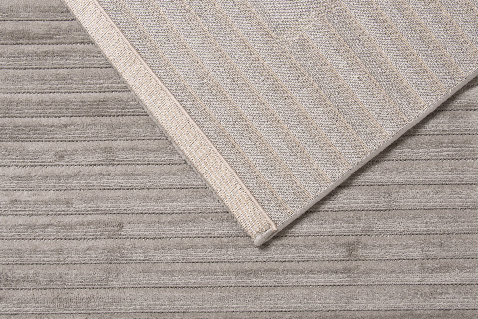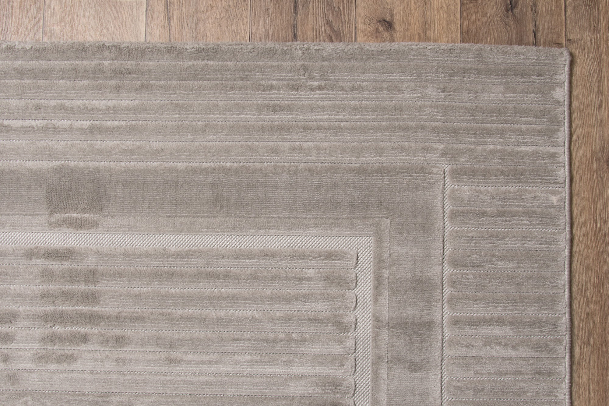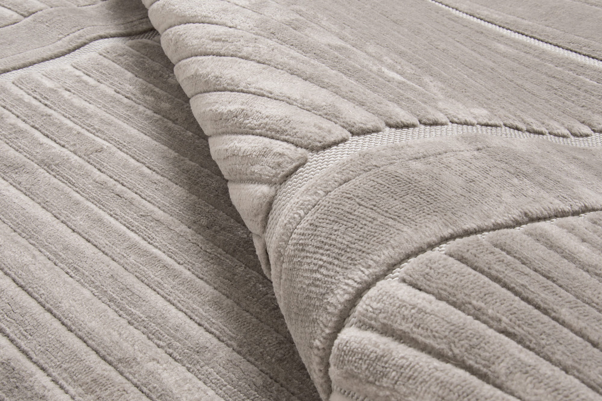 Dywan o miękkim włosiu z subtelnym szarym odcieniem. Runo z nowoczesnym, geometrycznym wzorem wyróżnia się różnymi wysokościami włosa, co nadaje mu efekt trójwymiarowości i głębi.