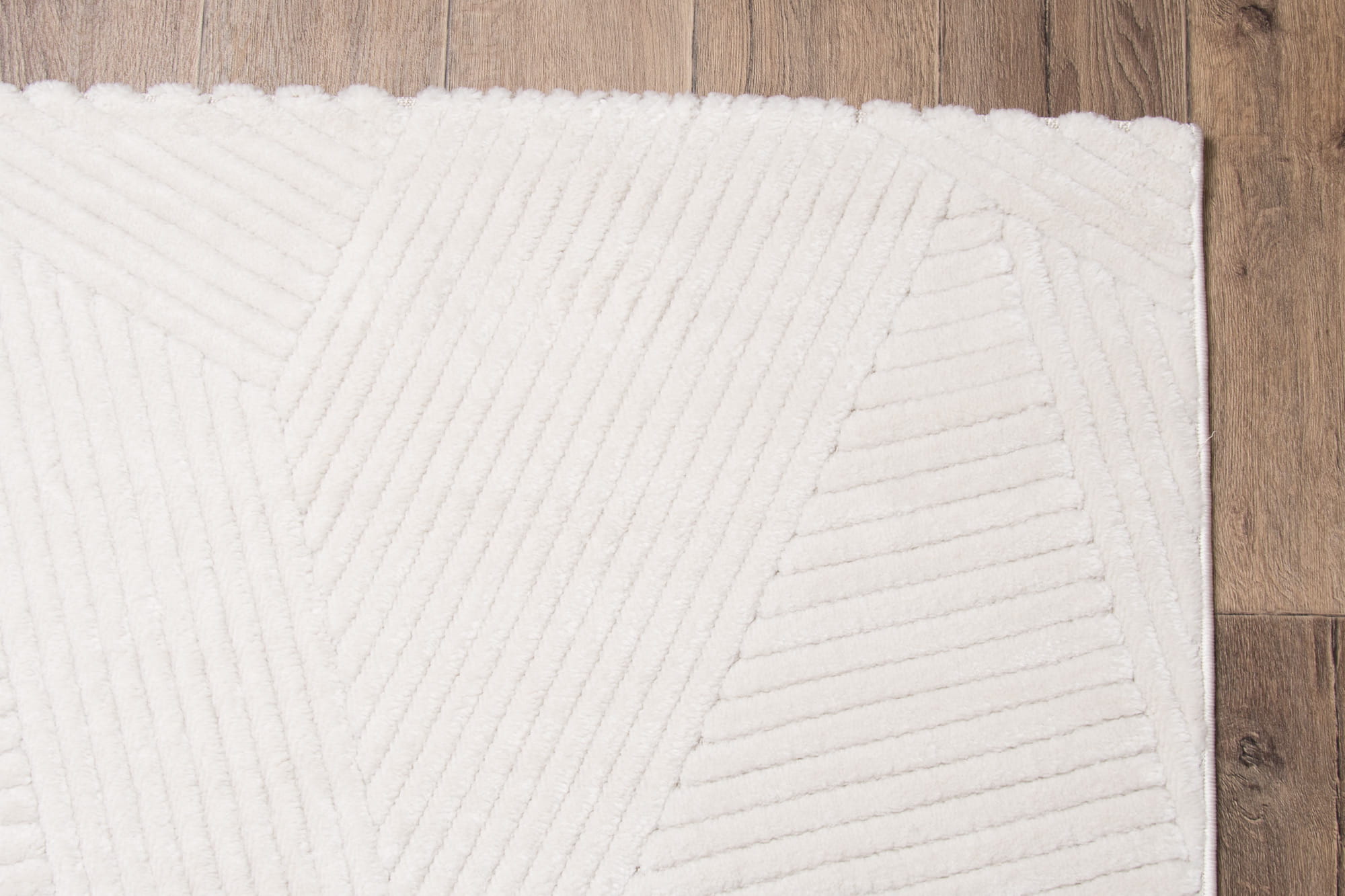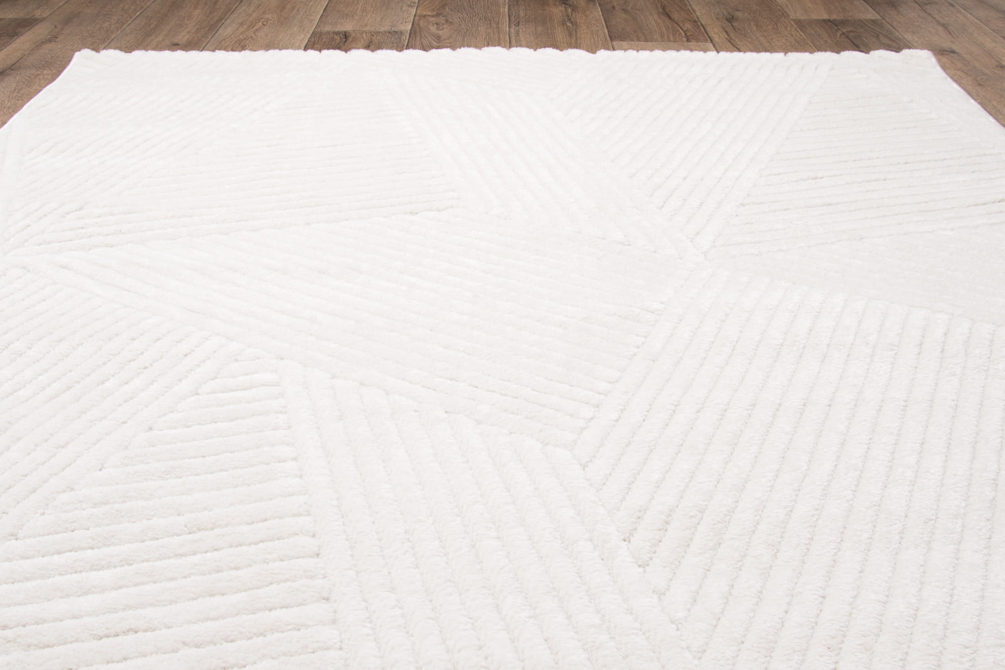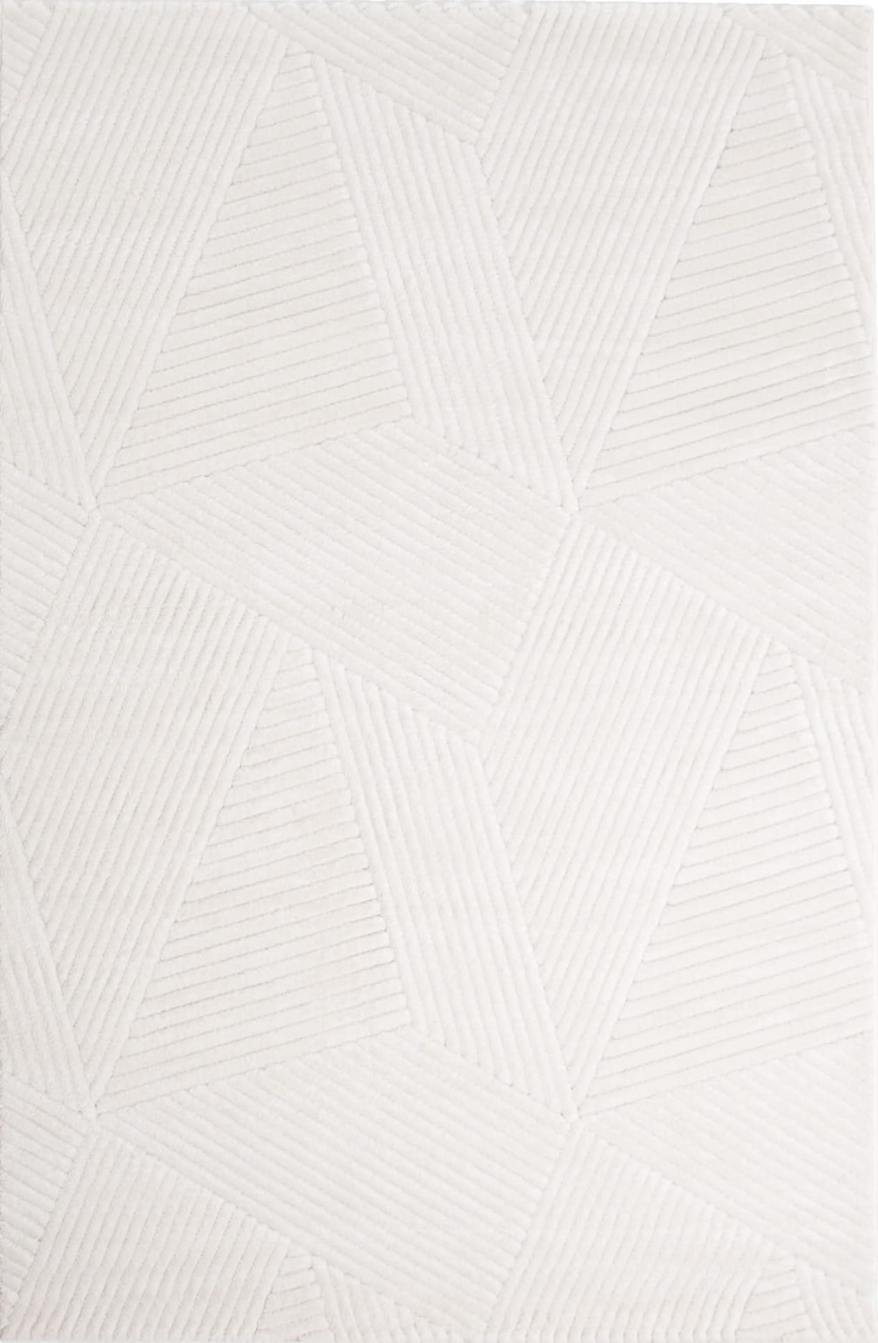 Dywan o miękkim włosiu z subtelnym kremowym odcieniem. Runo z nowoczesnym, geometrycznym wzorem wyróżnia się różnymi wysokościami włosa, co nadaje mu efekt trójwymiarowości i głębi.