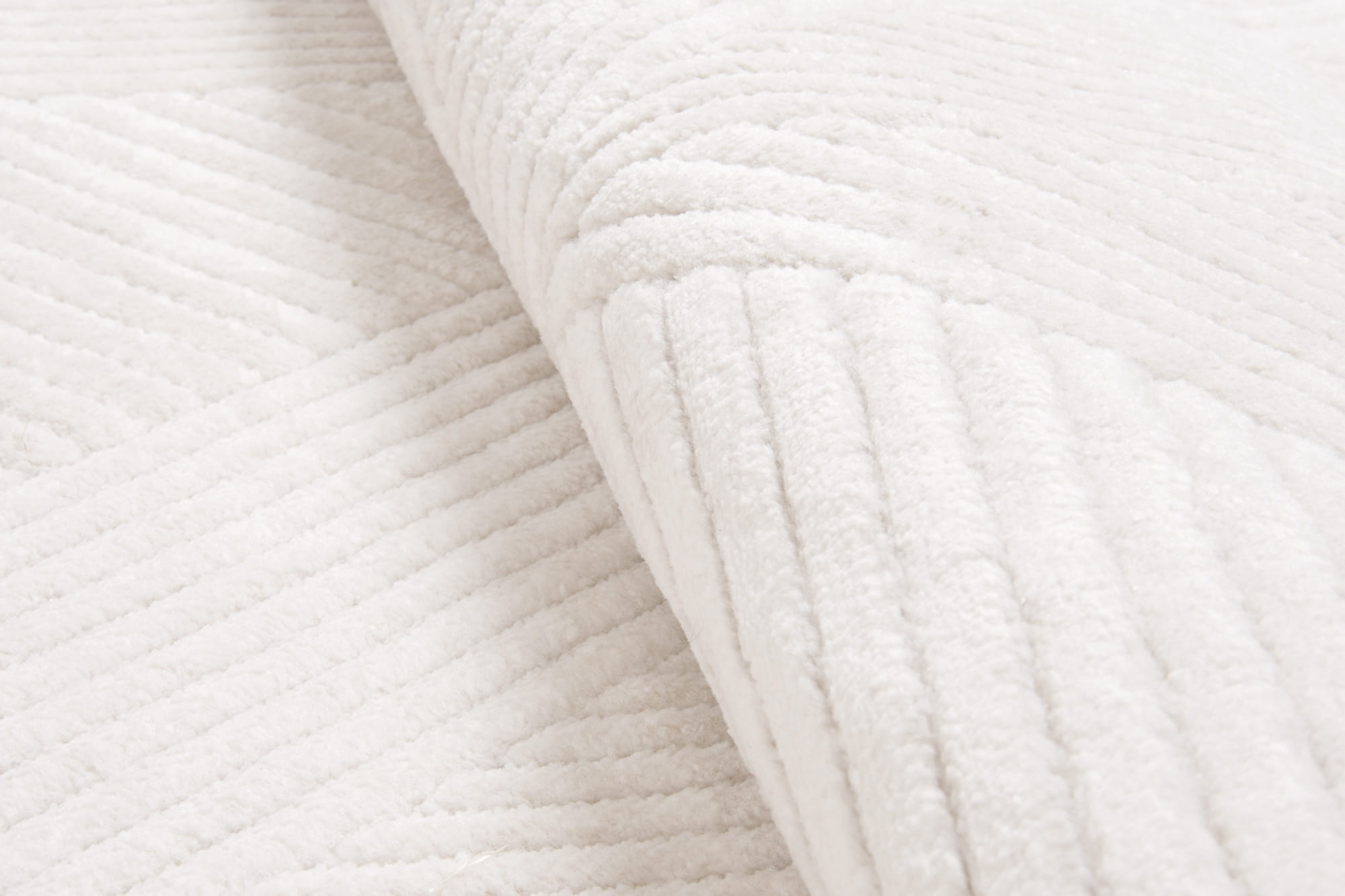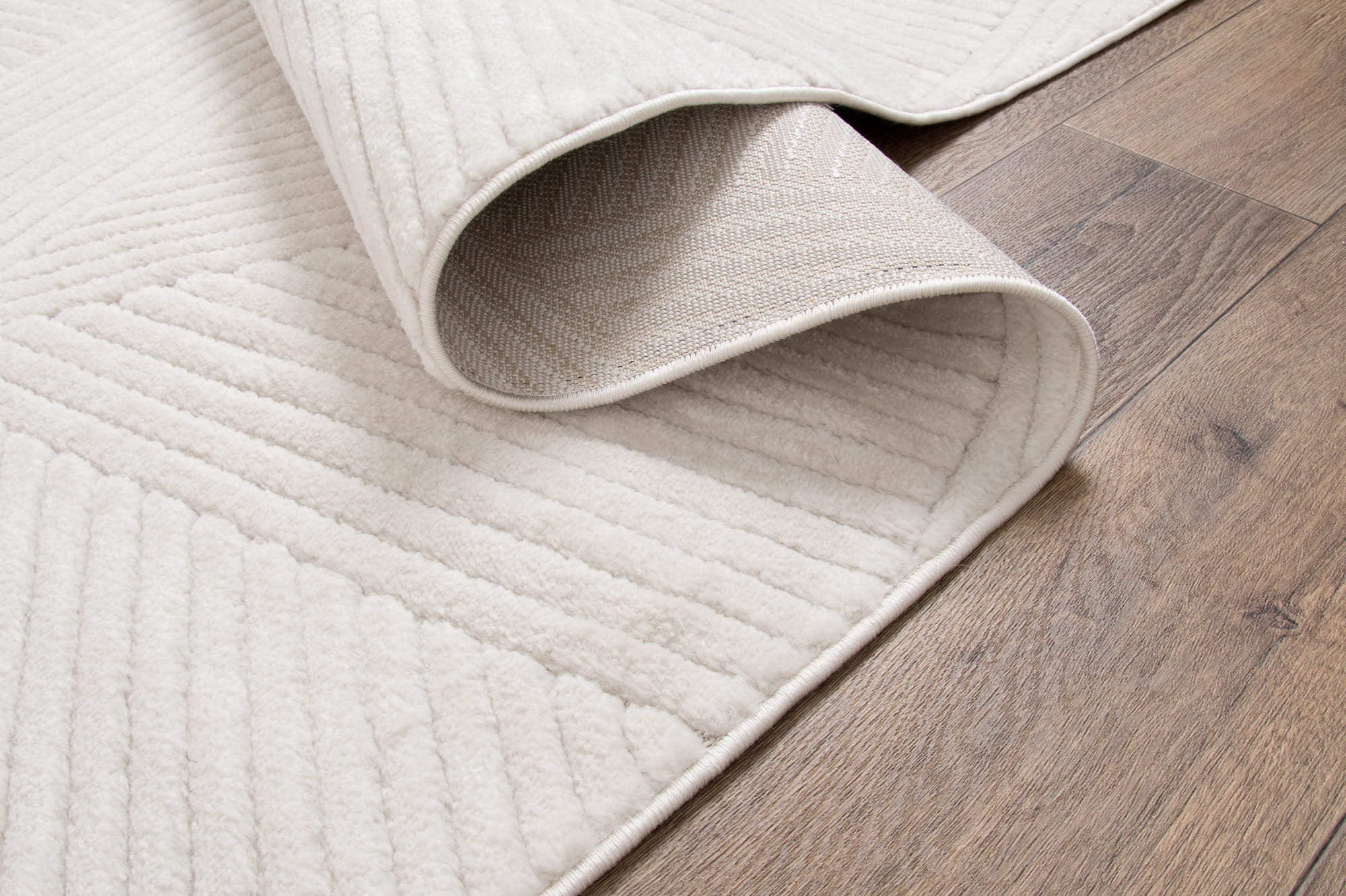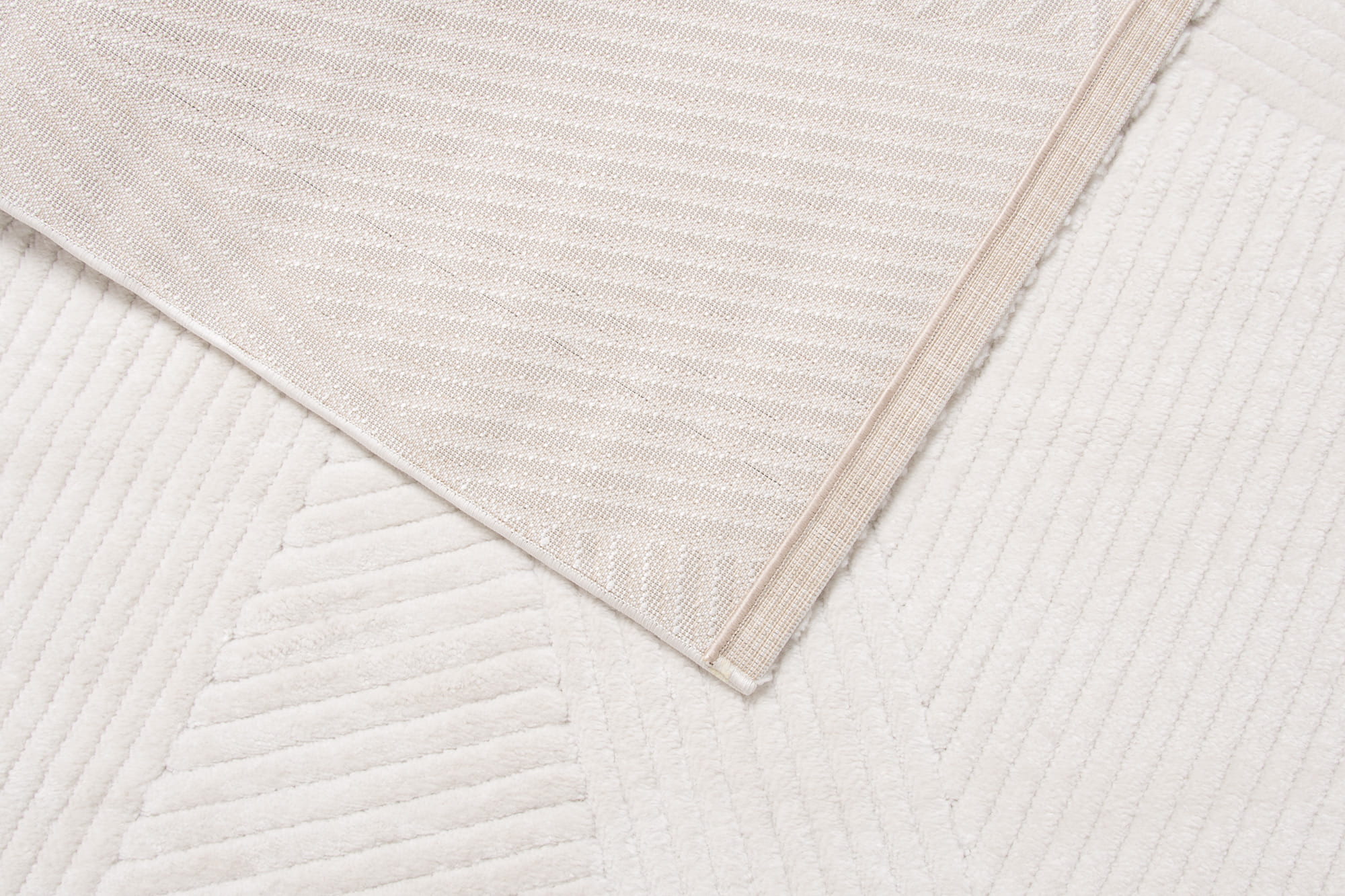 Dywan o miękkim włosiu z subtelnym kremowym odcieniem. Runo z nowoczesnym, geometrycznym wzorem wyróżnia się różnymi wysokościami włosa, co nadaje mu efekt trójwymiarowości i głębi.