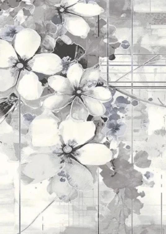 Dywan ozdobiony jest dużymi, rozmytymi kwiatami w odcieniach szarości. Wzór łączy motywy florystyczne z subtelnymi geometrycznymi liniami, tworząc nowoczesną i elegancką kompozycję. Dzięki odporności na zabrudzenia i łatwości w czyszczeniu, doskonale sprawdzi się w codziennym użytkowaniu.
