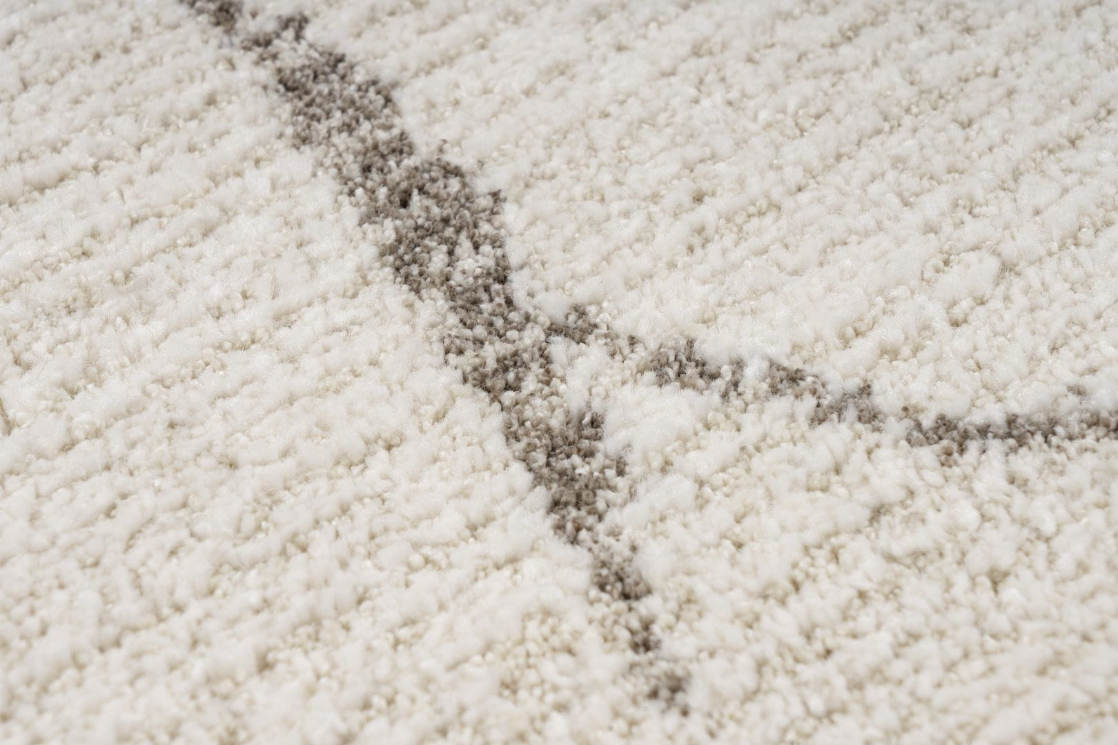 Komfortowy, trwały dywan o gęstym i miękkim runie w kremowych odcieniach, zdobiony subtelnymi, przestrzennymi wzorami. Jego elegancki design i przyjemna faktura dodają wnętrzu ciepła i stylu.