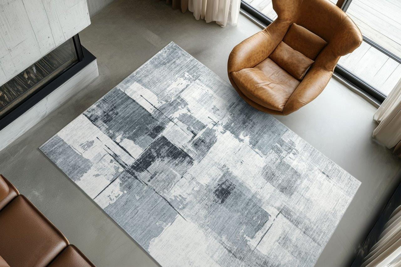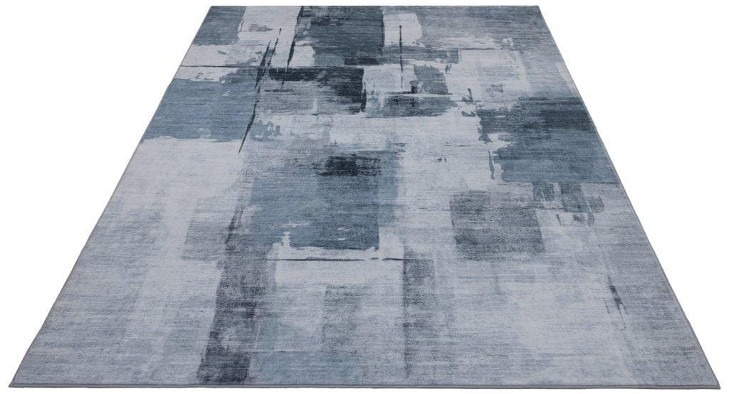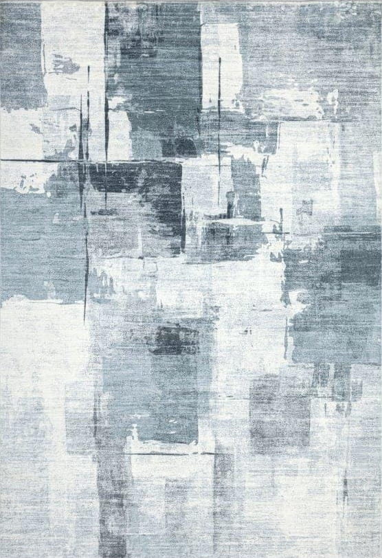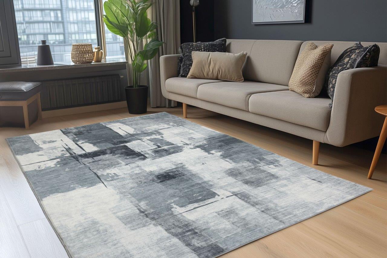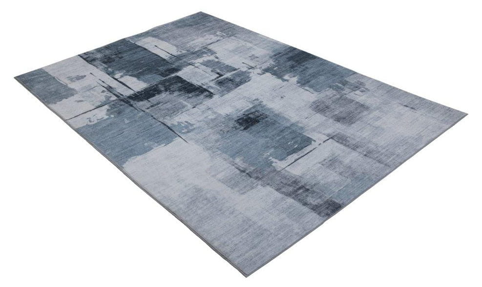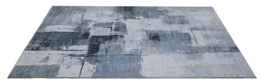 Dywan ma nowoczesny, geometryczny wzór z nieregularnymi prostokątami, a cała kompozycja przypomina abstrakcyjny obraz. Dodatkowe przetarcia nadają mu efekt postarzenia, podkreślając jego unikalny charakter, a miękka i przyjemna w dotyku powierzchnia zapewnia komfort użytkowania.