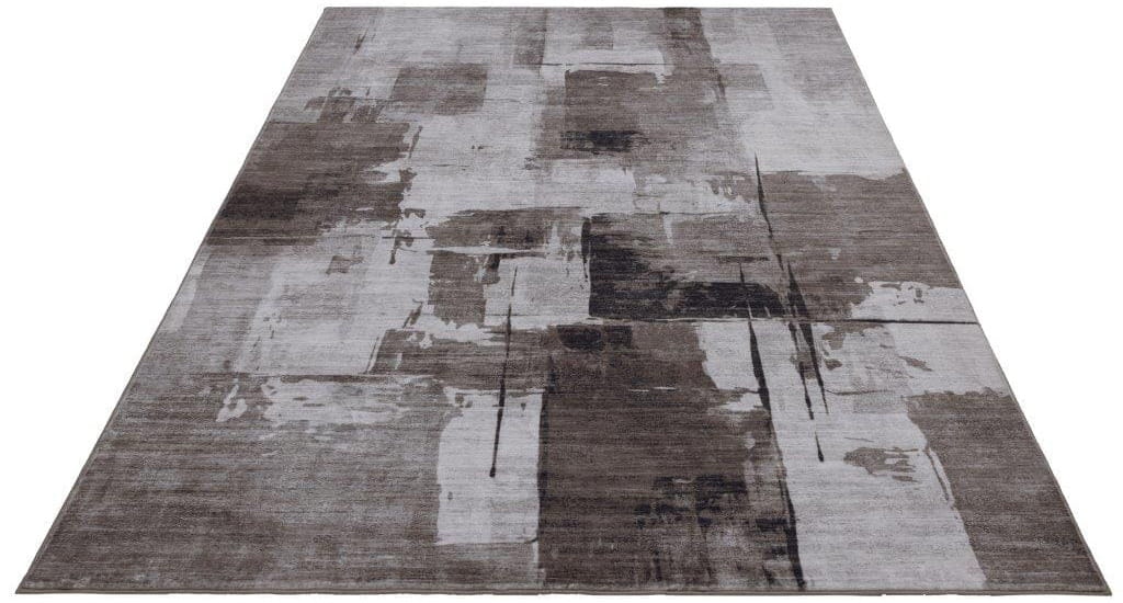 Dywan ma nowoczesny, geometryczny wzór z nieregularnymi prostokątami, a cała kompozycja przypomina abstrakcyjny obraz. Dodatkowe przetarcia nadają mu efekt postarzenia, podkreślając jego unikalny charakter, a miękka i przyjemna w dotyku powierzchnia zapewnia komfort użytkowania.