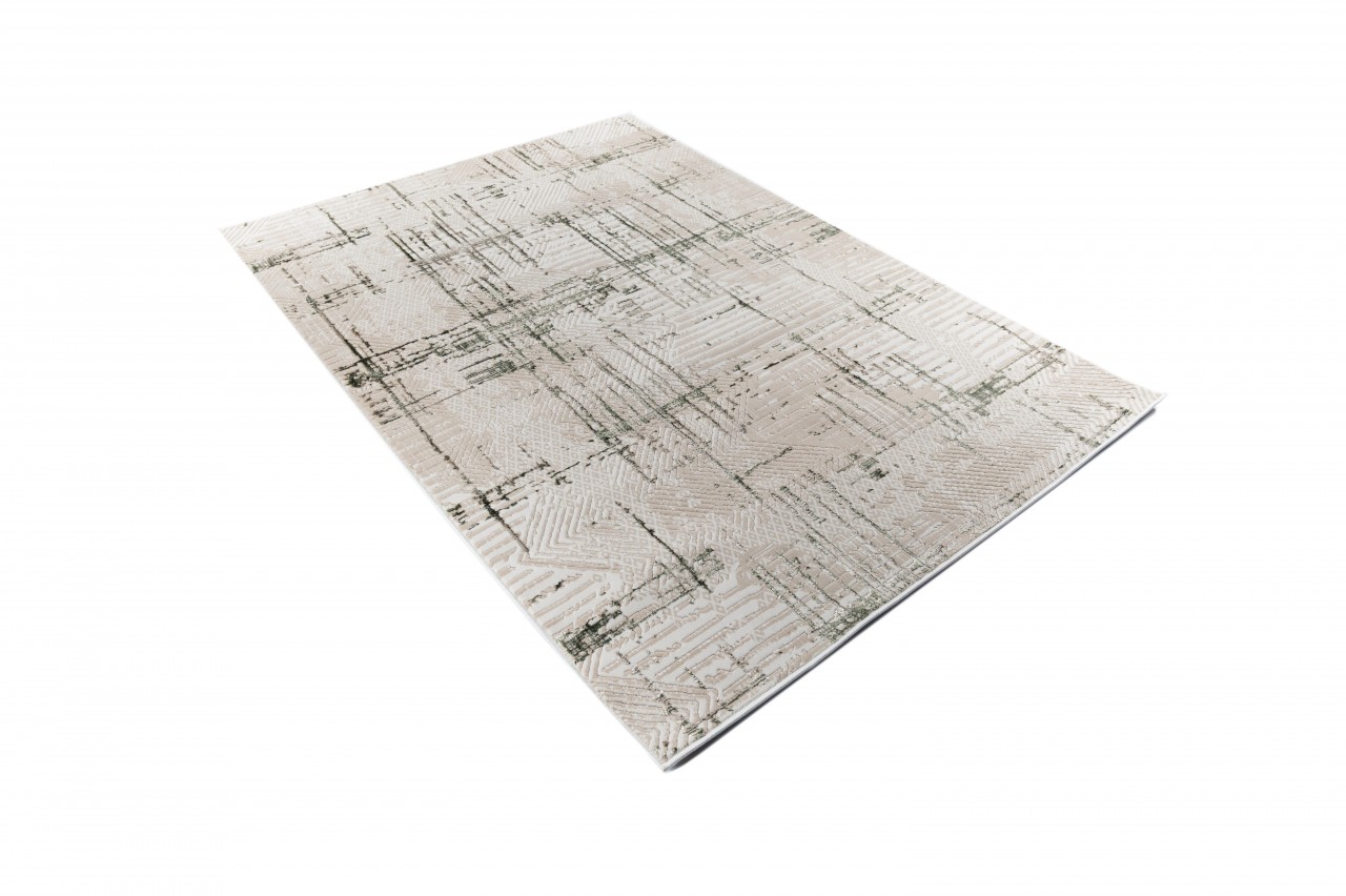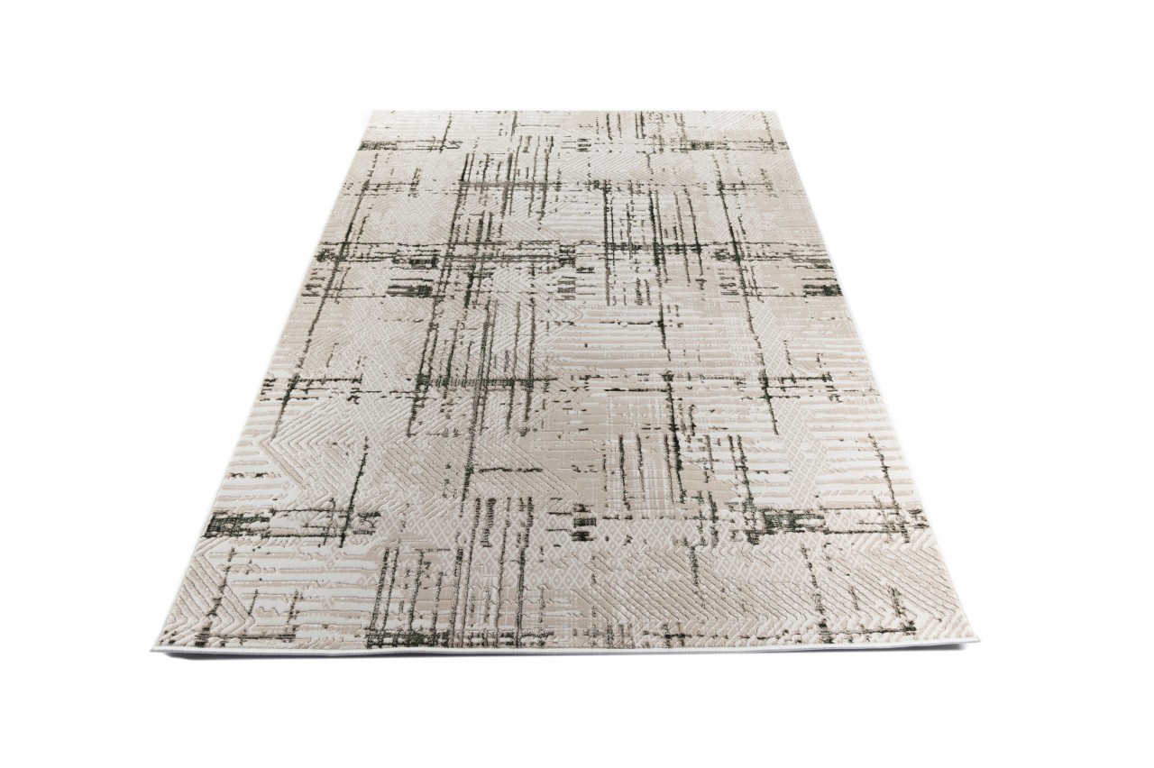 Dywan jest trwały i łatwy w utrzymaniu czystości, wykonany z wysokiej jakości włókien syntetycznych. Dywan ma nowoczesny wzór z przecinających się linii i geometrycznych kształtów w odcieniach beżu i brązu, nadający wnętrzu elegancki, stylowy charakter.