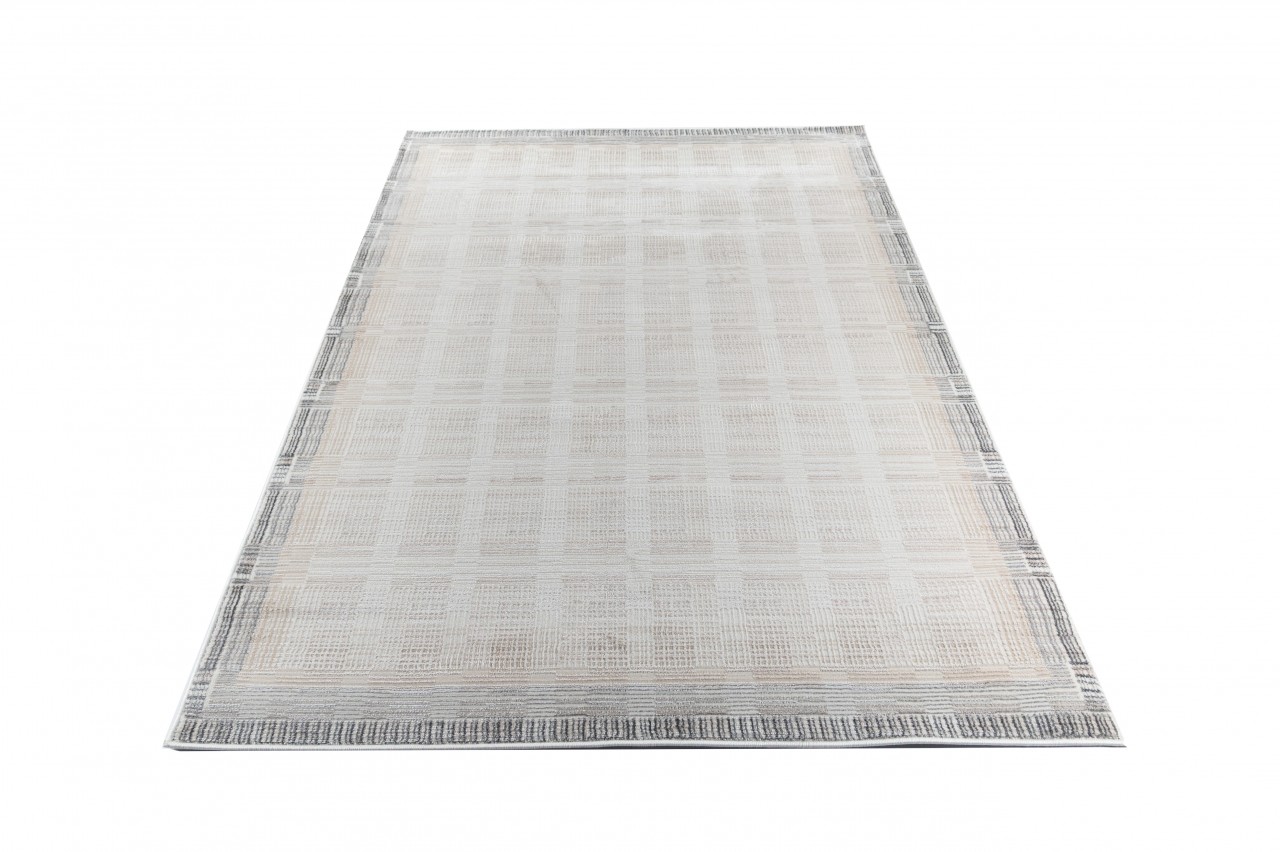 Dywan o dwupoziomowej strukturze ma delikatny geometryczny wzór w formie regularnej kratki w kremowo-beżowej tonacji, z subtelnym cieniowaniem i wyraźniejszą ramką w odcieniach szarości i beżu. Wykonany z wysokiej jakości włókien syntetycznych, jest trwały, odporny na odkształcenia i łatwy w czyszczeniu.