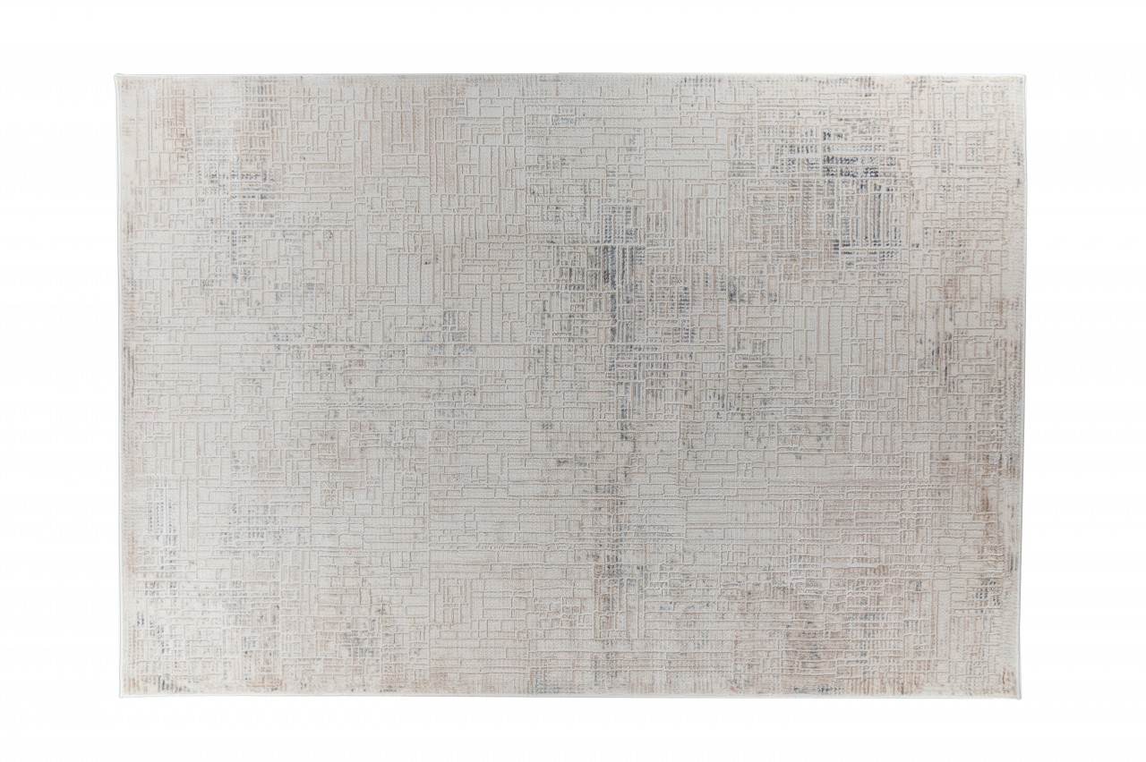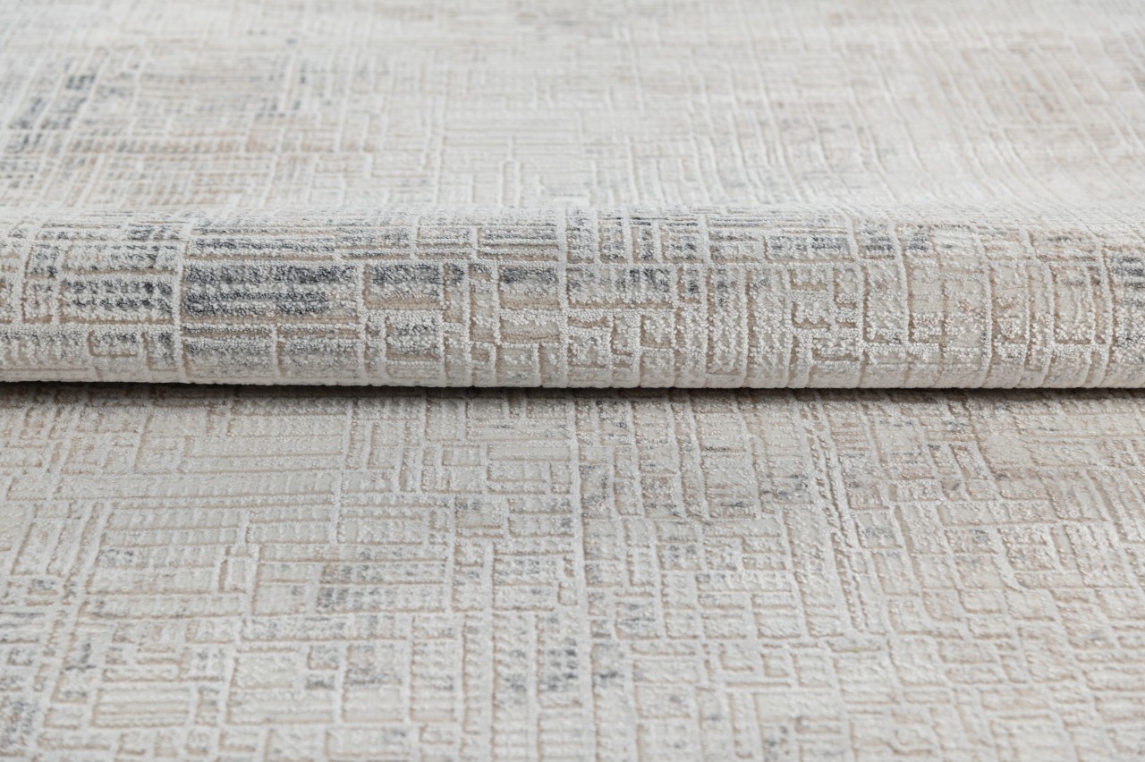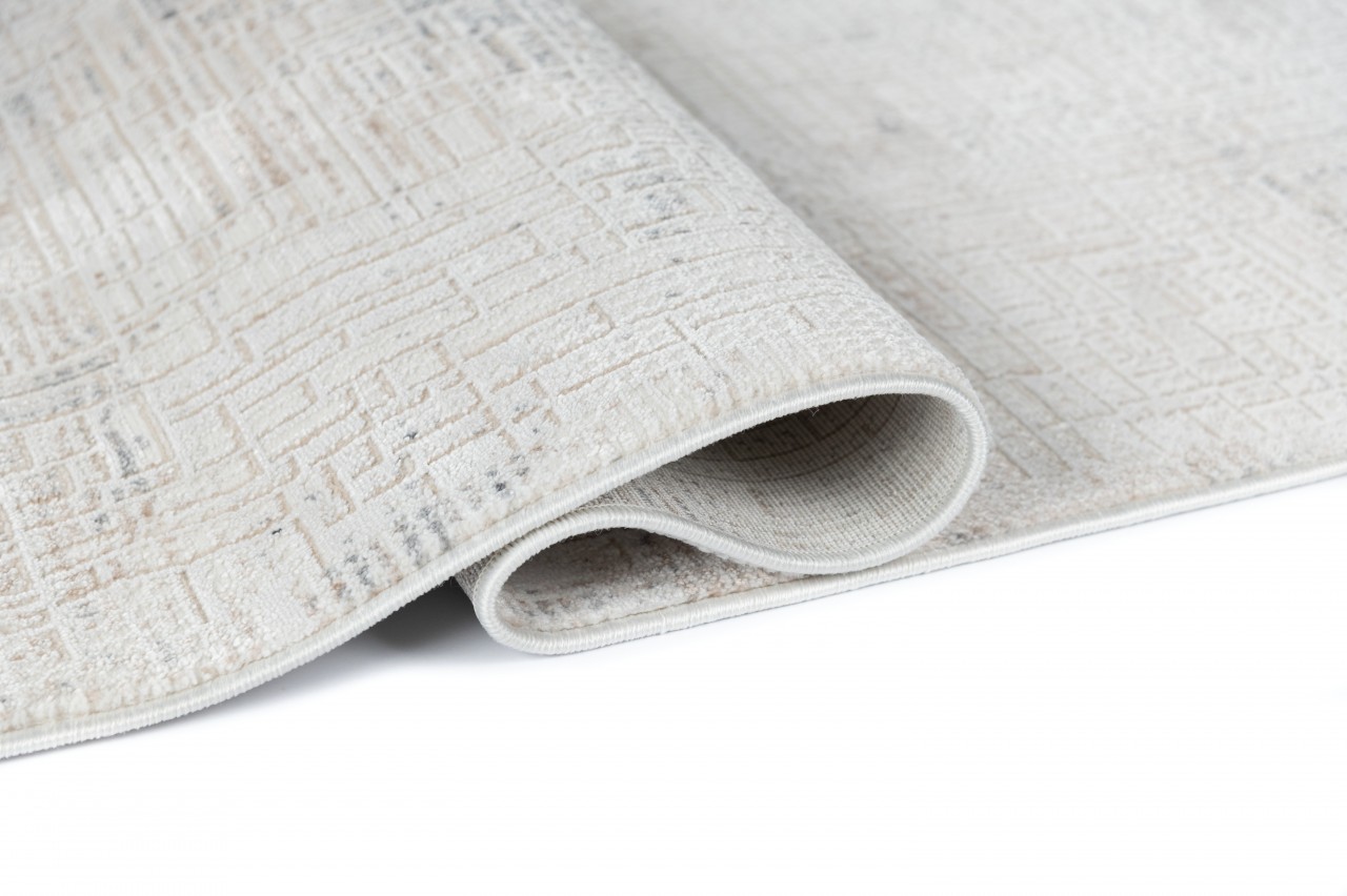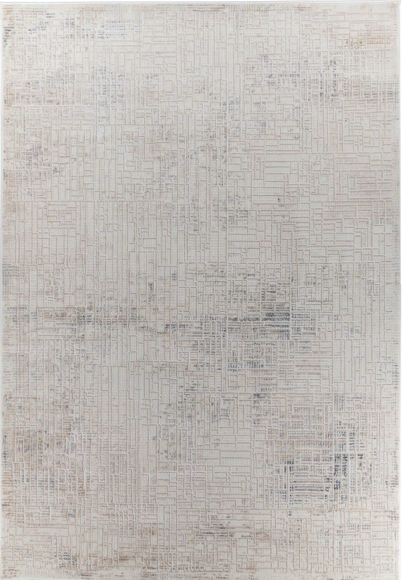 Dywan w tonacji beżu i szarości o dwupoziomowej strukturze, zdobiony geometrycznym wzorem z nieregularnych prostokątów rozmieszczonych na całej powierzchni. Wykonany z wysokiej jakości włókien syntetycznych, cechuje się trwałością, odpornością na odkształcenia oraz łatwością w utrzymaniu czystości.