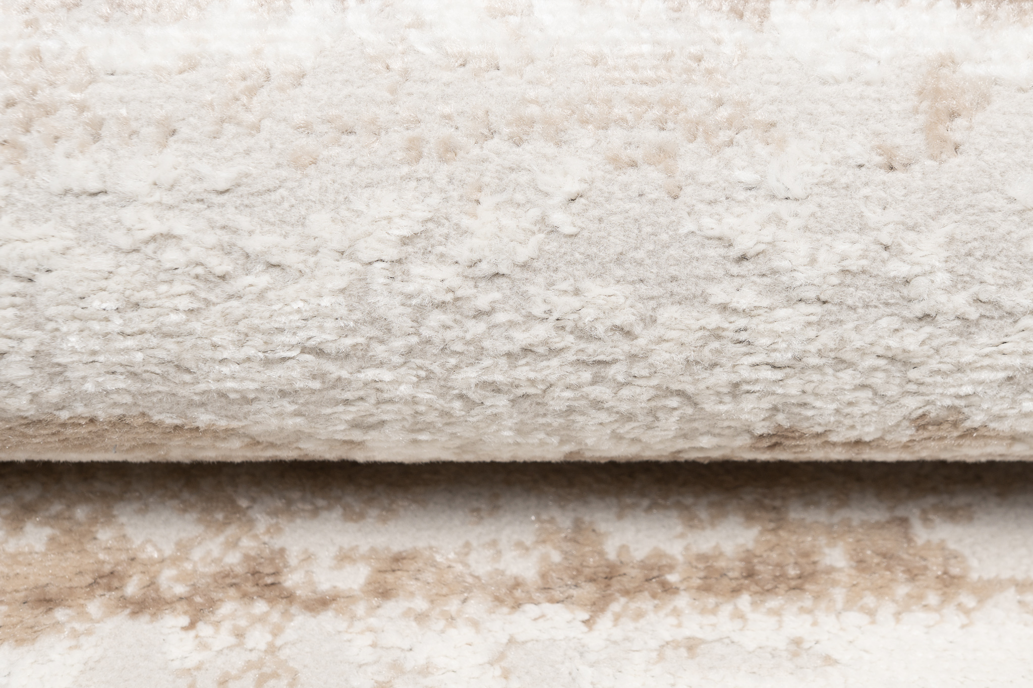 Dywan krótkowłosy wykonany z wysokiej jakości włókien syntetycznych. Utrzymany w kremowo-beżowej tonacji z subtelnym, przetartym wzorem w odcieniach jasnego brązu i piasku. Elegancki, trwały i łatwy w utrzymaniu czystości.