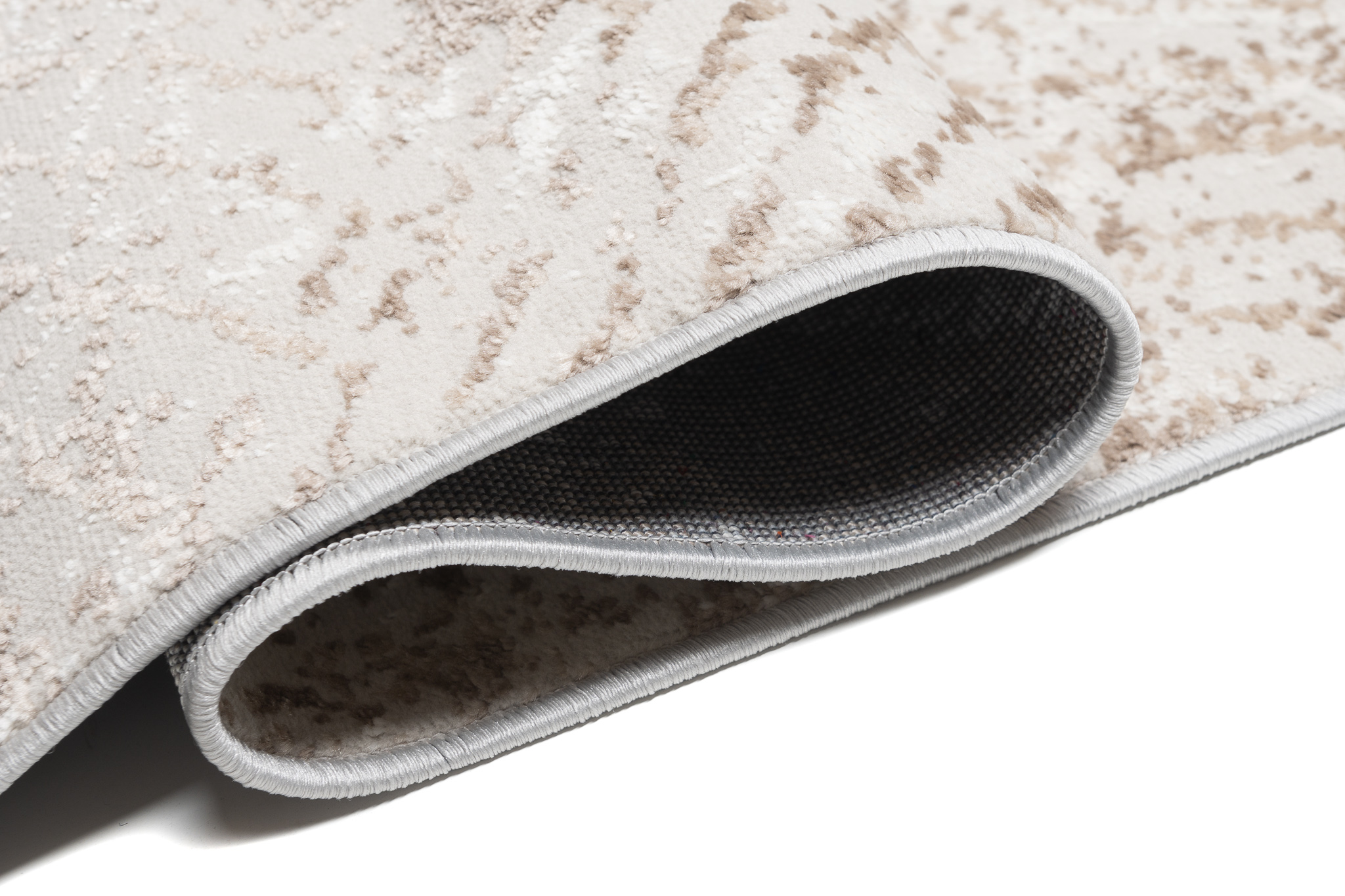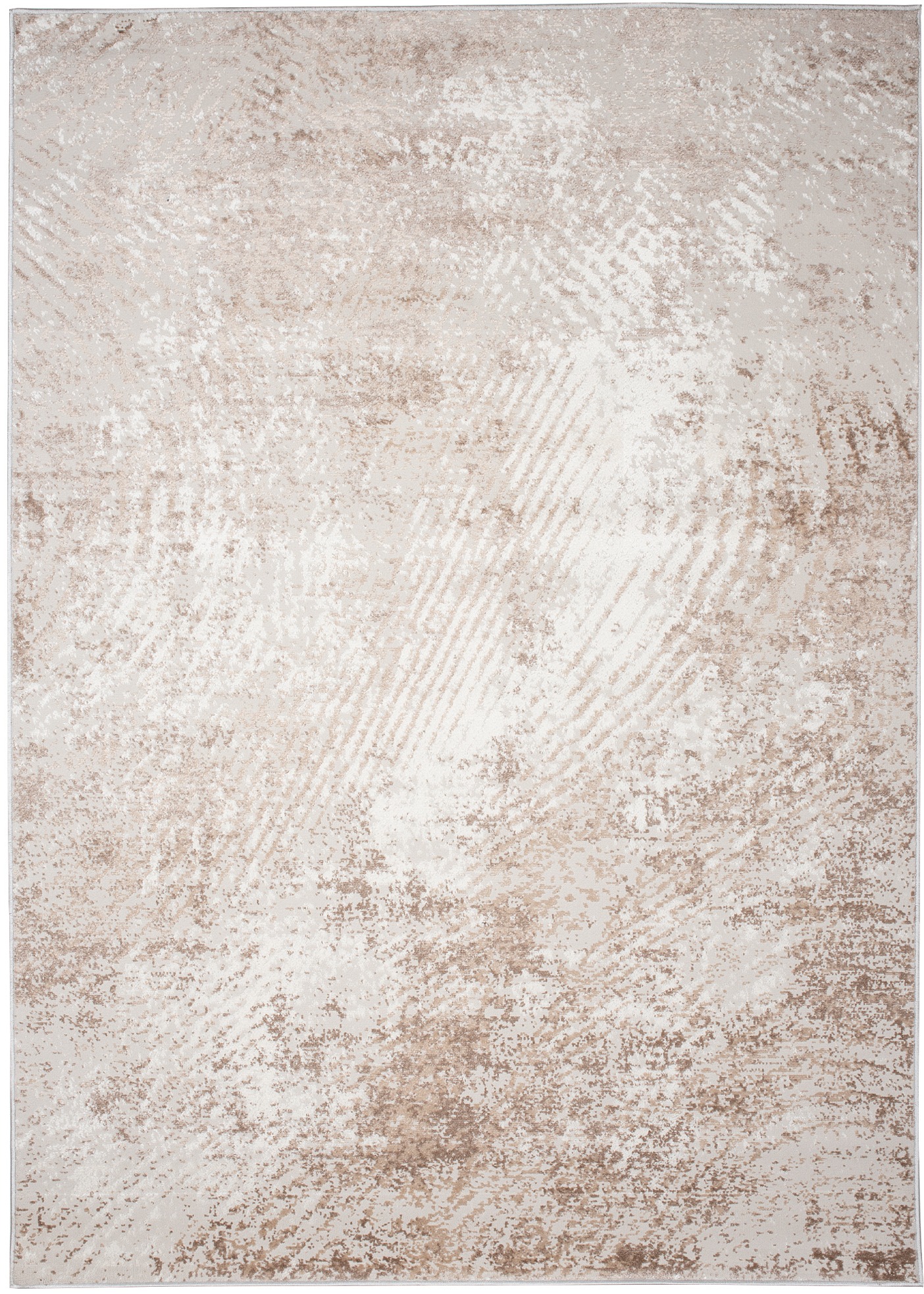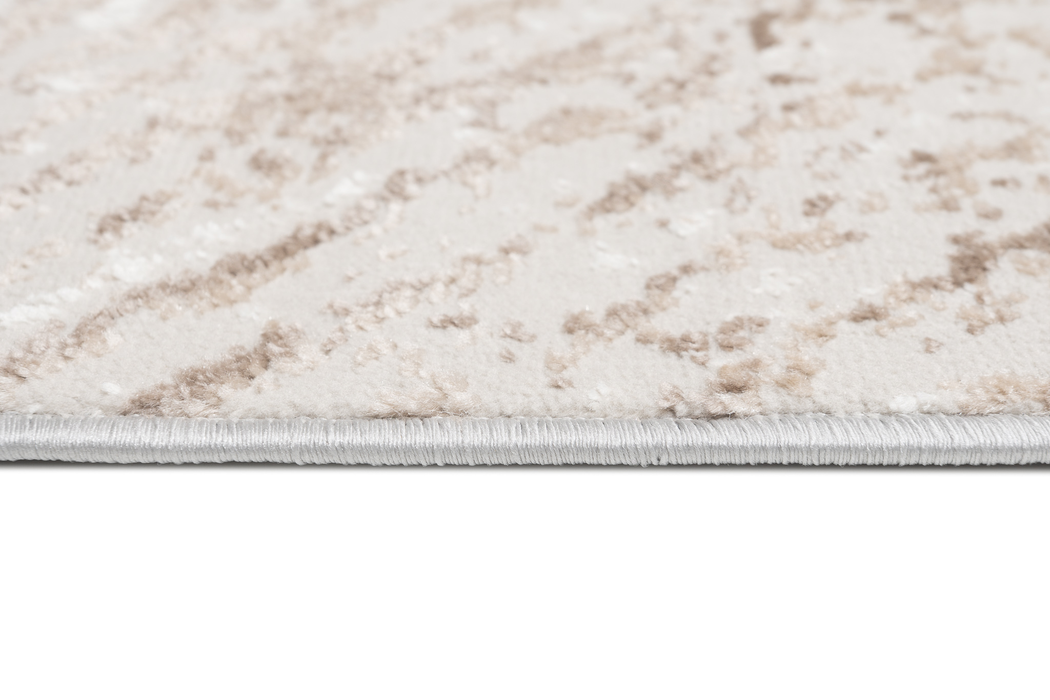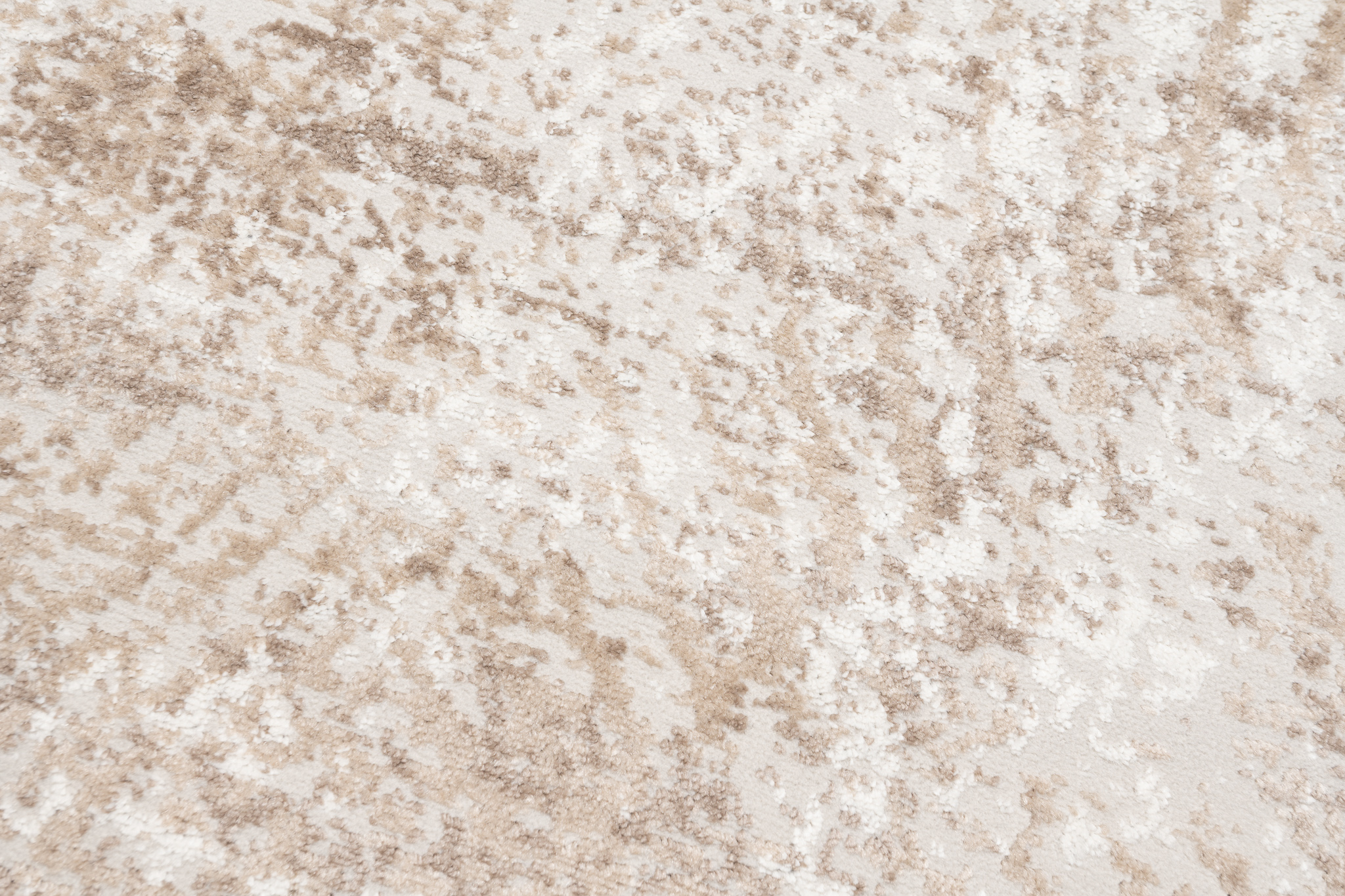 Dywan krótkowłosy wykonany z wysokiej jakości włókien syntetycznych. Utrzymany w kremowo-beżowej tonacji z subtelnym, przetartym wzorem w odcieniach jasnego brązu i piasku. Elegancki, trwały i łatwy w utrzymaniu czystości.