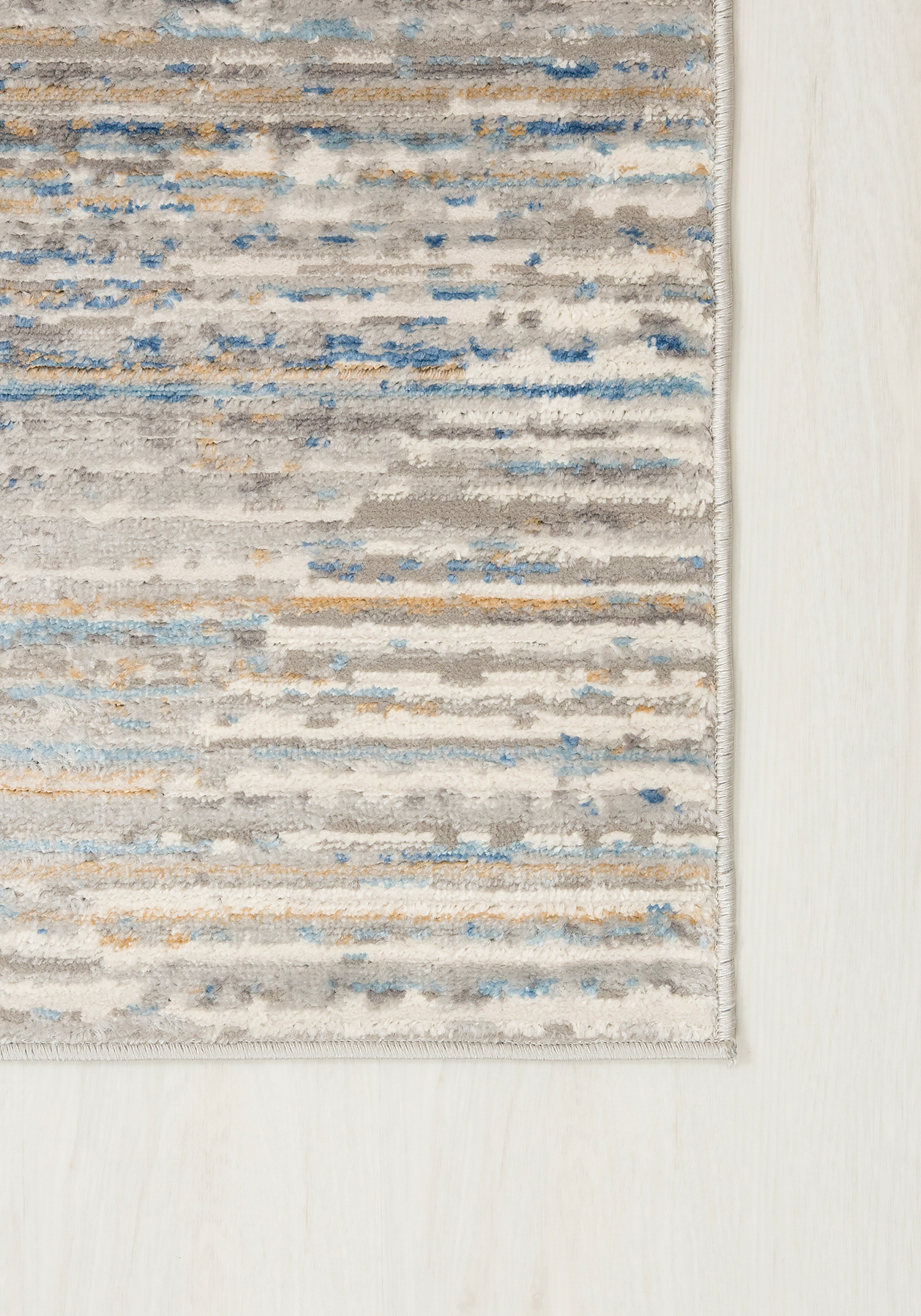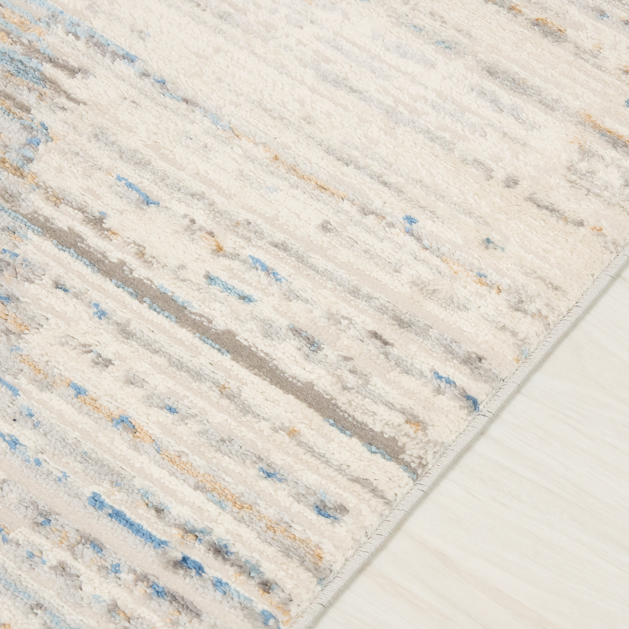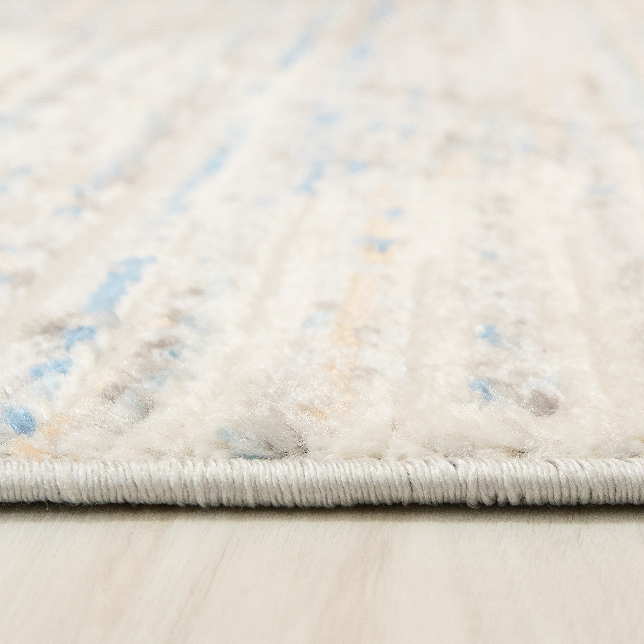Dywan krótkowłosy wykonany z wysokiej jakości włókien syntetycznych. Zdobiony geometrycznym wzorem z przecinających się linii w kremowej tonacji z akcentami szarości i niebieskiego. Nowoczesny, lekko przecierany efekt nadaje mu wyjątkowy charakter. Dywan jest elegancki, trwały i łatwy w utrzymaniu czystości.