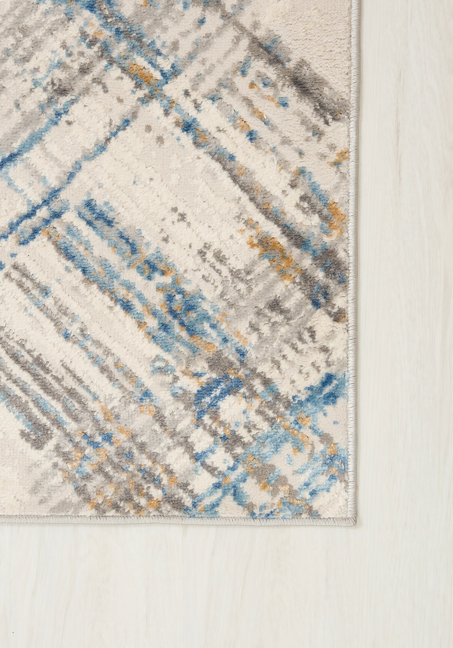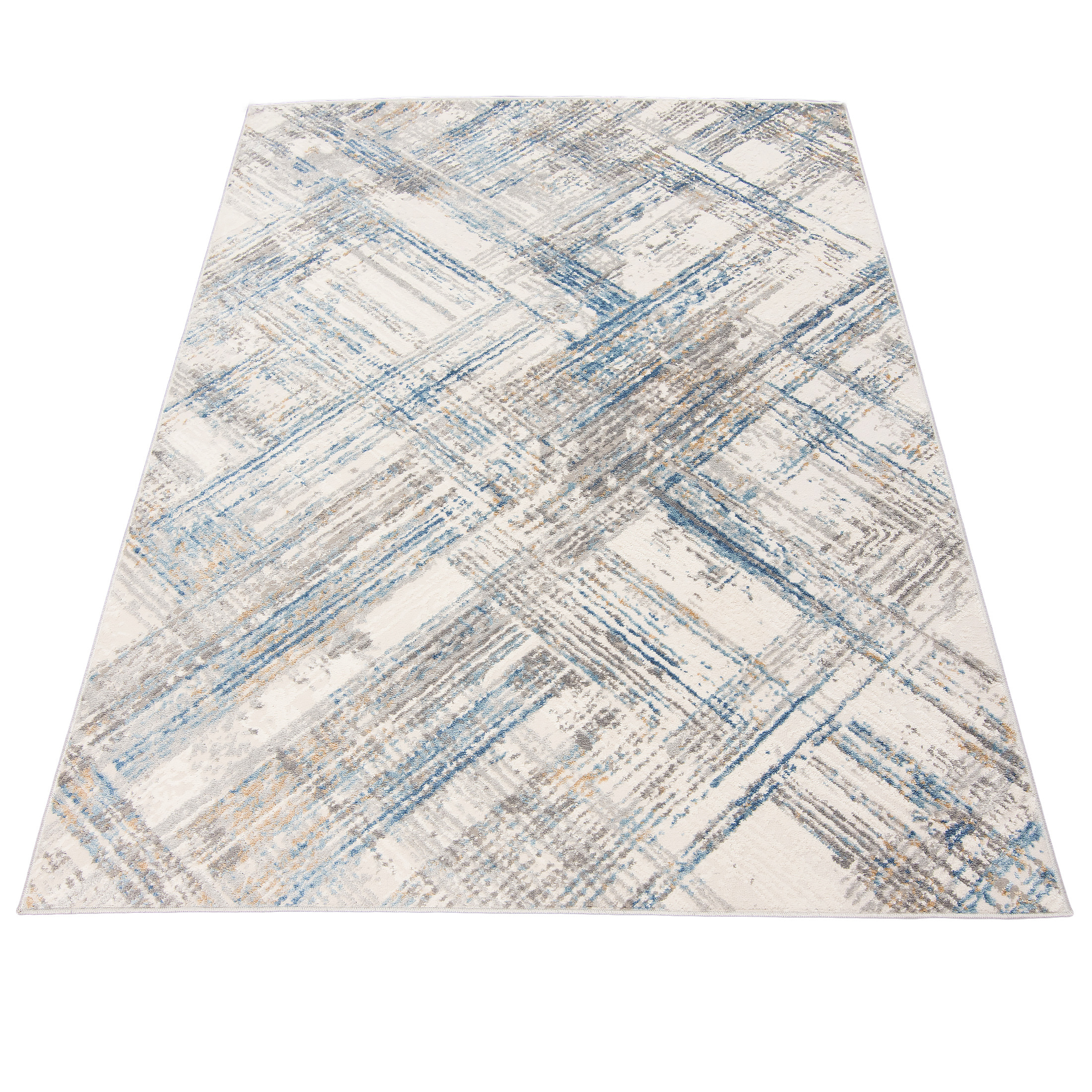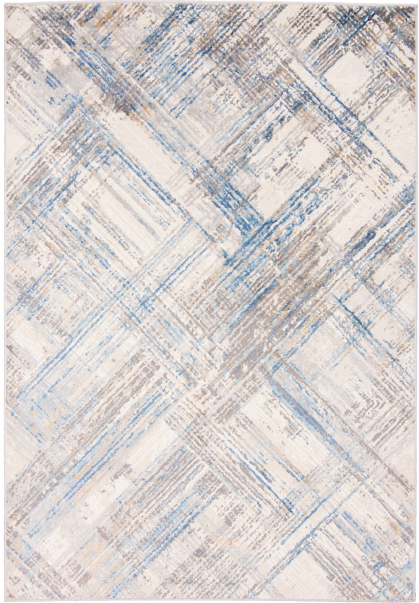 Dywan krótkowłosy wykonany z wysokiej jakości włókien syntetycznych. Zdobiony geometrycznym wzorem z przecinających się linii w kremowej tonacji z akcentami szarości, błękitu i beżu. Nowoczesny, lekko przecierany efekt nadaje mu wyjątkowy charakter. Dywan jest elegancki, trwały i łatwy w utrzymaniu czystości.