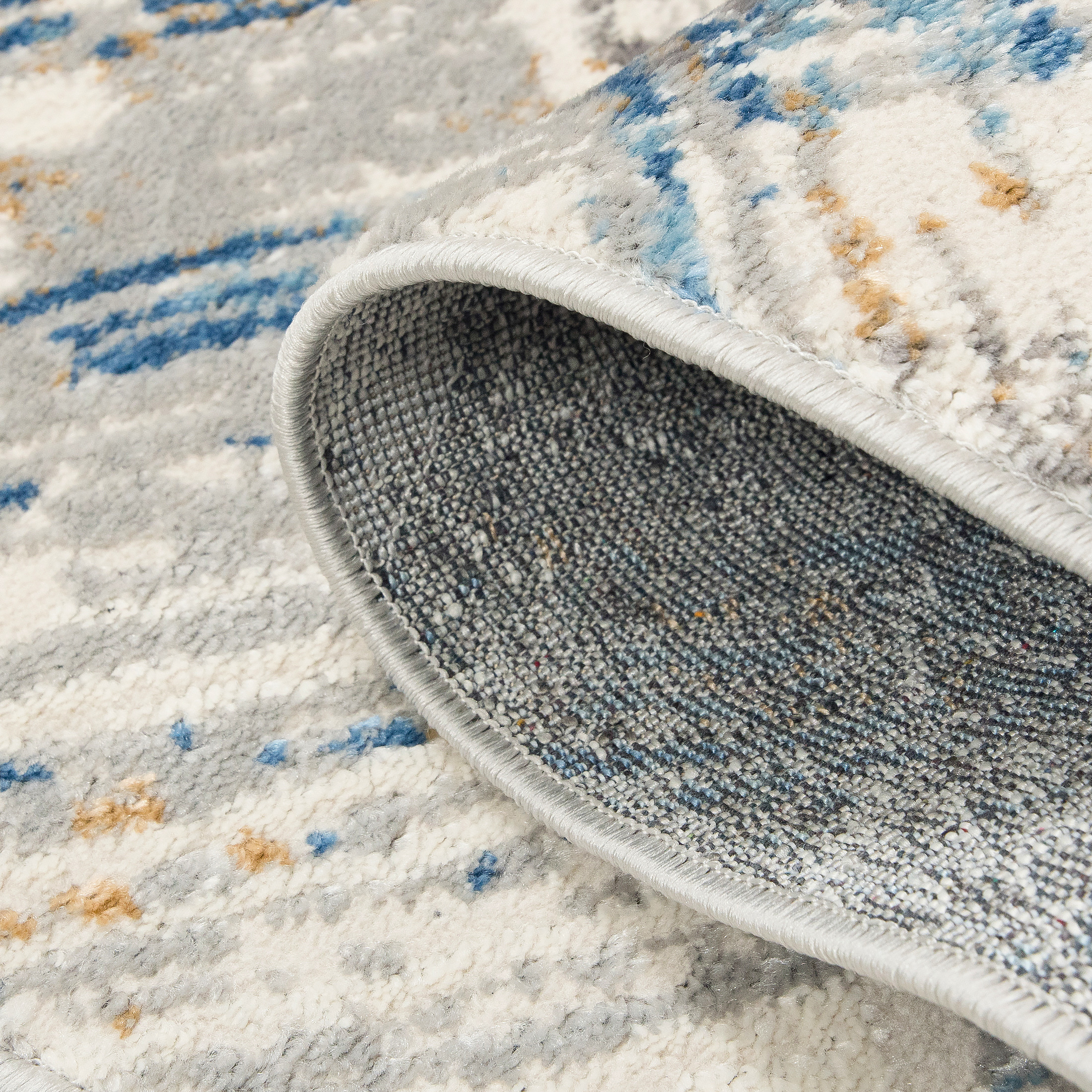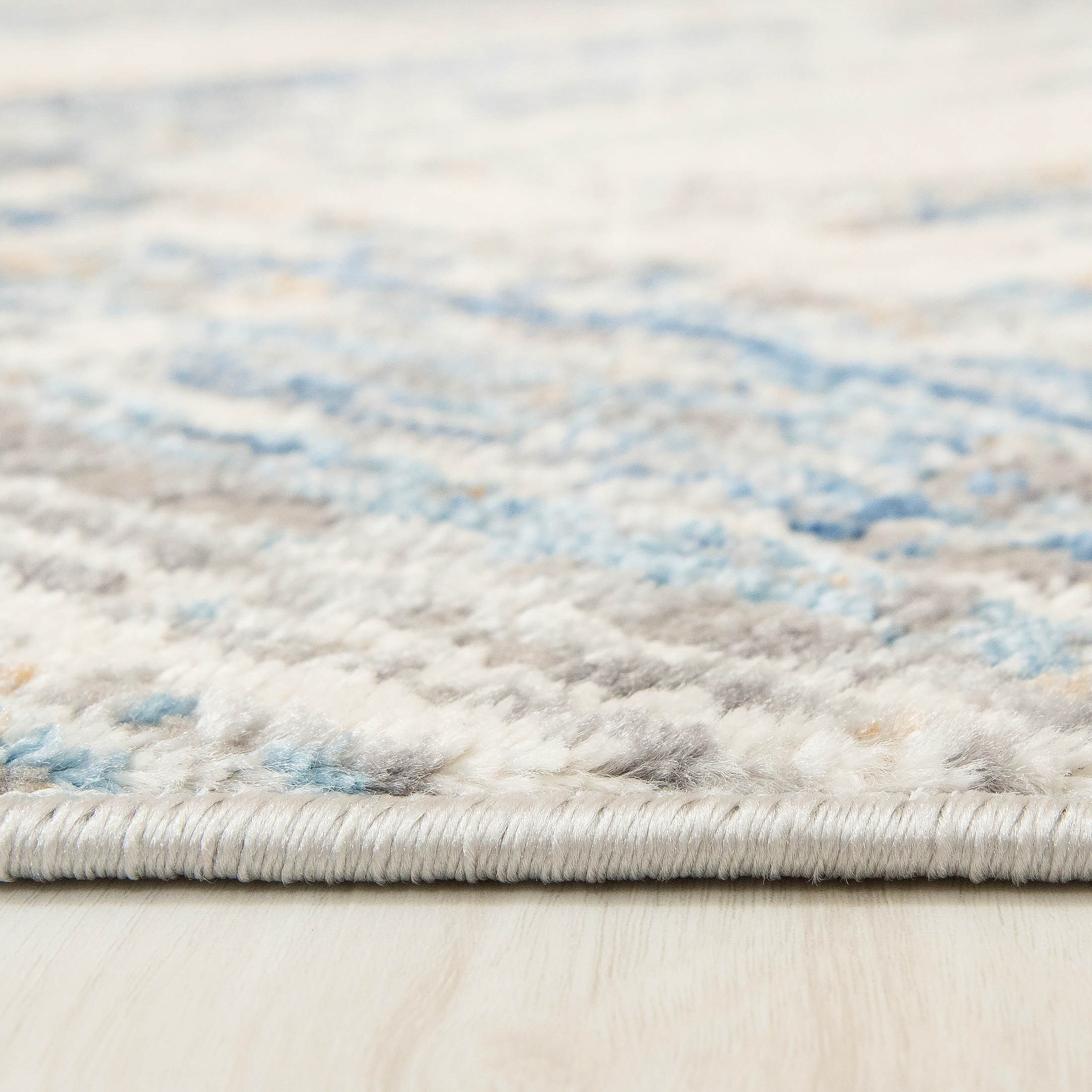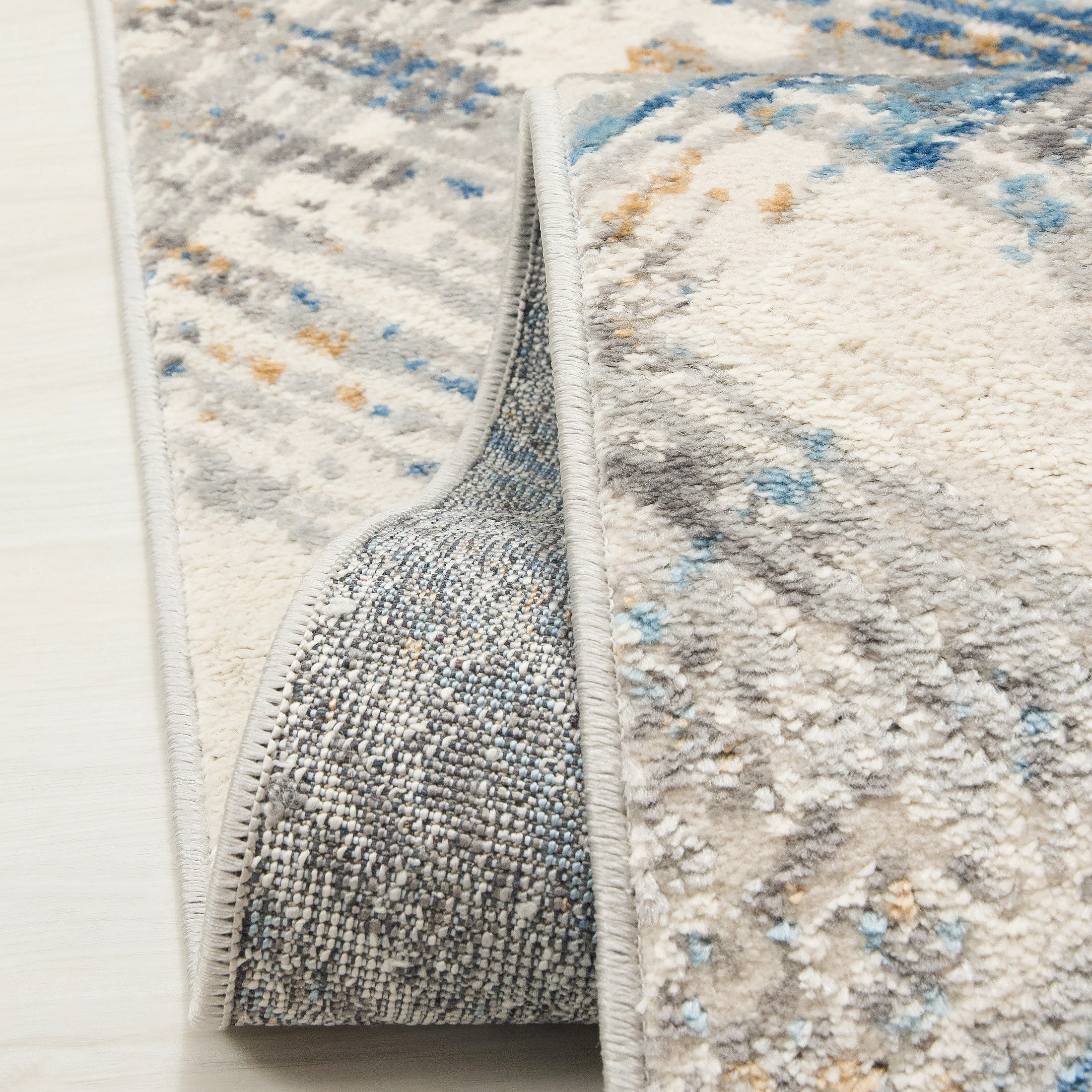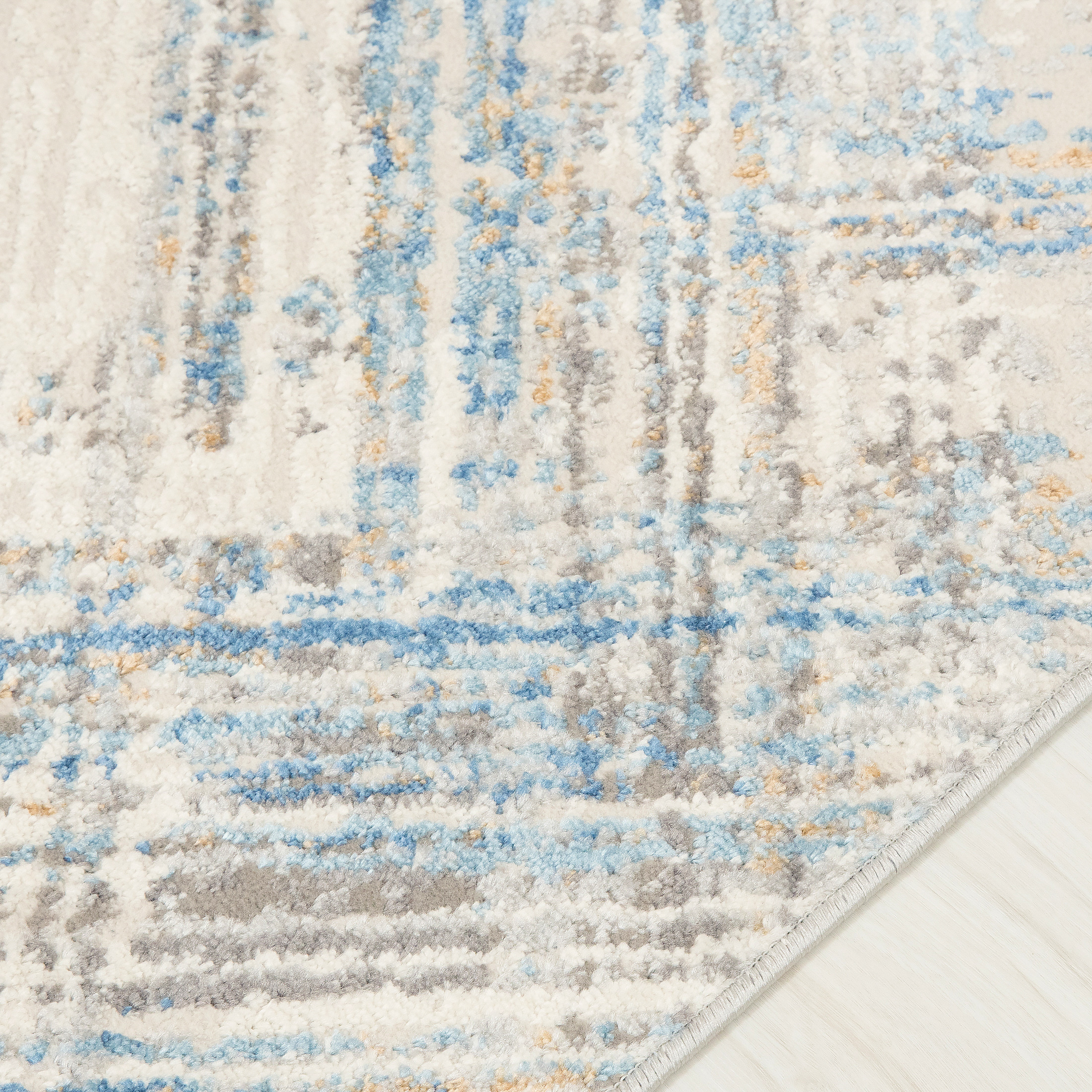 Dywan krótkowłosy wykonany z wysokiej jakości włókien syntetycznych. Zdobiony geometrycznym wzorem z przecinających się linii w kremowej tonacji z akcentami szarości, błękitu i beżu. Nowoczesny, lekko przecierany efekt nadaje mu wyjątkowy charakter. Dywan jest elegancki, trwały i łatwy w utrzymaniu czystości.