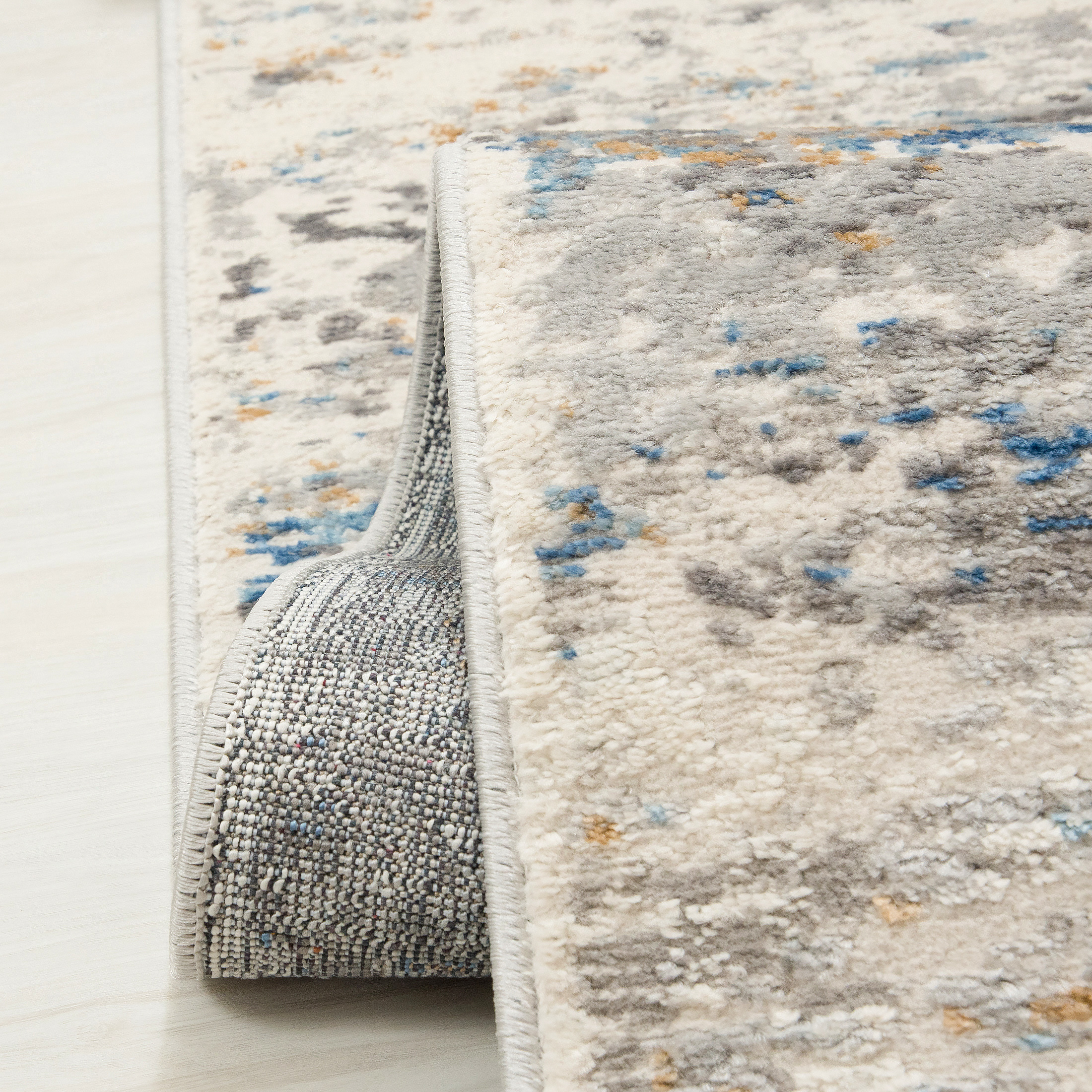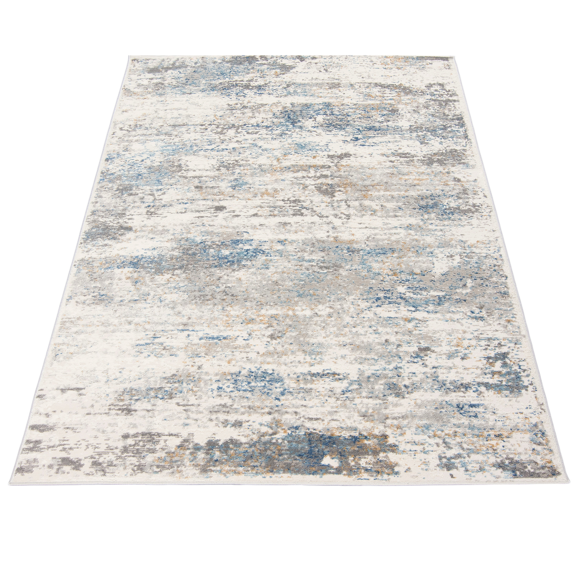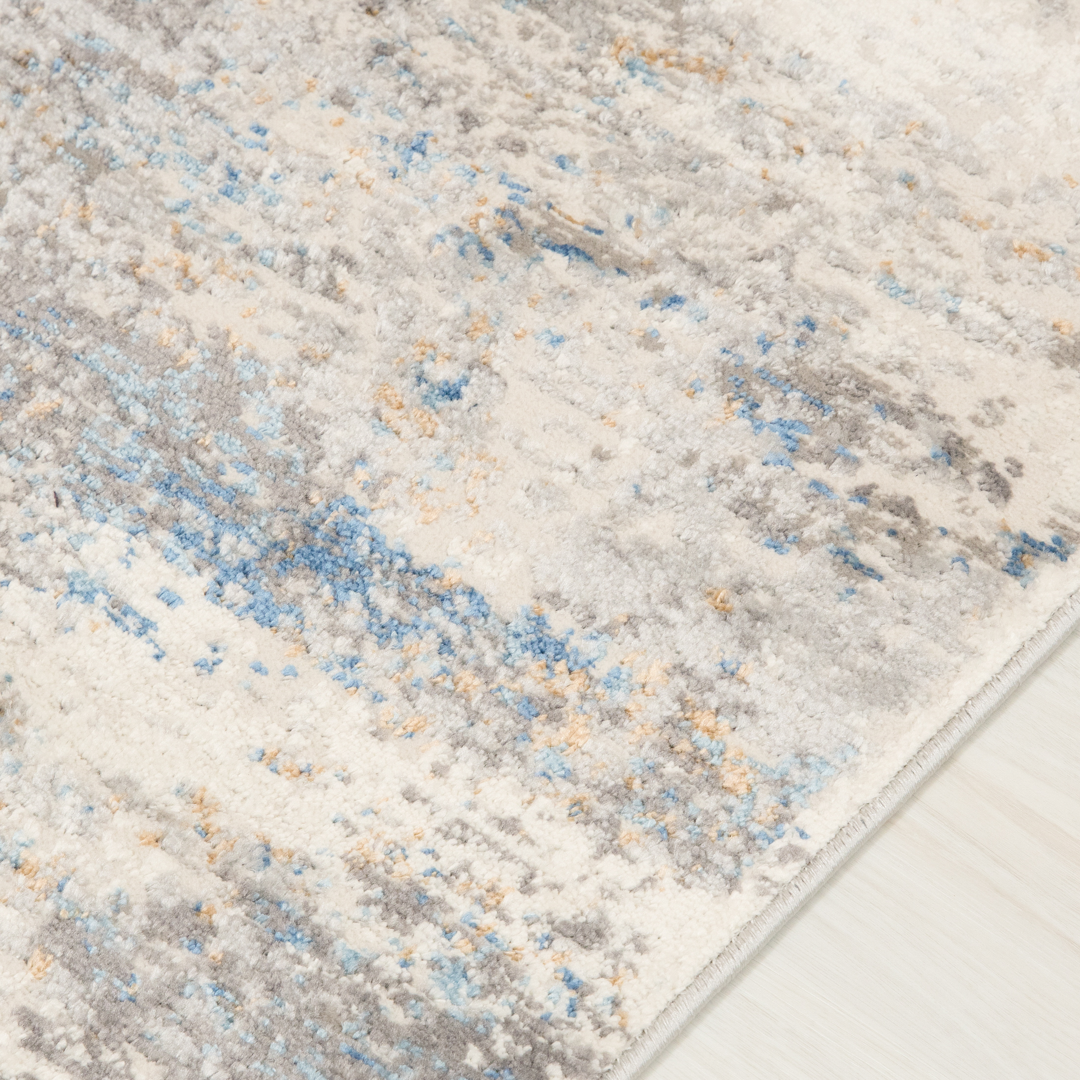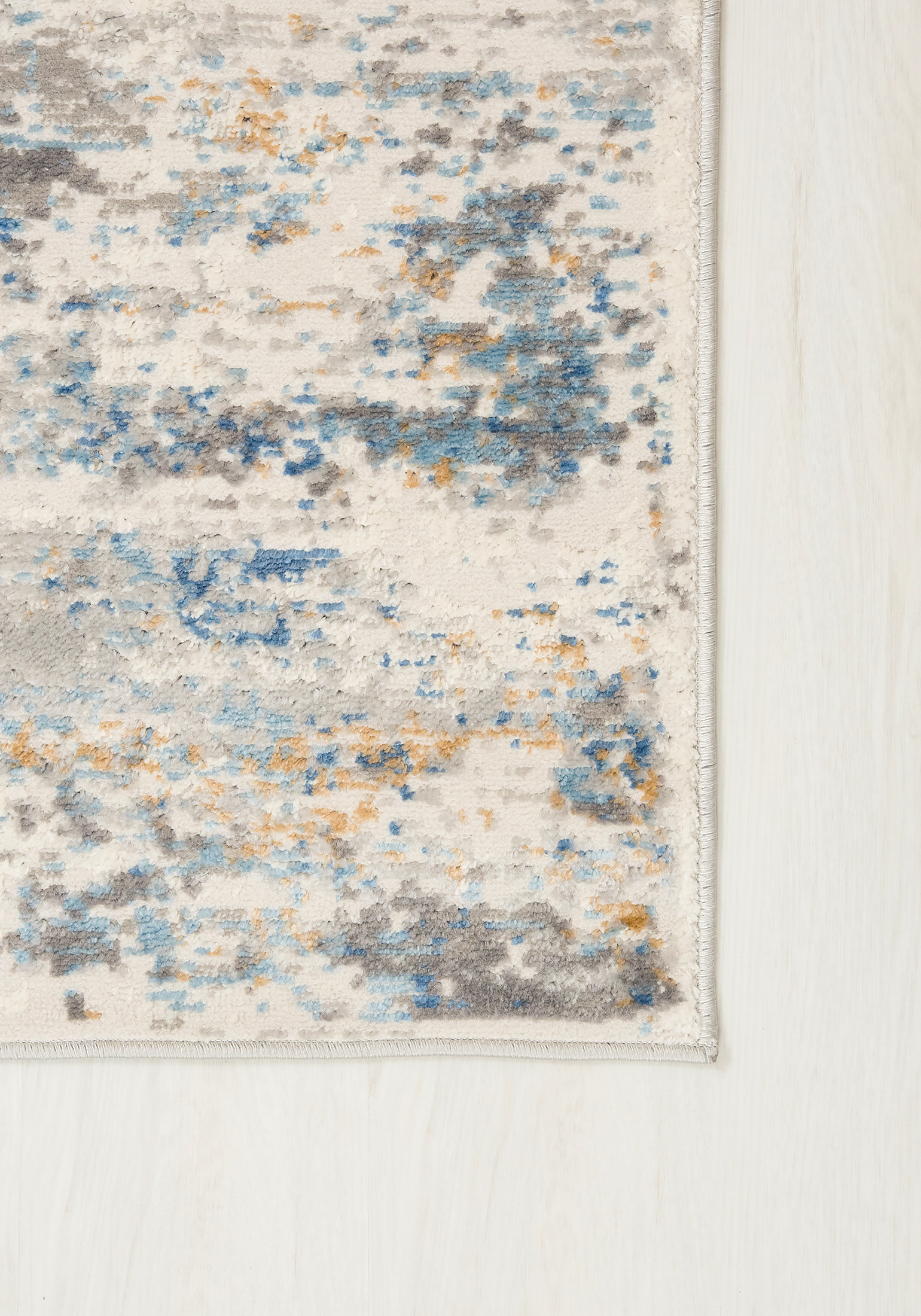 Dywan krótkowłosy wykonany z wysokiej jakości włókien syntetycznych. Wzór dywanu jest subtelnie przetarty, utrzymany w odcieniach kremu i delikatnego niebieskiego, z lekkim efektem postarzenia, przypominającym popękaną powierzchnię ziemi.