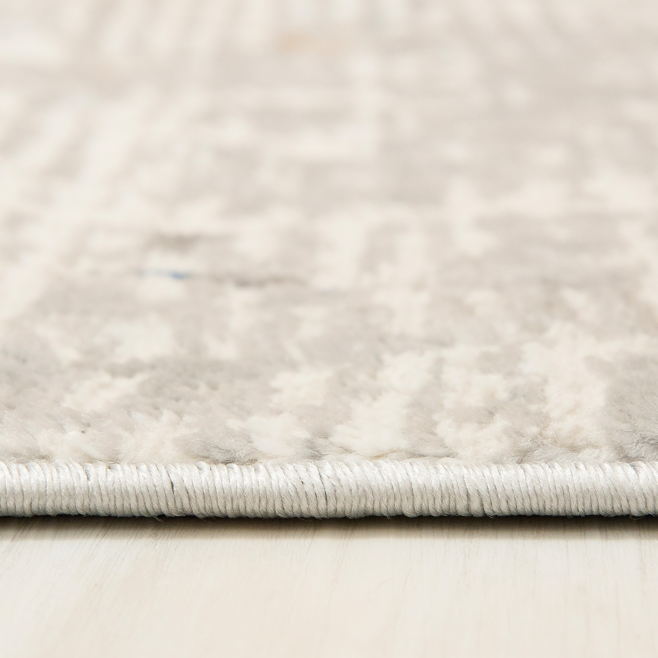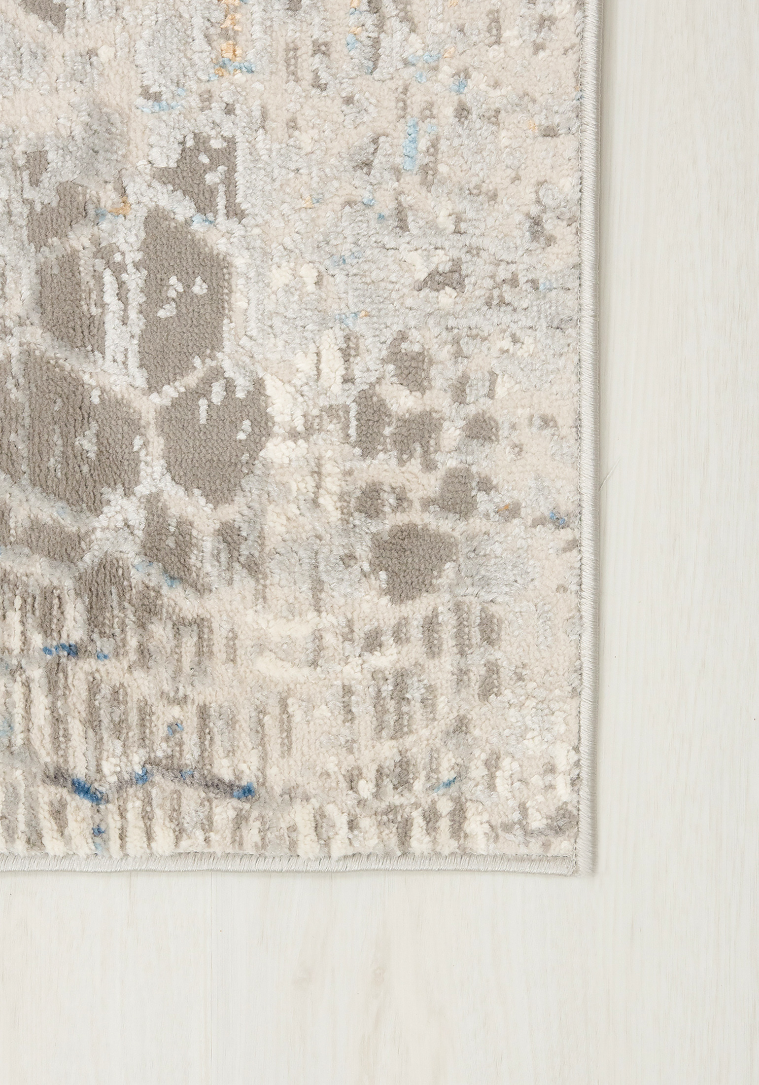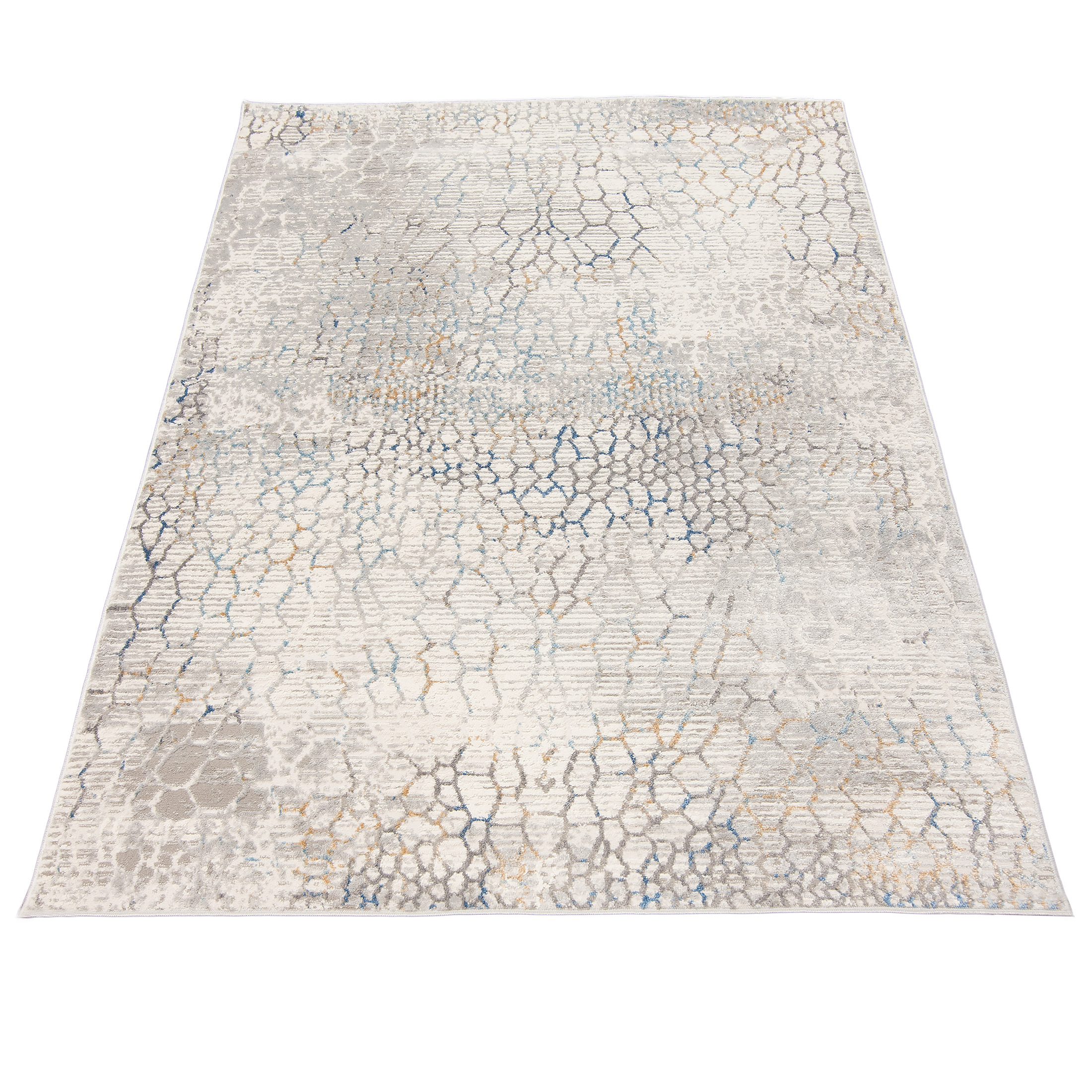 Dywan krótkowłosy wykonany z wysokiej jakości włókien syntetycznych. Wzór dywanu jest subtelnie przetarty, utrzymany w odcieniach kremu i delikatnego niebieskiego, z lekkim efektem postarzenia, przypominającym popękaną powierzchnię ziemi.