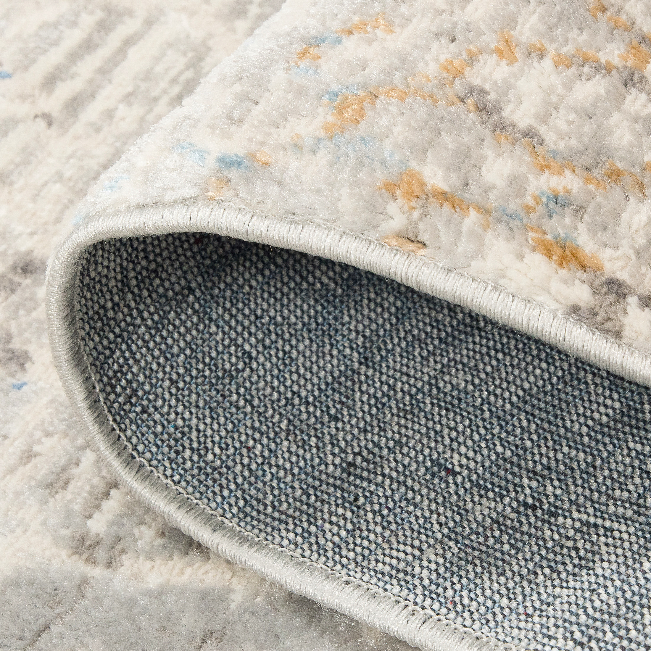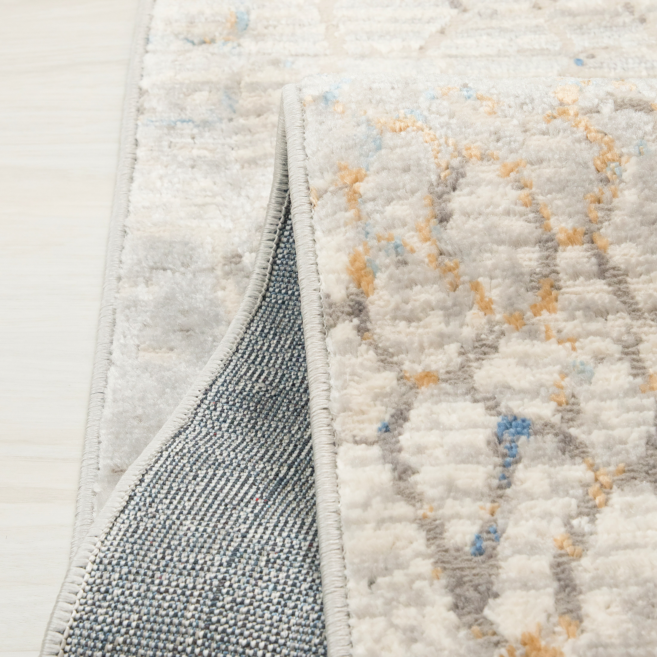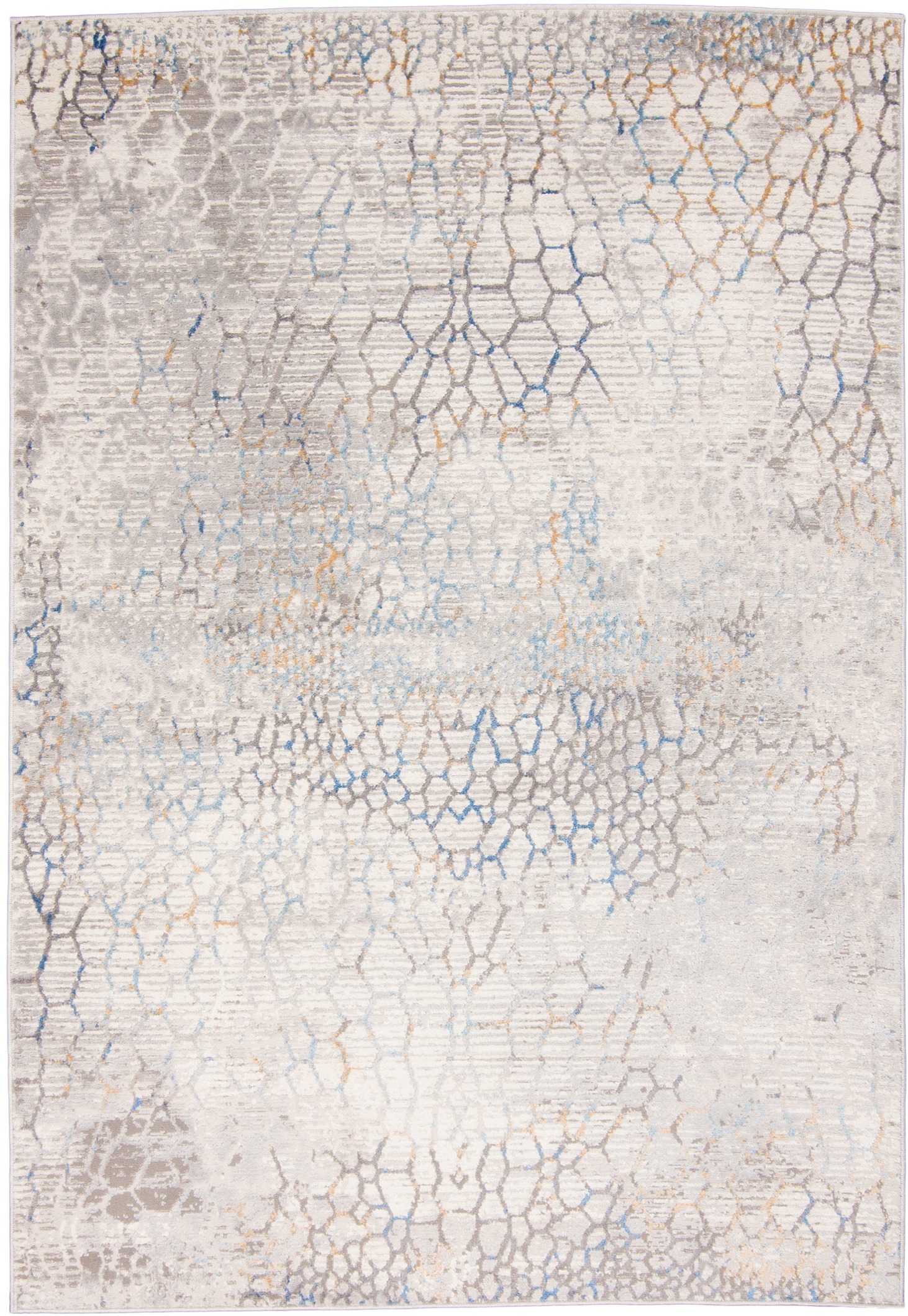 Dywan krótkowłosy wykonany z wysokiej jakości włókien syntetycznych. Wzór dywanu jest subtelnie przetarty, utrzymany w odcieniach kremu i delikatnego niebieskiego, z lekkim efektem postarzenia, przypominającym popękaną powierzchnię ziemi.