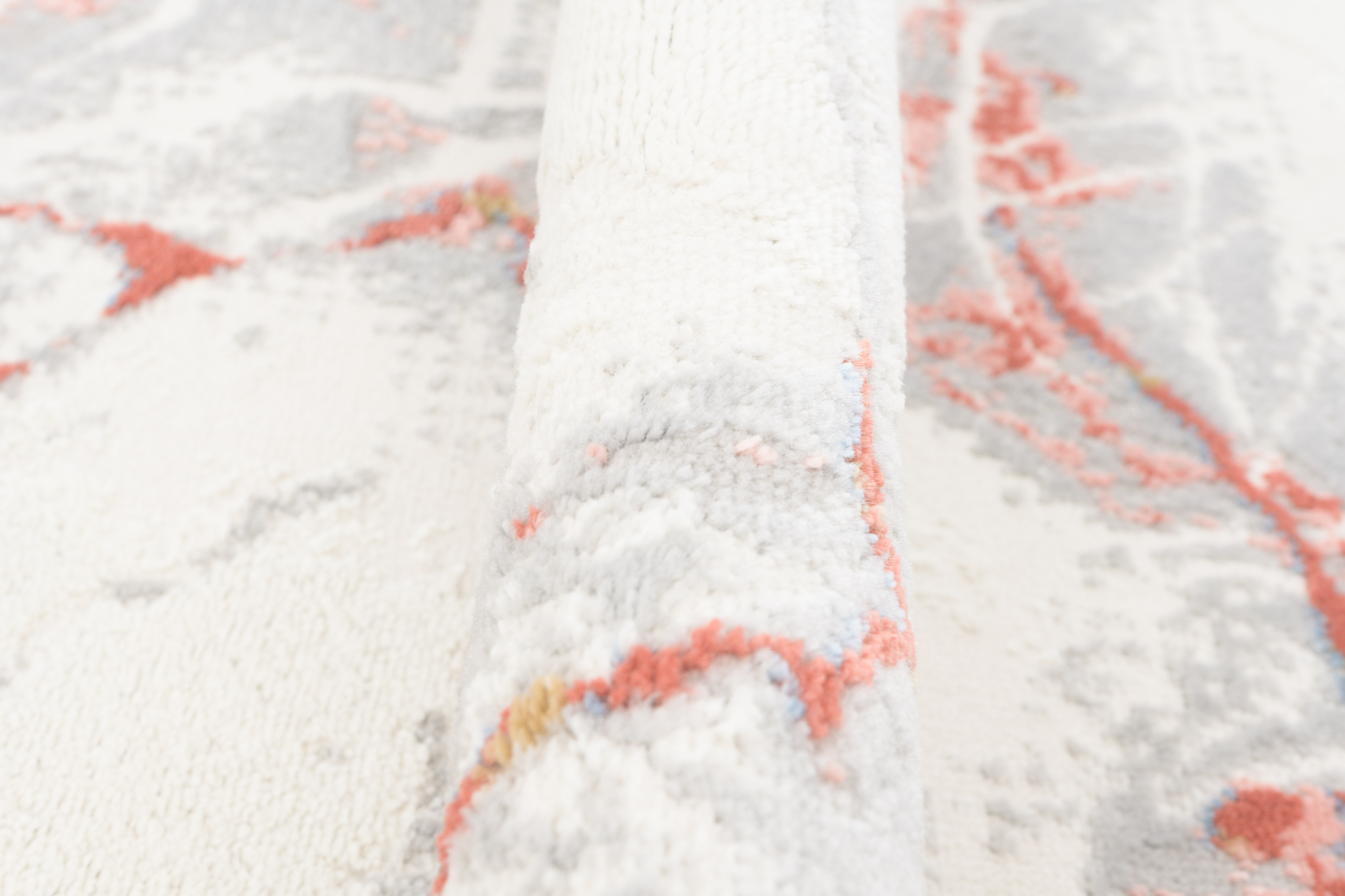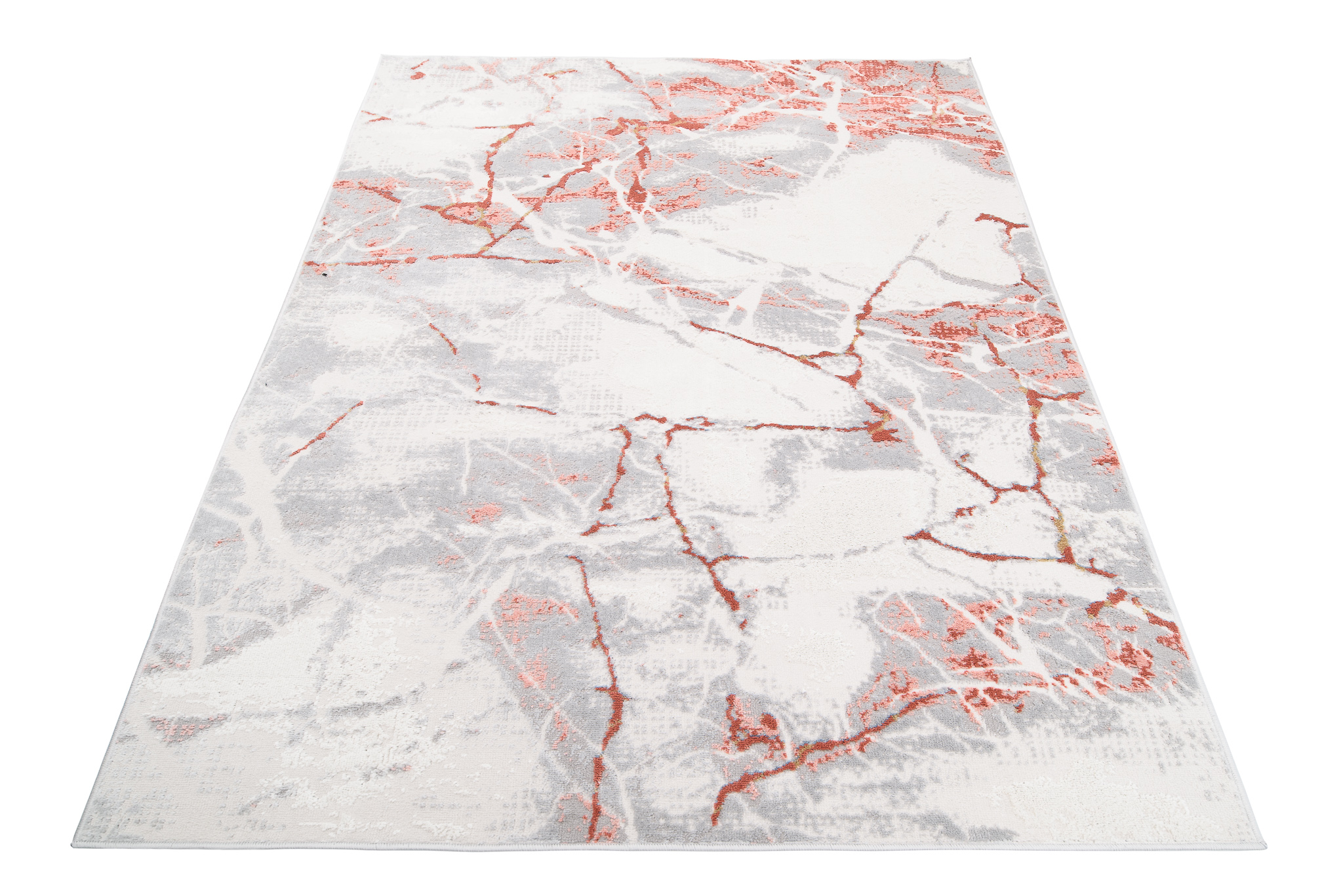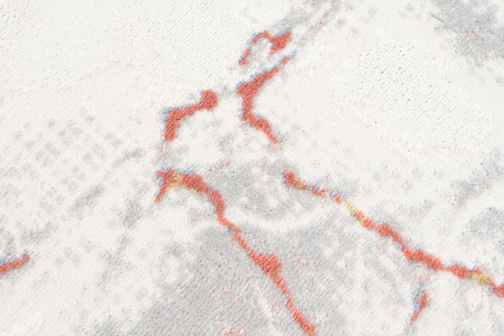 Nowoczesny dywan krótkowłosy wykonany z wysokiej jakości włókien syntetycznych. Na kremowym tle rozpościera się subtelny, abstrakcyjny wzór w odcieniach szarości i pomarańczu, z delikatnym połyskiem przypominającym strukturę marmuru lub spękanej skały. Dywan jest nie tylko elegancki, ale także wyjątkowo trwały i łatwy w utrzymaniu czystości.