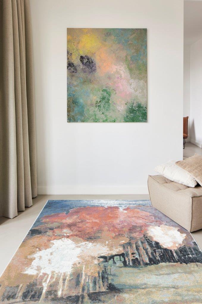 Nowoczesny, beżowy dywan z wyjątkowo gęstym runem 3d, niezwykle miękki, trwały i komfortowy. Abstrakcyjny wzór dodaje mu subtelnego uroku, łącząc styl z przytulnością.