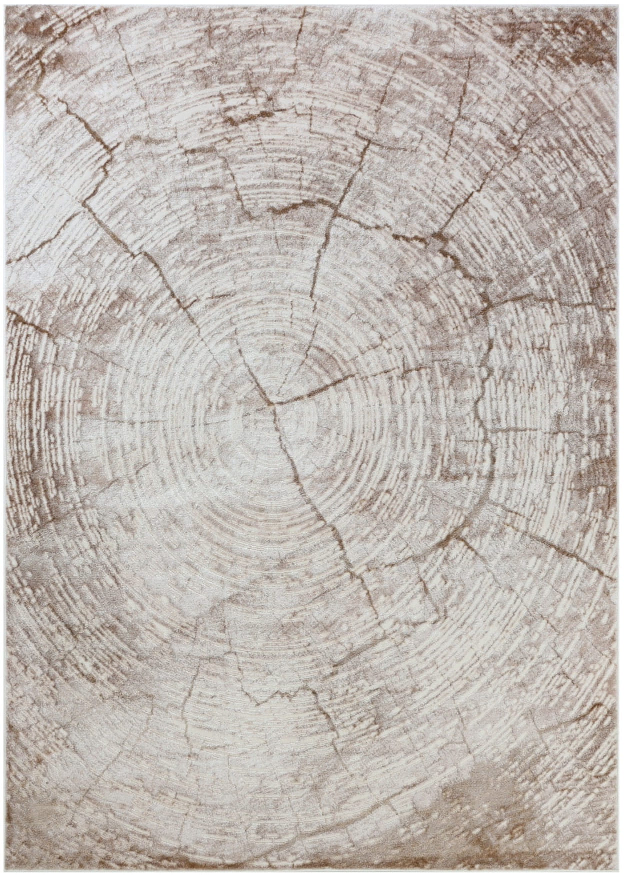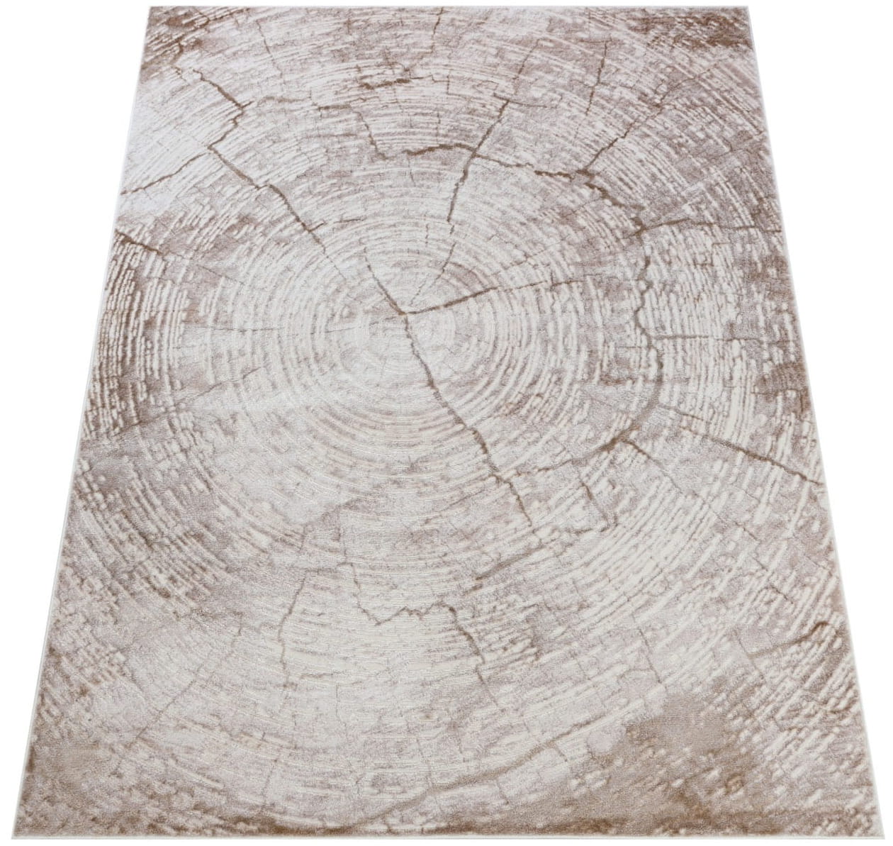 Nowoczesny dywan z krótkim, dwupoziomowym runem i wzorem przekroju pnia drzewa. Miękki w dotyku, a jednocześnie trwały i łatwy w czyszczeniu. Połączenie estetyki i funkcjonalności w stylowej formie.