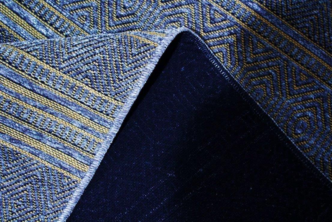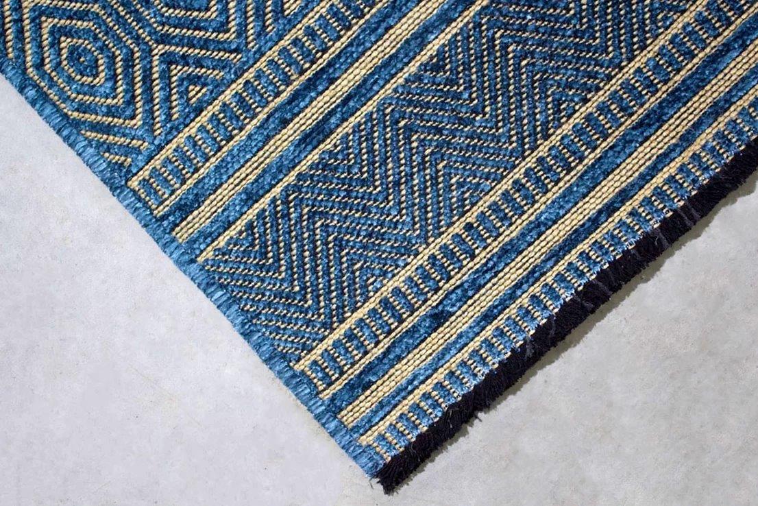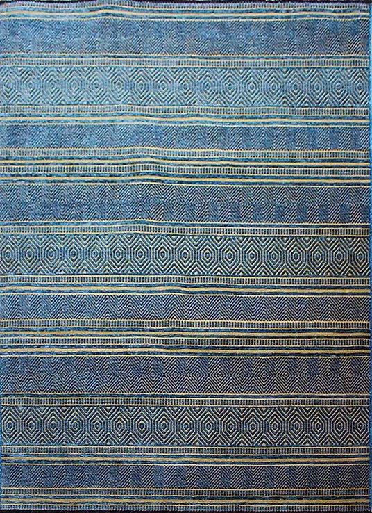 Niebieski dywan Saran, płaskotkany, to mieszanka naturalnej przędzy z poliestrową. Praktyczny i funkcjonalny, łatwy do czyszczenia.
