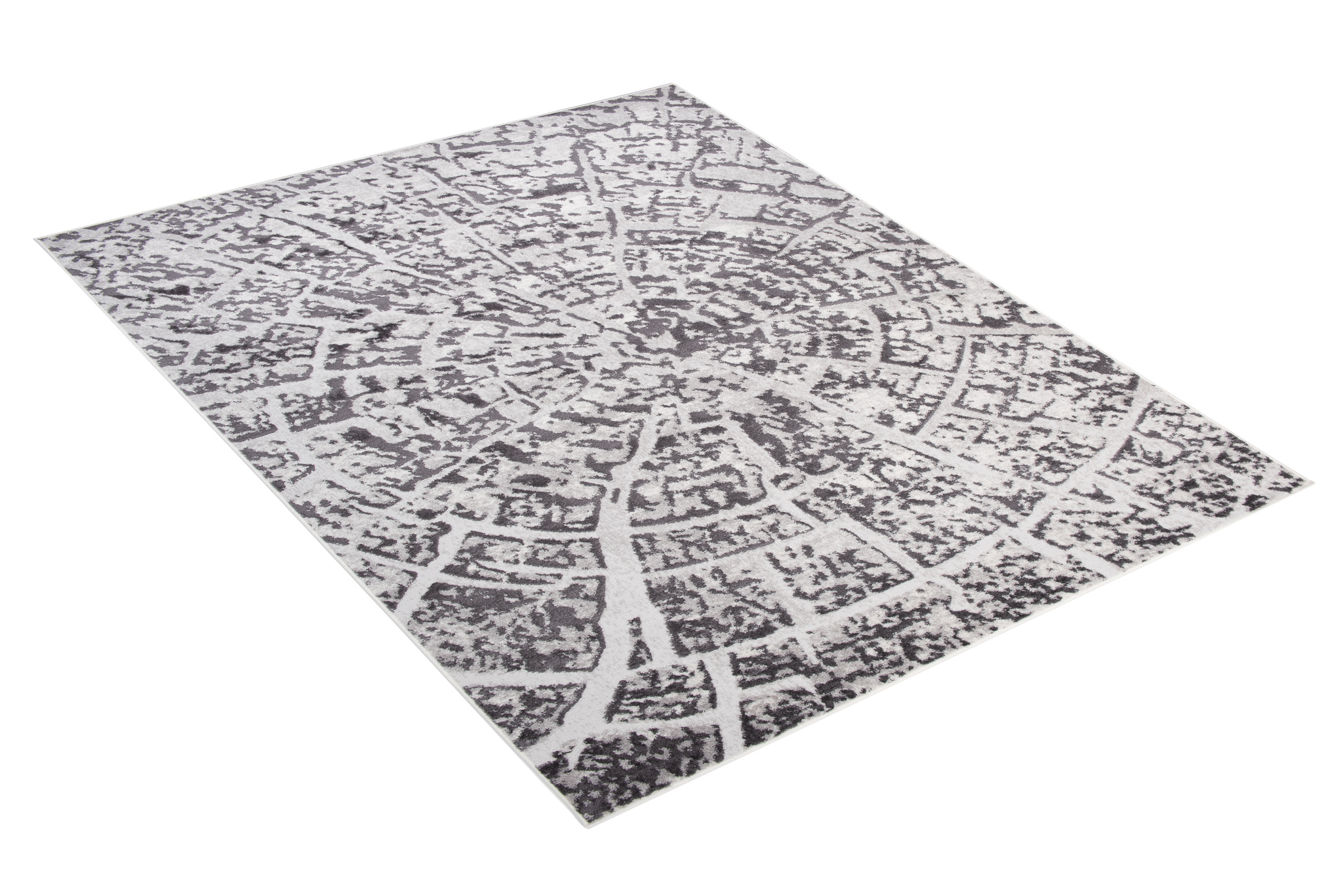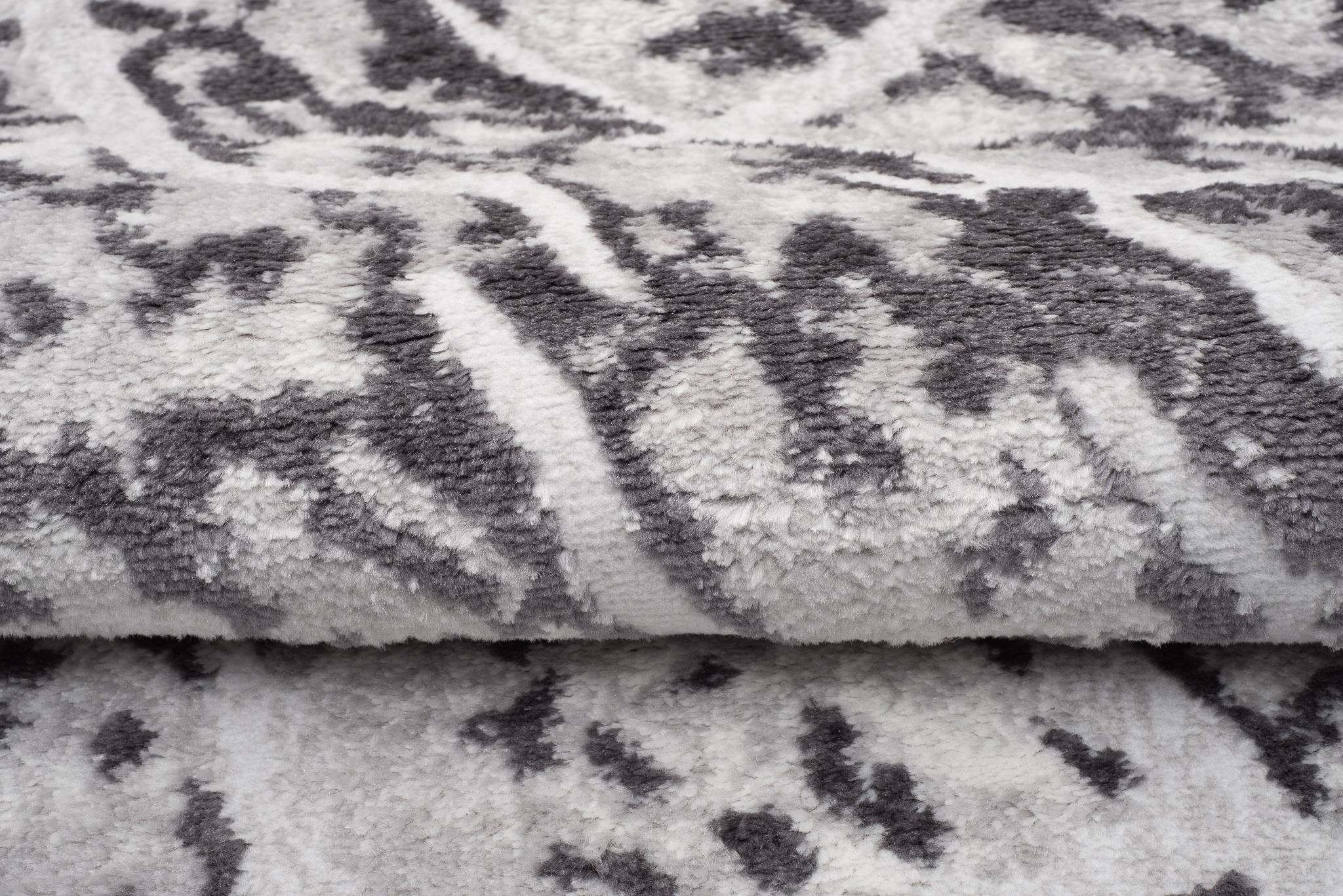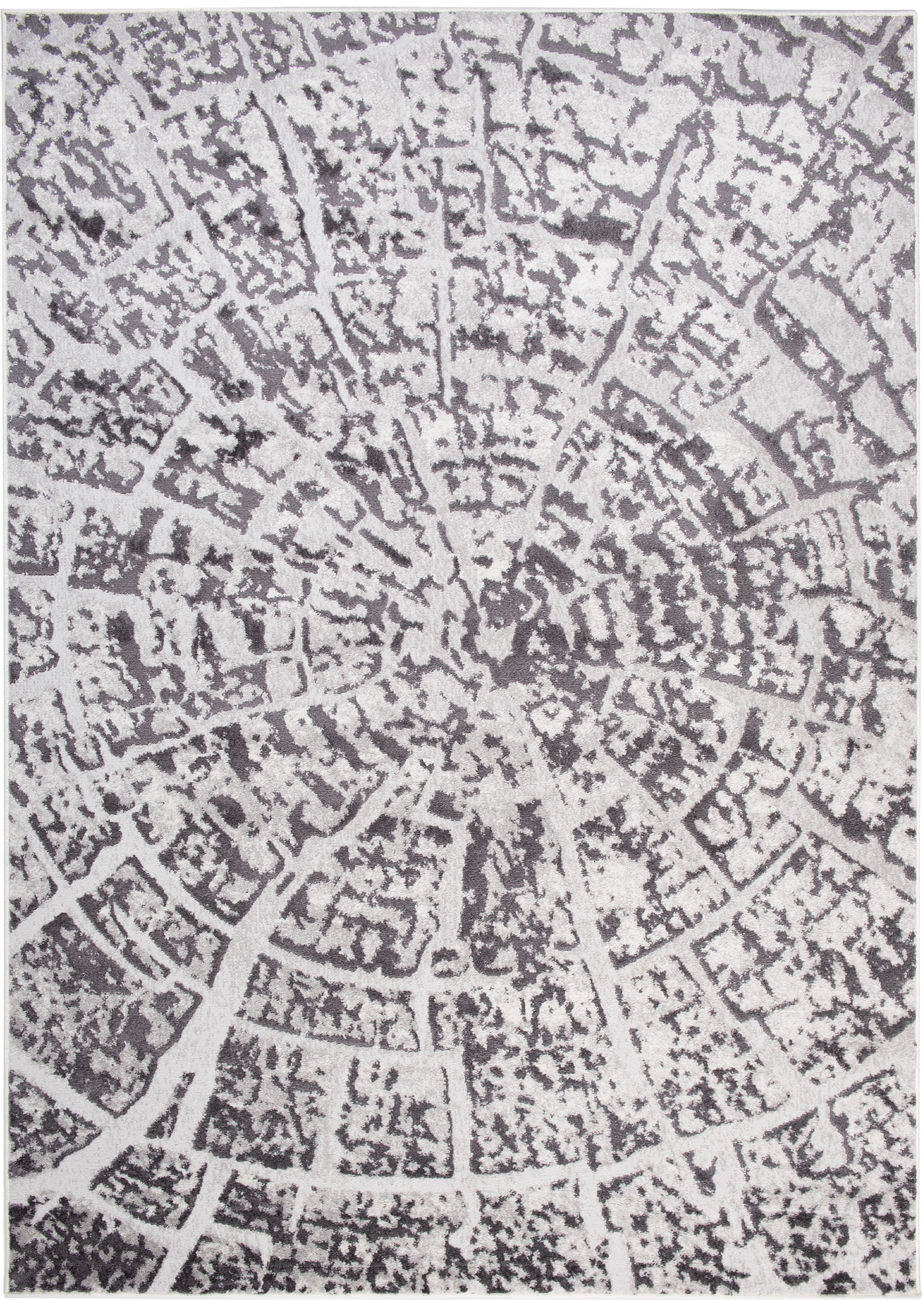 Dywan w odcieniach szarości z wzorem przypominającym pień drzewa w przekroju. Dwupoziomowe runo podkreśla przestrzenną strukturę wzoru, a stonowana kolorystyka nadaje całości elegancki, lekko industrialny charakter.
