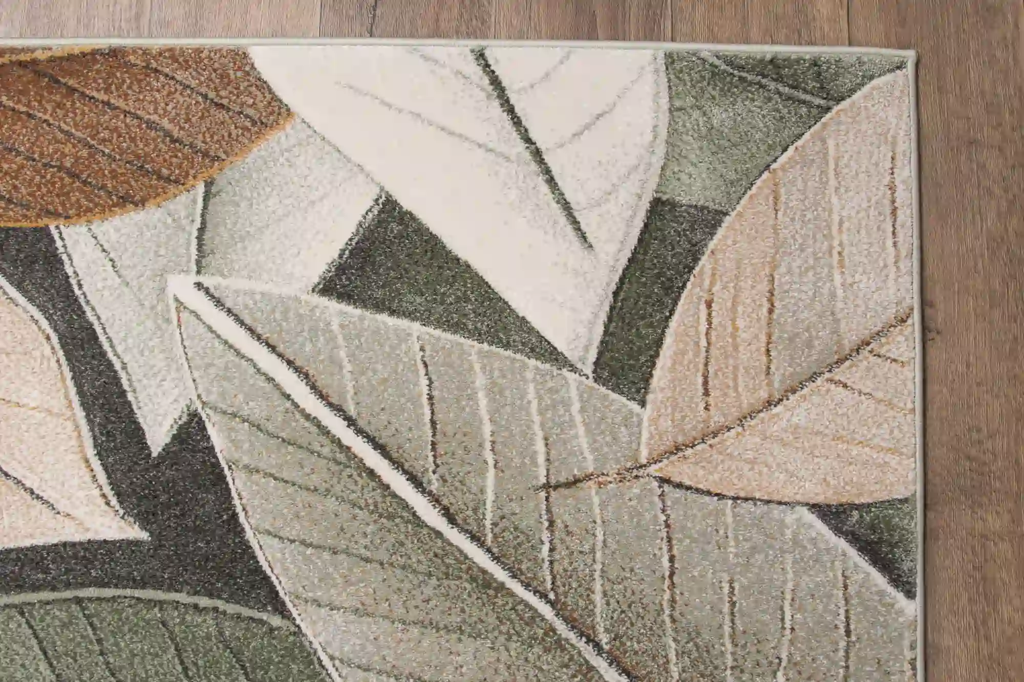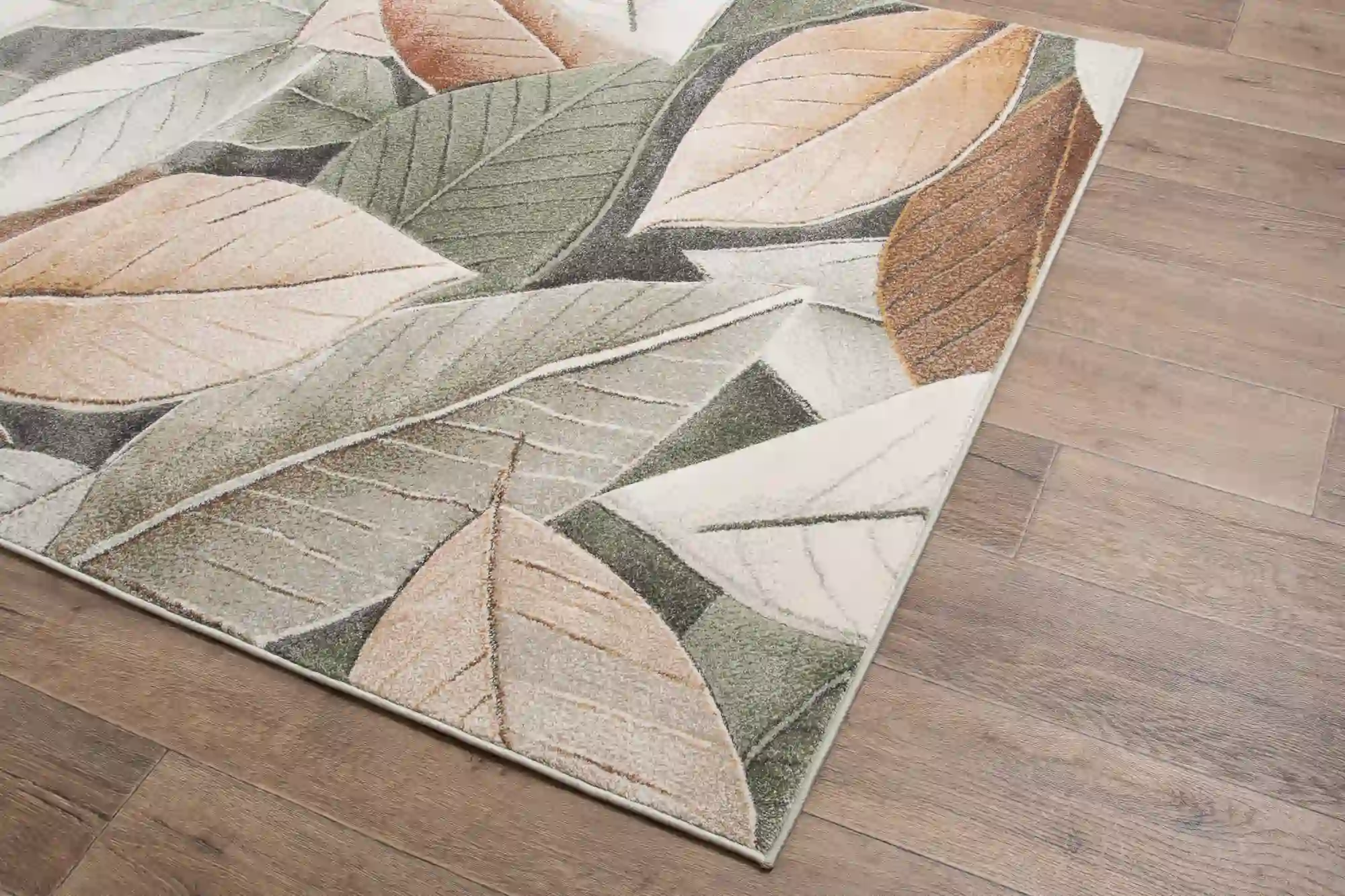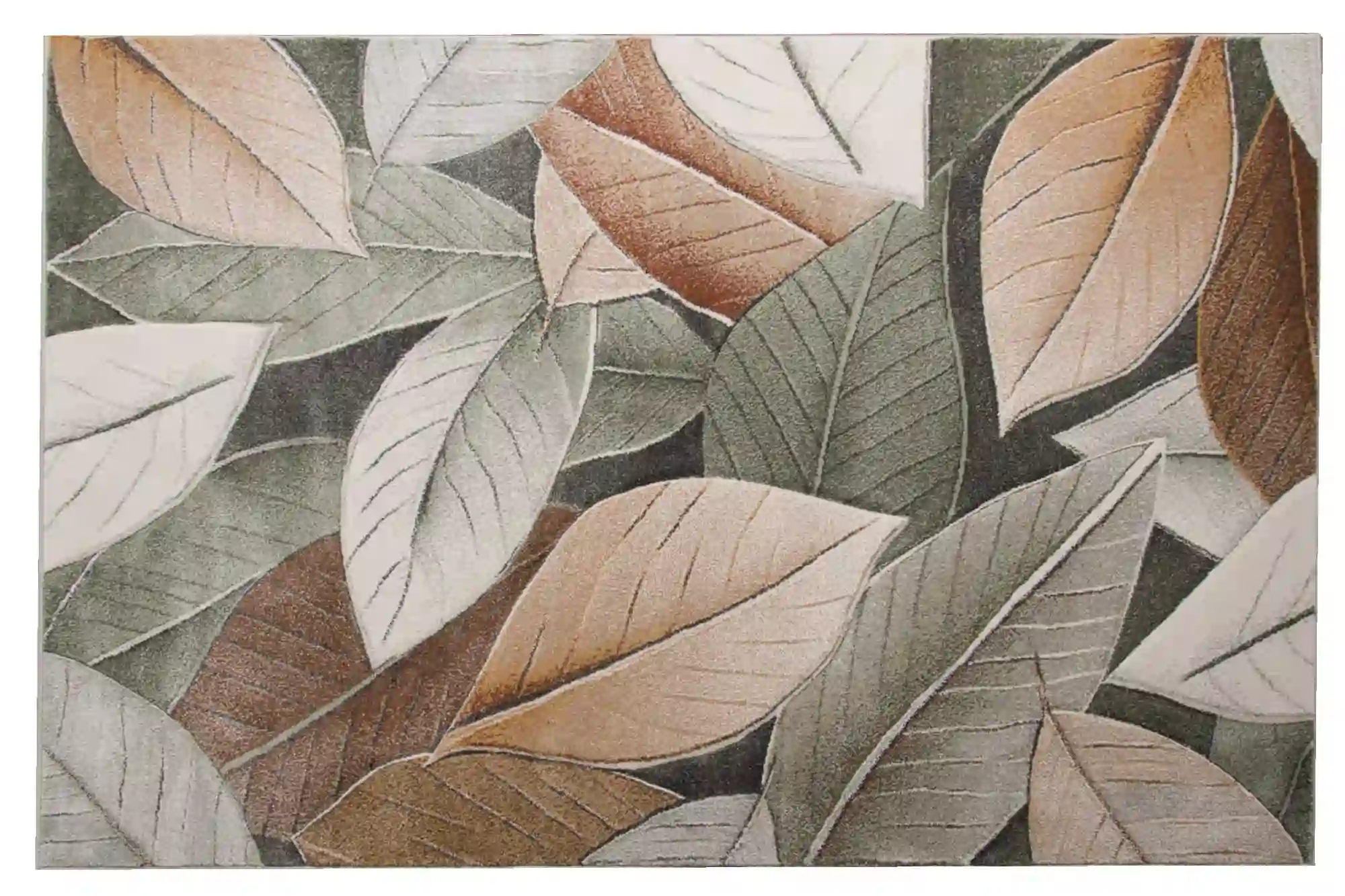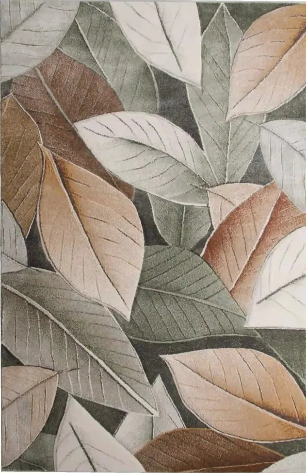 Dywan zdobiony dużymi, nowoczesnymi liśćmi w odcieniach zieleni i brązu, rozmieszczonymi na całej powierzchni. Wykonany z trwałego polipropylenu, jest odporny na zabrudzenia i łatwy w czyszczeniu, co czyni go praktycznym i stylowym dodatkiem do każdego wnętrza.