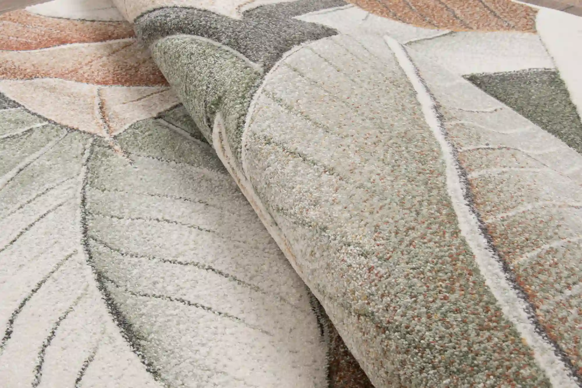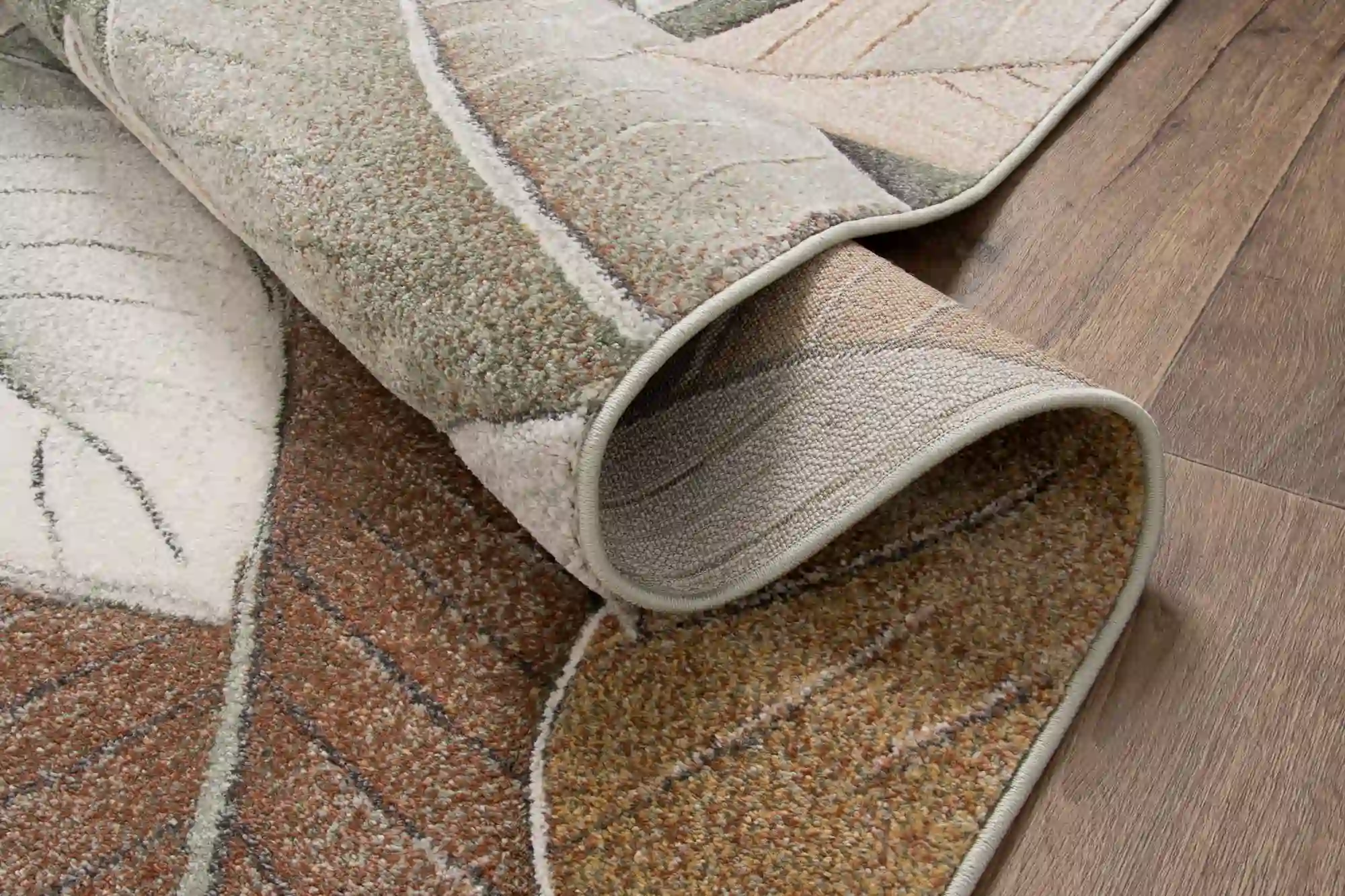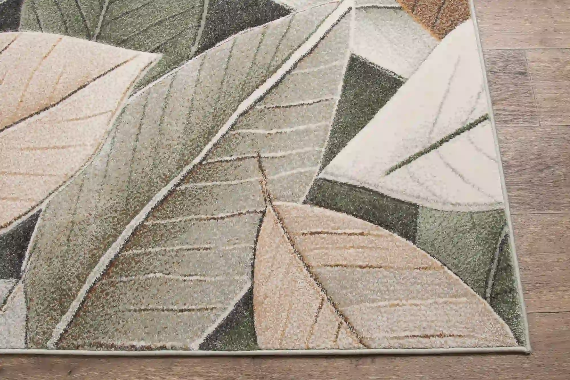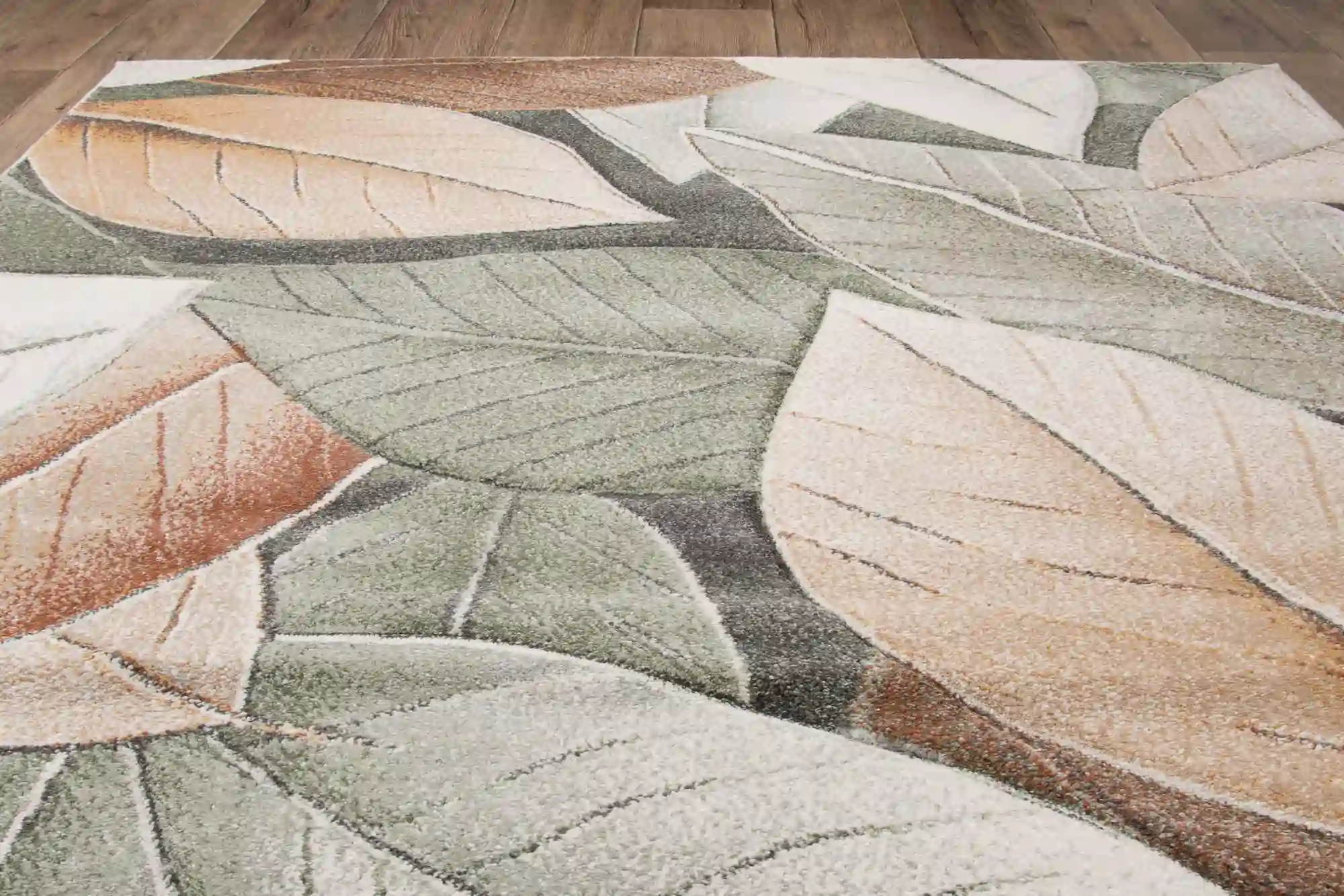 Dywan zdobiony dużymi, nowoczesnymi liśćmi w odcieniach zieleni i brązu, rozmieszczonymi na całej powierzchni. Wykonany z trwałego polipropylenu, jest odporny na zabrudzenia i łatwy w czyszczeniu, co czyni go praktycznym i stylowym dodatkiem do każdego wnętrza.