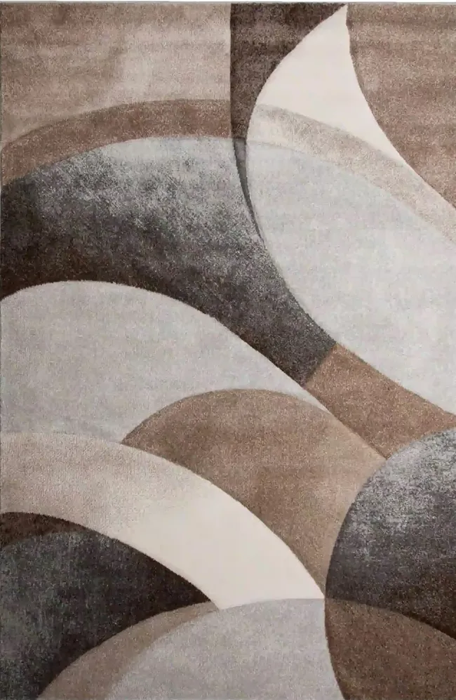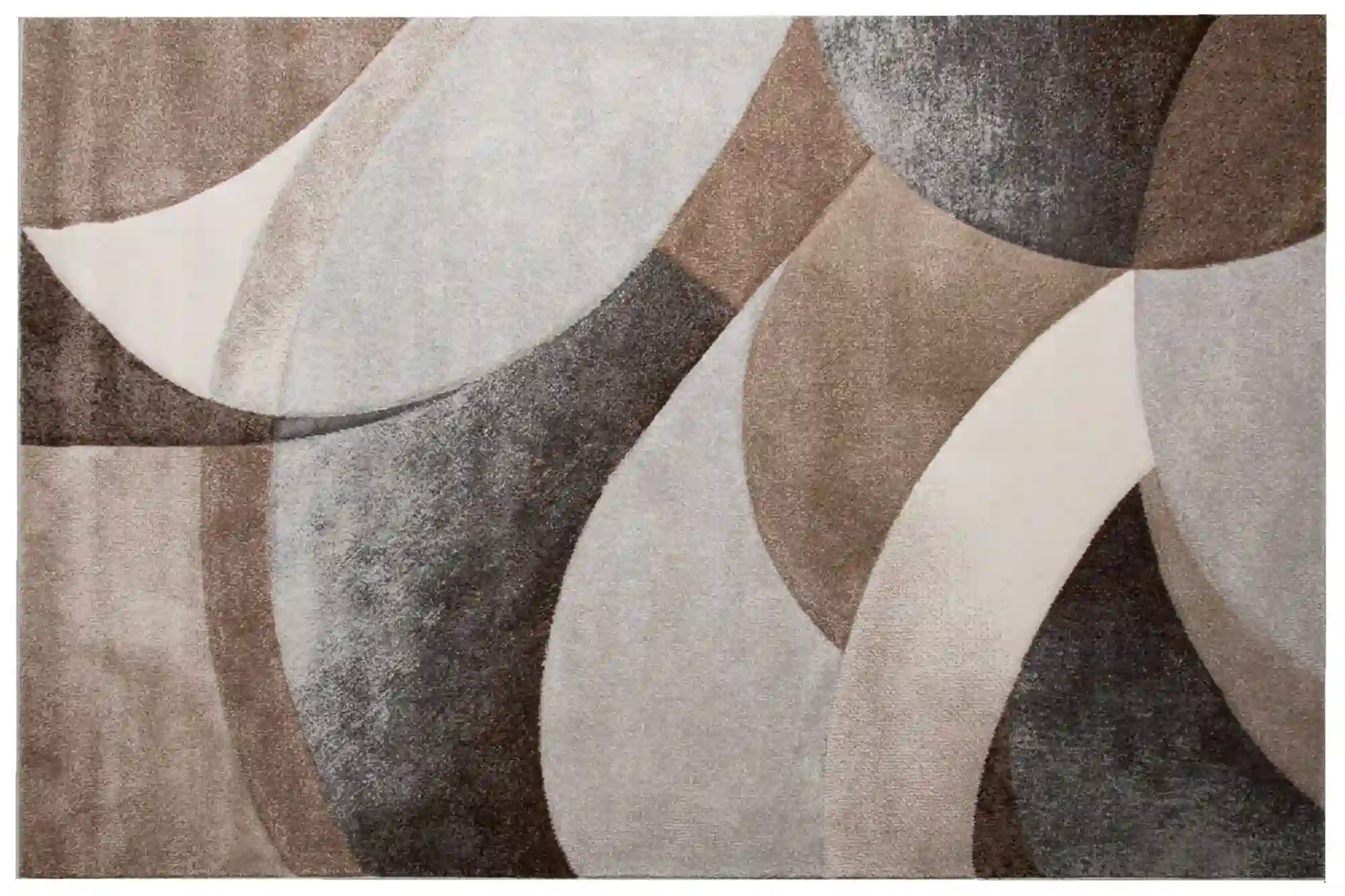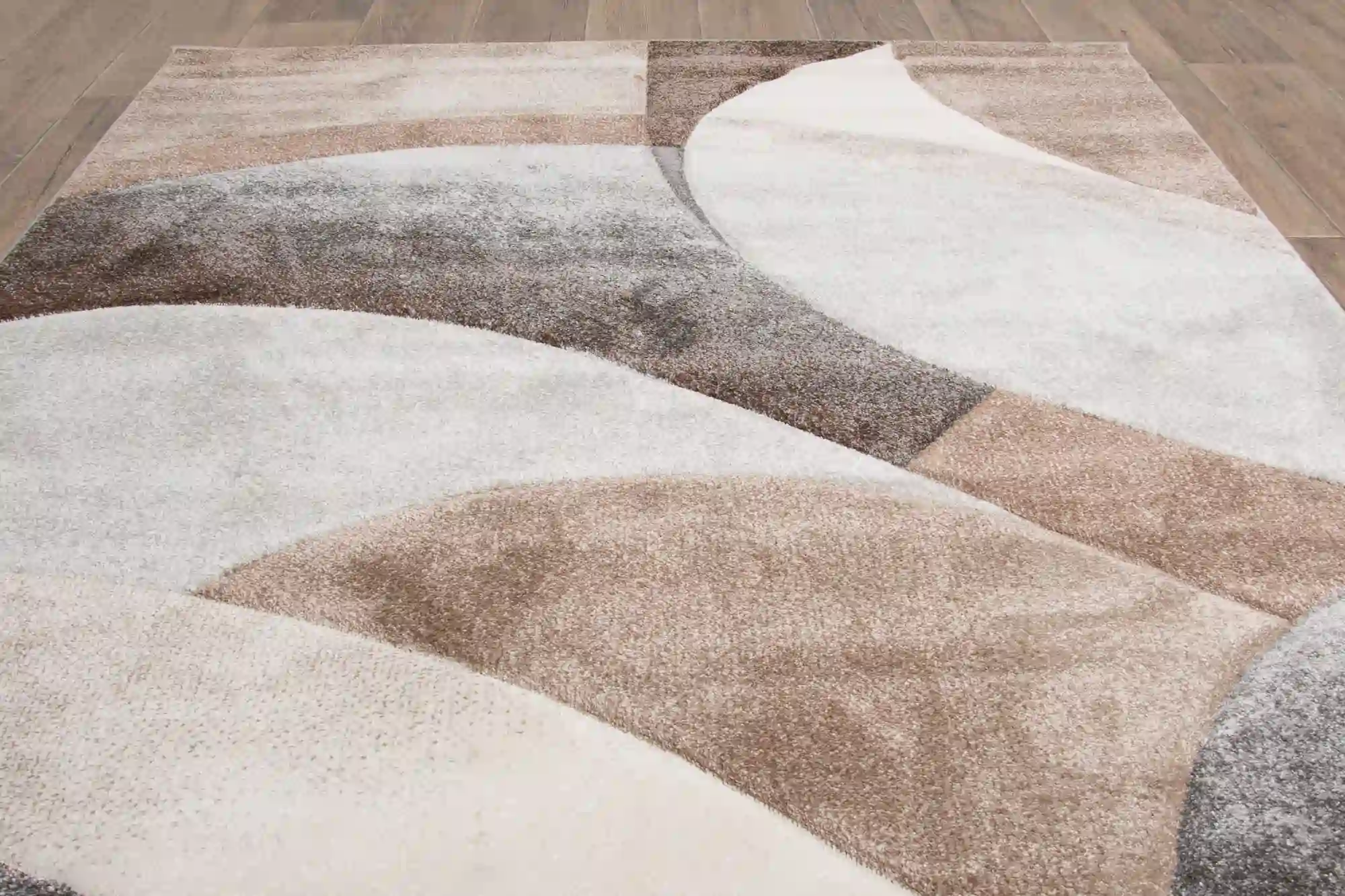 Dywan z nowoczesnym, geometrycznym wzorem w odcieniach szarości, beżu i kremu tworzy efekt głębi. Wykonany z trwałego polipropylenu, jest odporny na zabrudzenia i łatwy w czyszczeniu, co czyni go praktycznym i stylowym dodatkiem do każdego wnętrza.