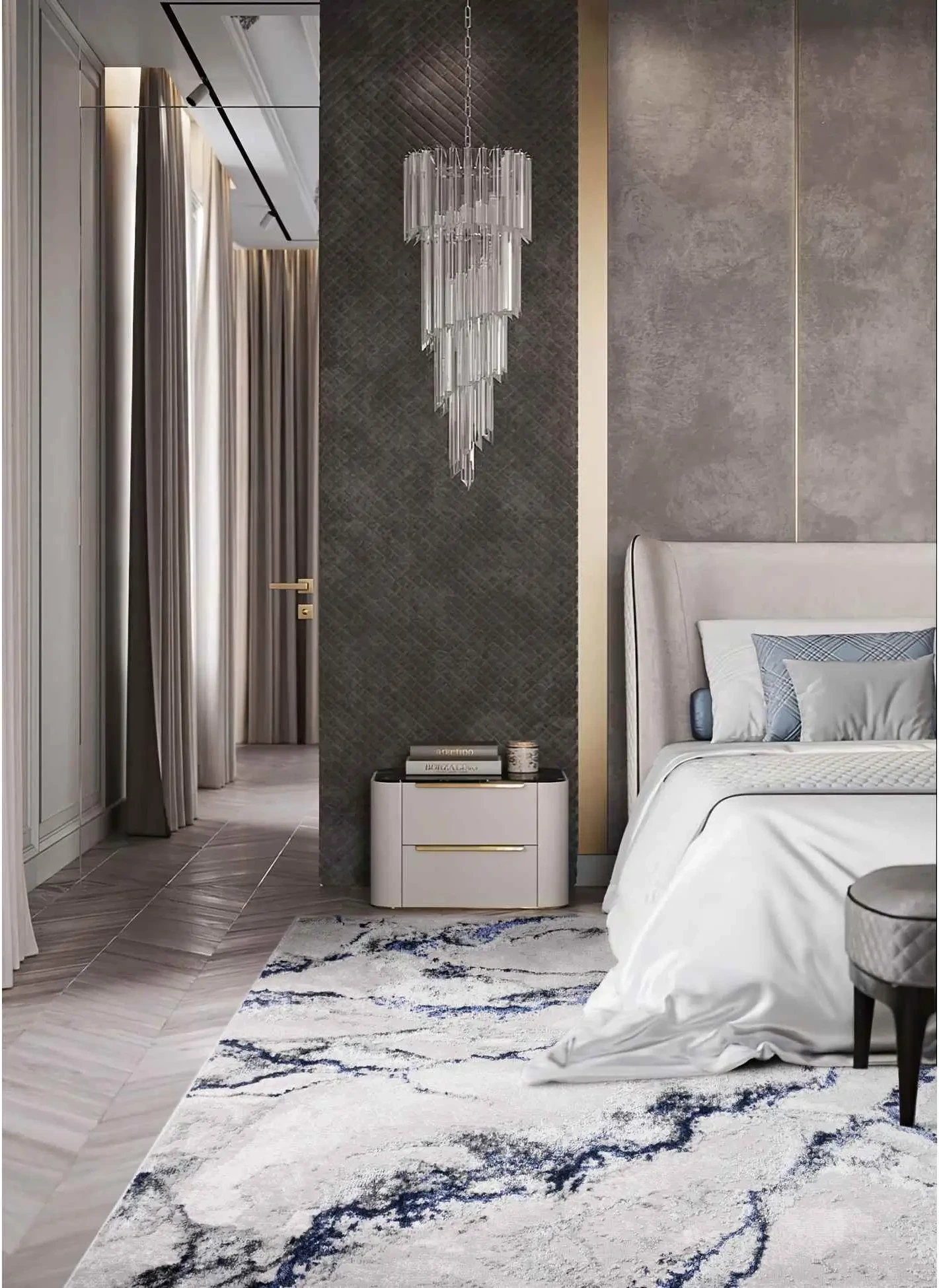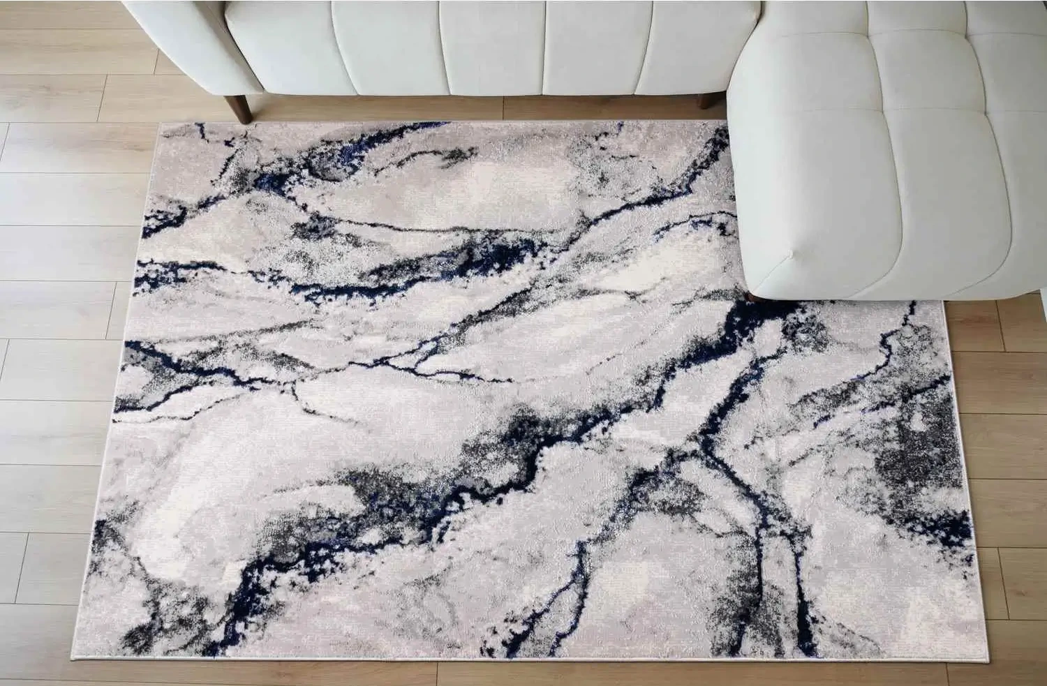 Miękki dywan z eleganckim, lekko połyskującym wzorem marmuru, idealny do nowoczesnych wnętrz. Przystosowany do ogrzewania podłogowego, zapewnia komfort i styl w każdym pomieszczeniu.
