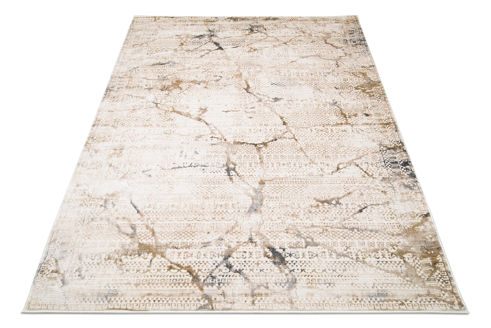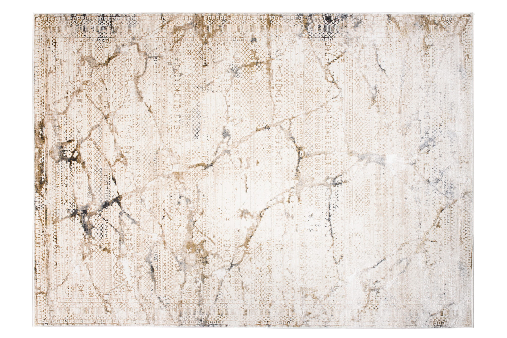 Miękki i przyjemny w dotyku dywan w subtelnych odcieniach kremu, beżu i szarego. Jego runo, przypominające spękany marmur, zostało ozdobione delikatnym geometrycznym wzorem, który harmonijnie komponuje się z różnorodnymi stylami wnętrzarskimi.