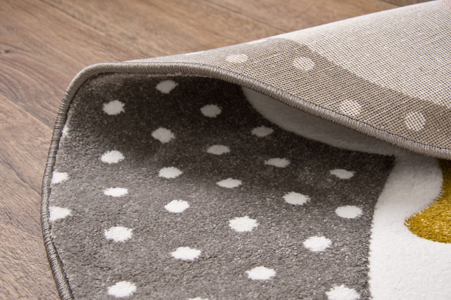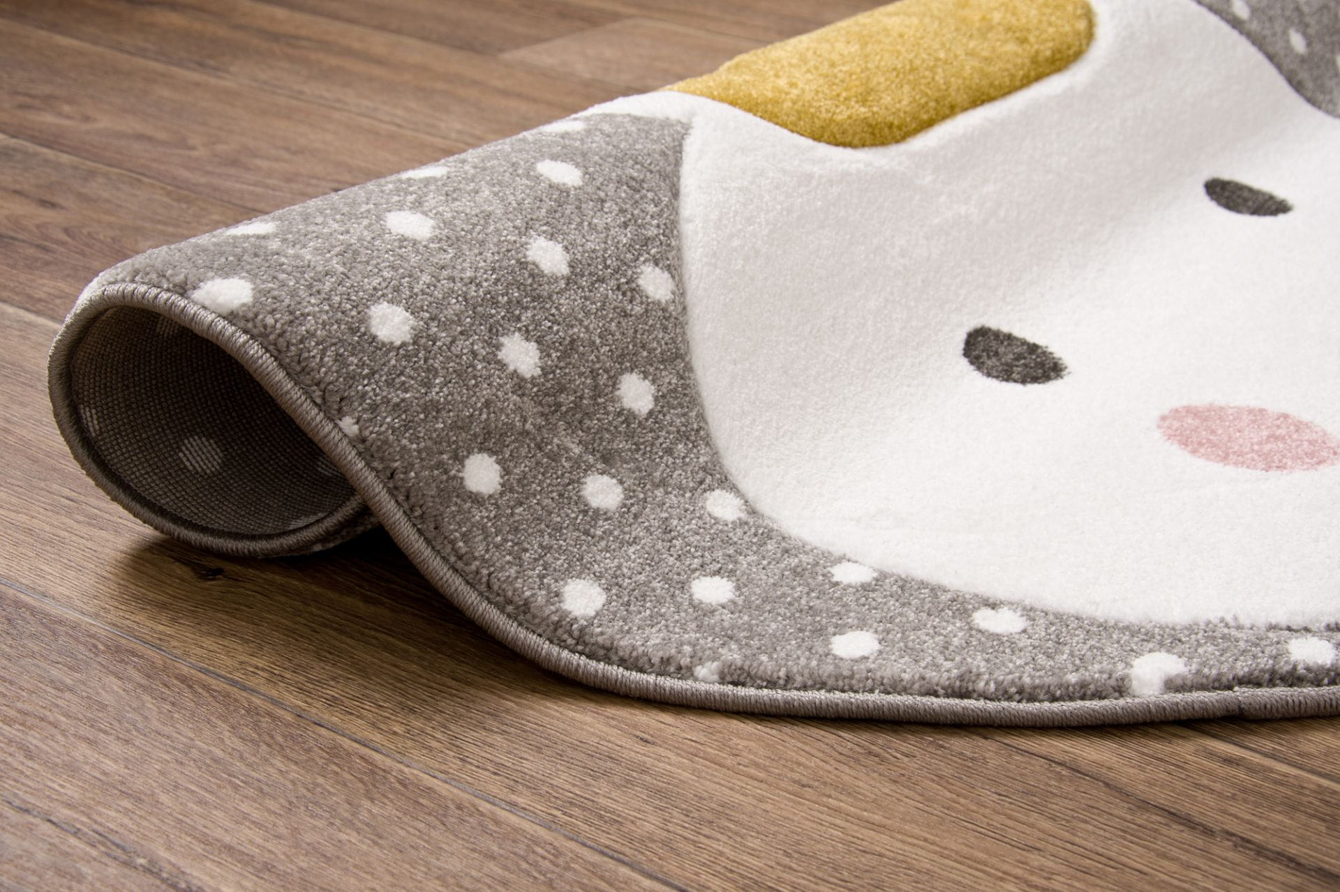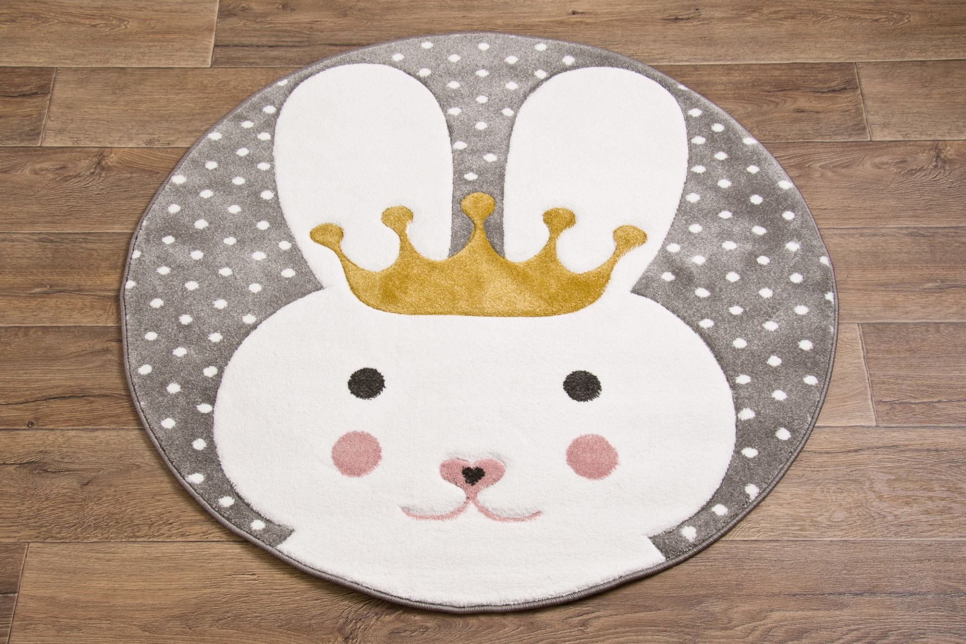 Ten dywan posiada prześliczny motyw białego króliczka z koroną na szarym tle w białe kropeczki. Trójwymiarowy wzór osiągnięty przez wycinany relief sprawią, że te dywaniki będą przyjemną i wdzięczną dekoracją dziecięcego pokoju.