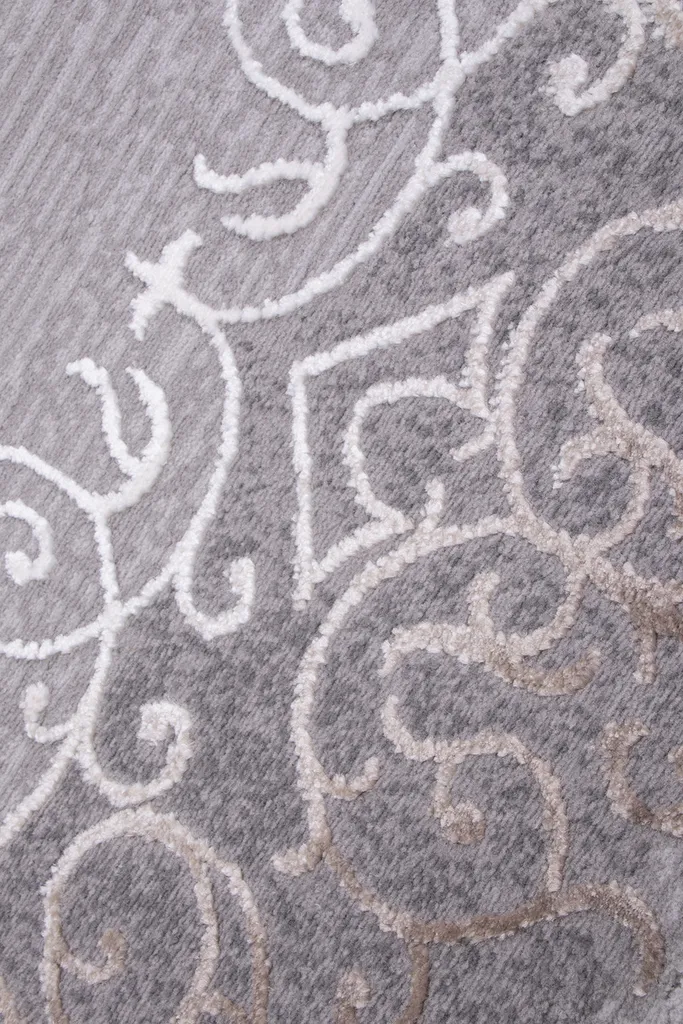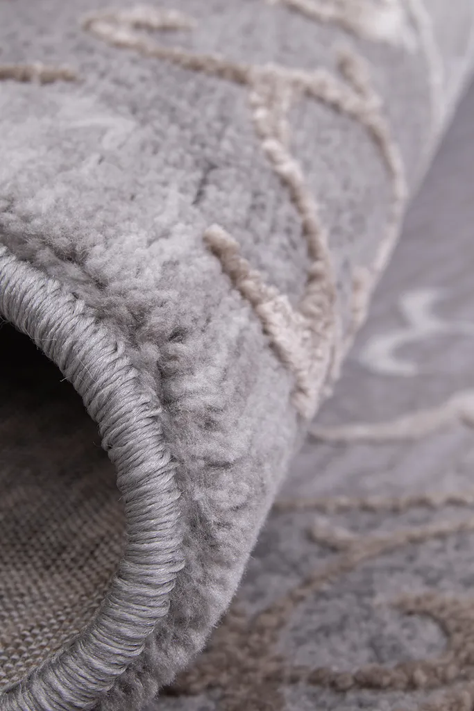 Klasyczny dywan z poliestru i polipropylenu z dwupoziomowym runem tworzącym efekt 3d. Utrzymany w stonowanej kolorystyce szarości i brązu, nadaje wnętrzu elegancji i głębi. Miękki w dotyku, trwały i łatwy w pielęgnacji.