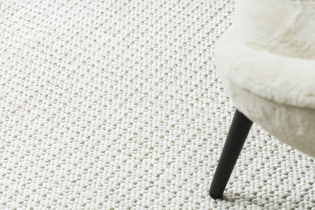 Stylowy, płaskotkany dywan w kolorze białym, z grubym, pętelkowym splotem runa. Jest łatwy w czyszczeniu i wyjątkowo praktyczny w codziennym użytkowaniu.
