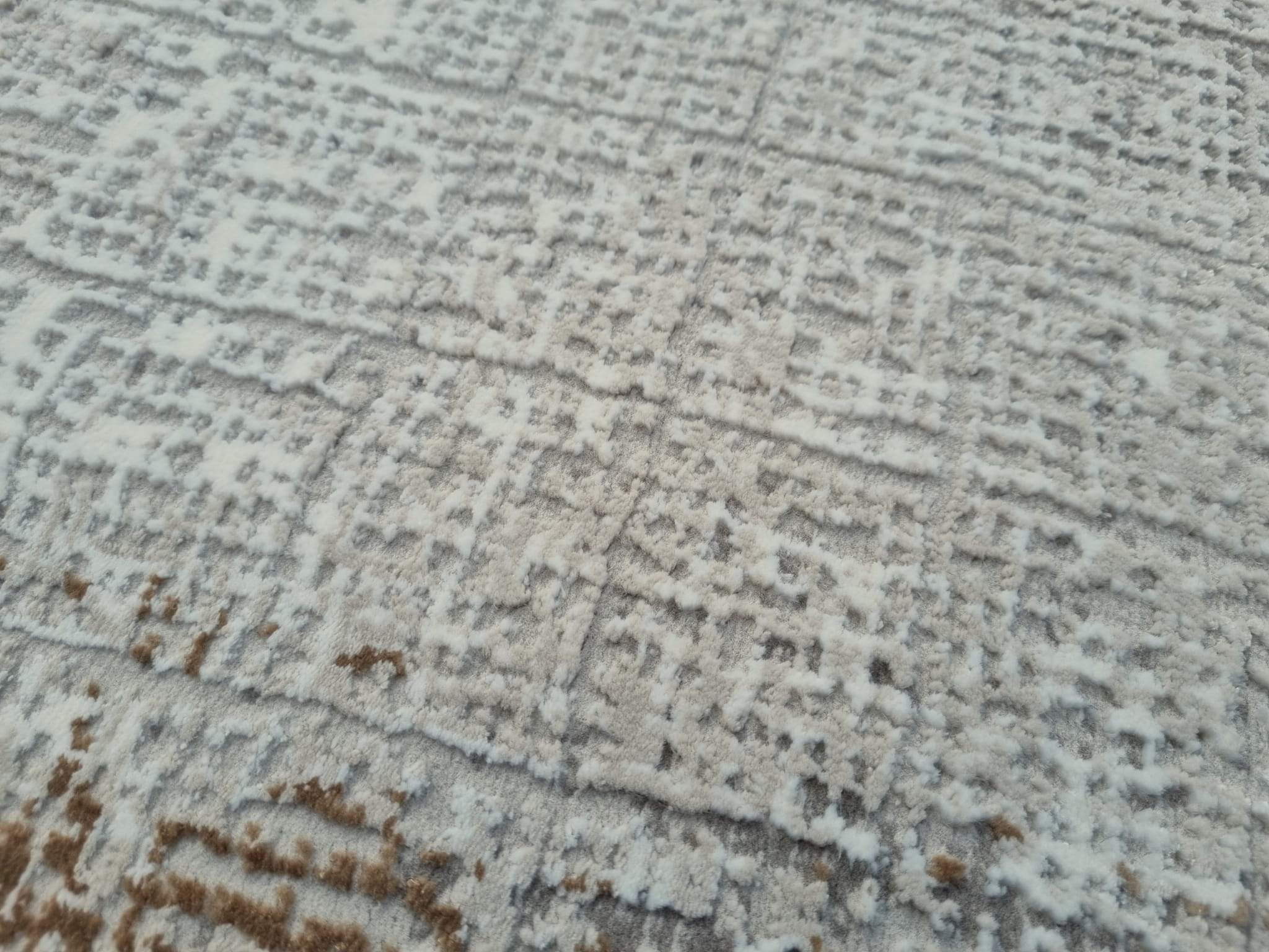 Dywan w kolorystyce brązu i szarości z delikatnymi przetarciami przez środek i wykończony ramą z pięknymi ornamentami. Dwupoziomowe runo tworzy trójwymiarowy efekt 3d a całości dopełnia delikatny połysk runa.