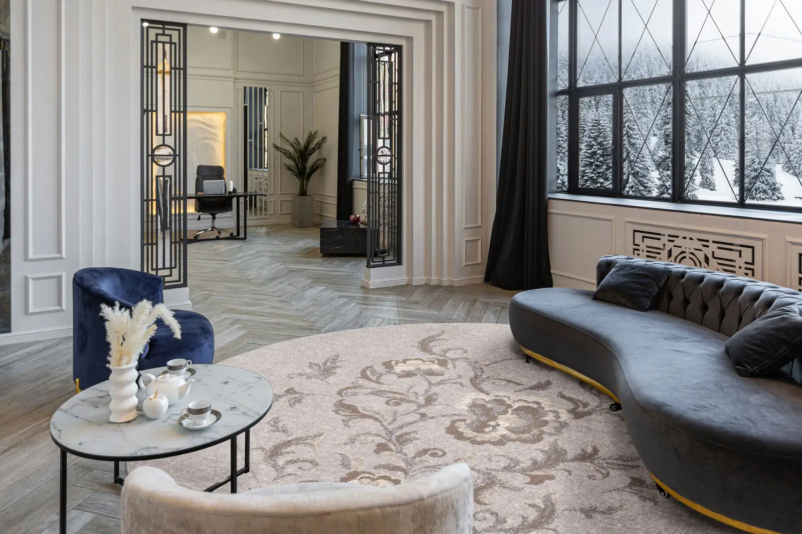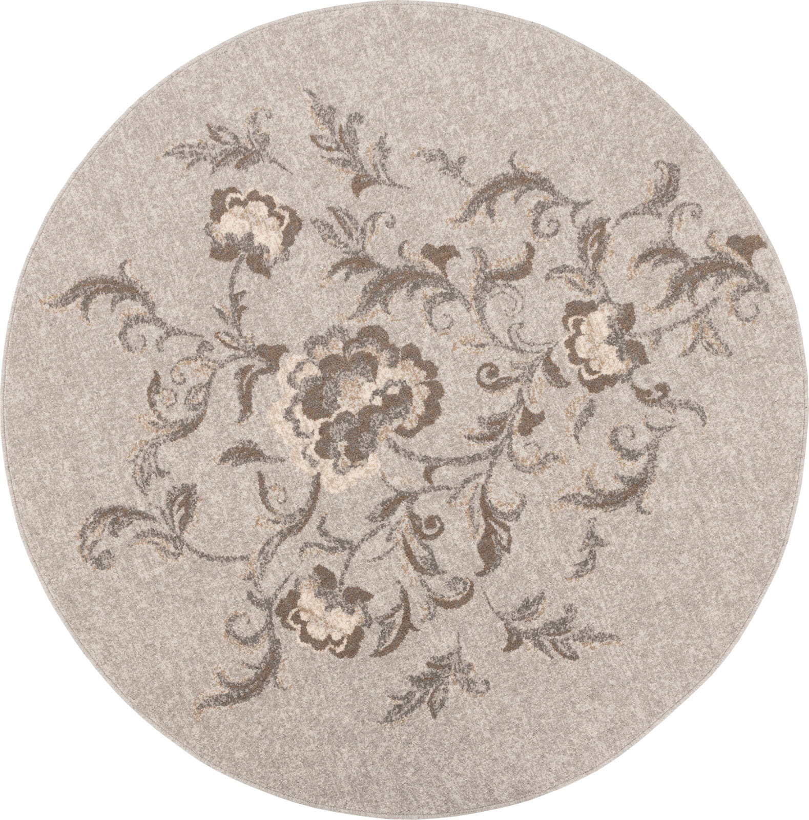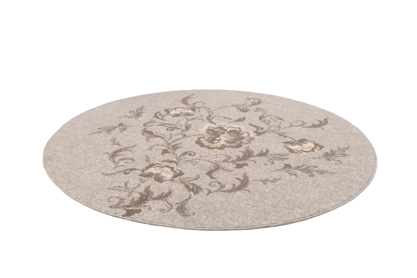 Wykonany z najwyższej jakości wełny owczej, łączy estetykę z wyjątkową trwałością i łatwością w pielęgnacji. Dywan o okrągłym kształcie z motywem delikatnie szkicowanych kwiatów tworzących bukiet. Kwiaty są subtelne, w odcieniach szarości i brązu, co nadaje wzorowi elegancki, stonowany wygląd.