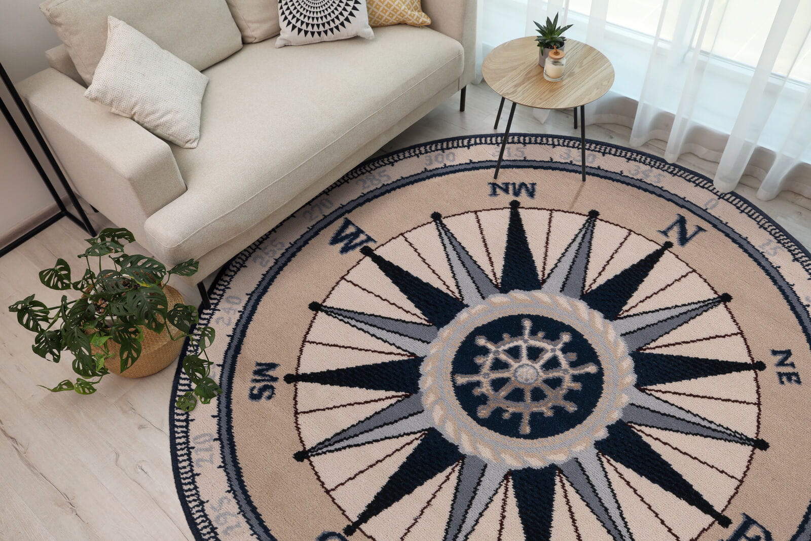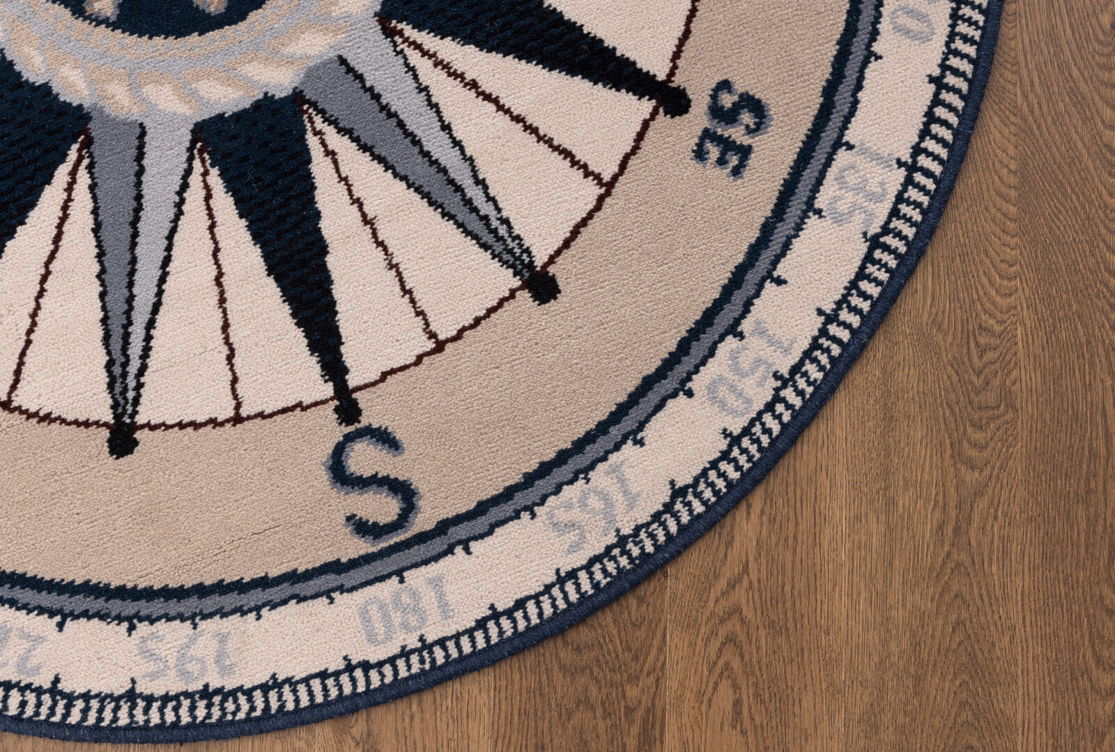 Jeśli jesteś fanem żeglugi lub poszukiwaczem przygód morskich z pewnością musisz mieć ten wyjątkowy dywan z motywem kompasu. Dywan wykonany z wełny z domieszką poliamidu. Charakteryzuje się miękkim, sprężystym runem, trwałymi kolorami oraz wysoką odpornością na użytkowanie.