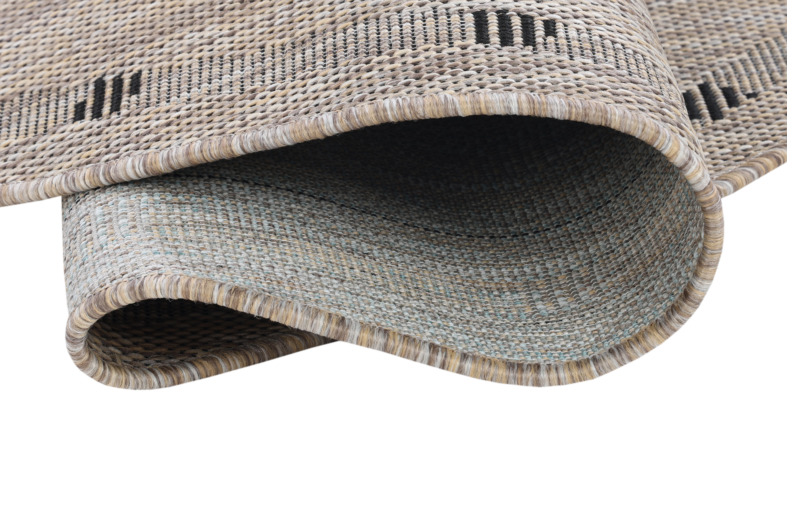 Nowoczesny dywan sznurkowy o płaskim splocie do wnętrz i na zewnątrz. Geometryczne wzory nadają mu nowoczesny charakter, a trwały materiał zapewnia odporność na warunki atmosferyczne. Łatwy w czyszczeniu i praktyczny – idealny do domu, ogrodu, na taras czy balkon.