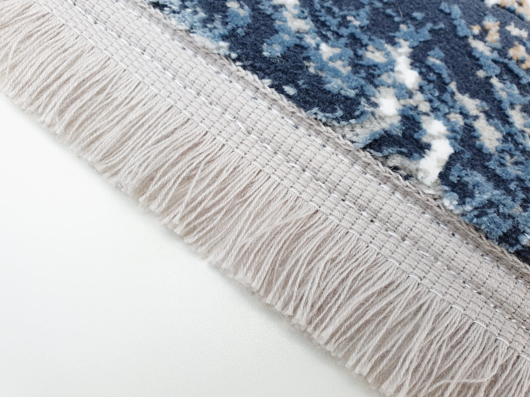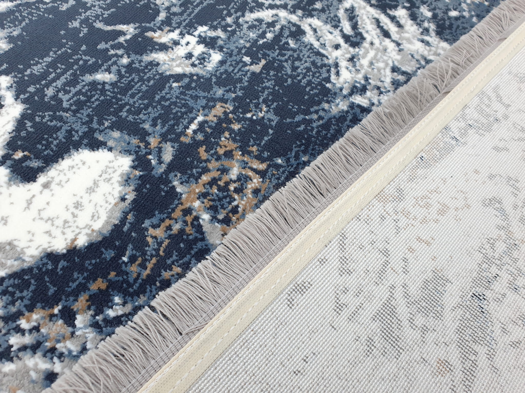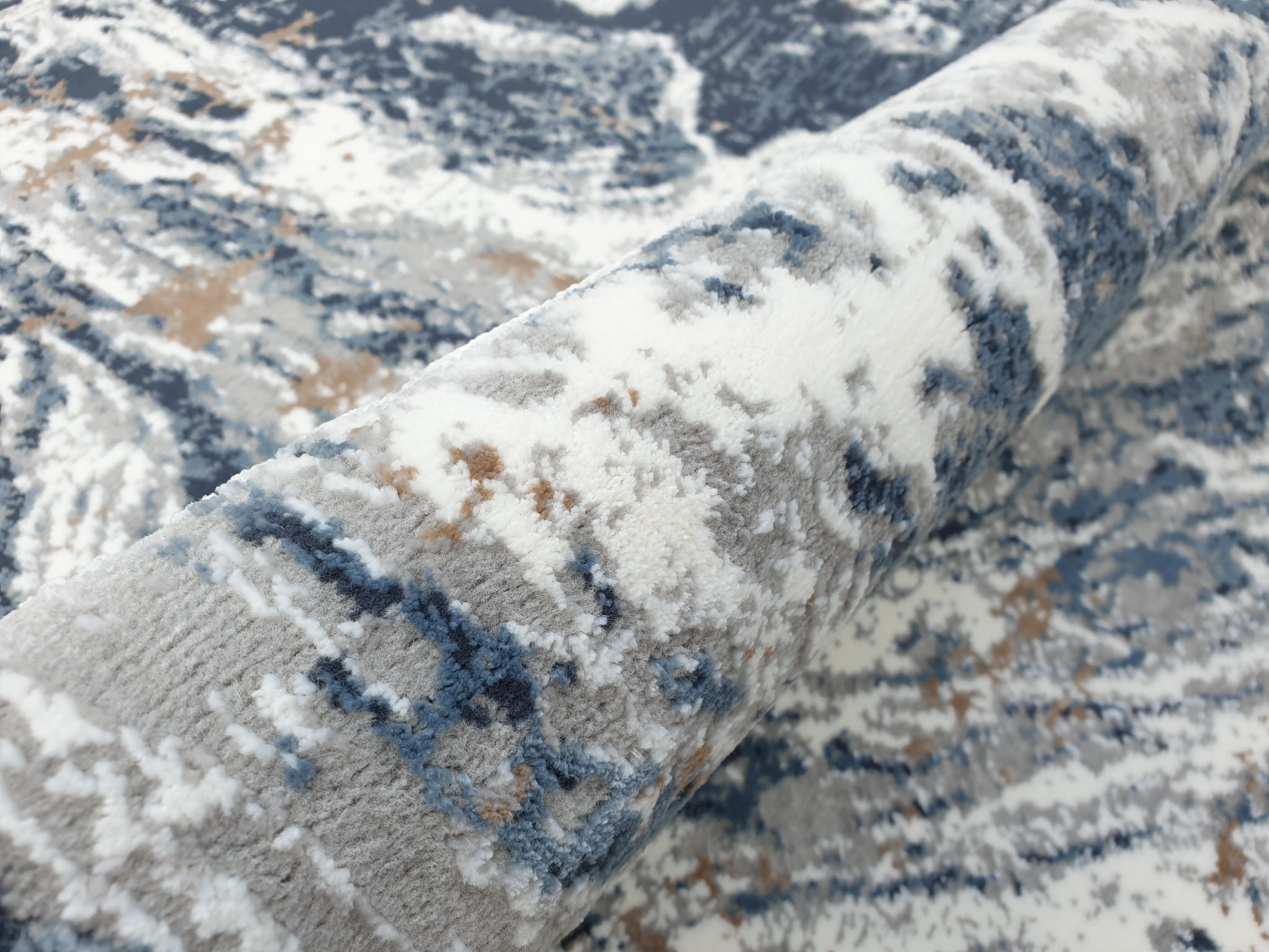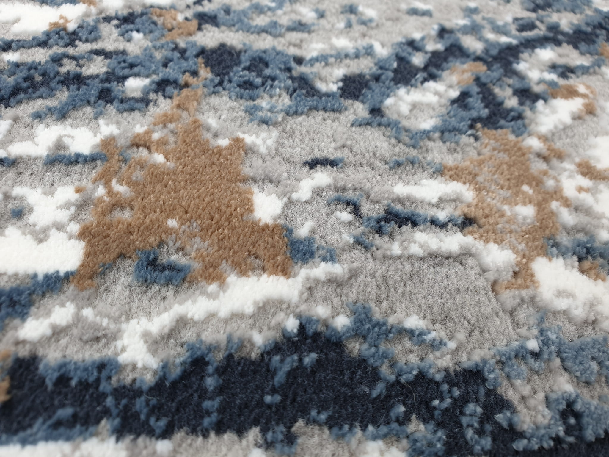 Dywan w kolorystyce szarości i granatu o wzorze imitującym naturalny marmur nada wnętrzu nowoczesny i dynamiczny charakter. Dwupoziomowe runo tworzy trójwymiarowy efekt 3d a całości dopełnia delikatny połysk runa.