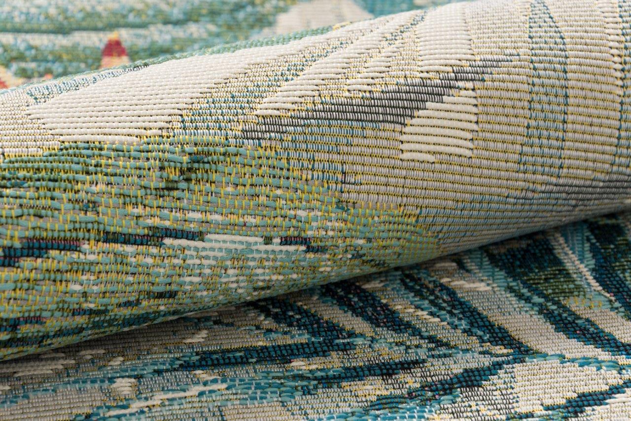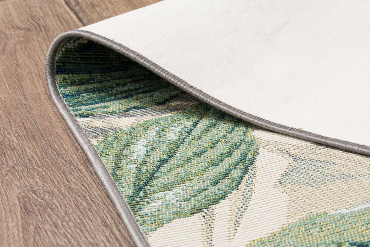 Dywan z motywem kolorowych tropikalnych liści i kwiatów, wykonany z trwałych syntetycznych włókien. Posiada spód zapewniający bezpieczeństwo użytkowania oraz praktyczne płaskie runo, które nie przyciąga kurzu, łatwo się odkurza i doskonale sprawdza pod meblami oraz drzwiami.