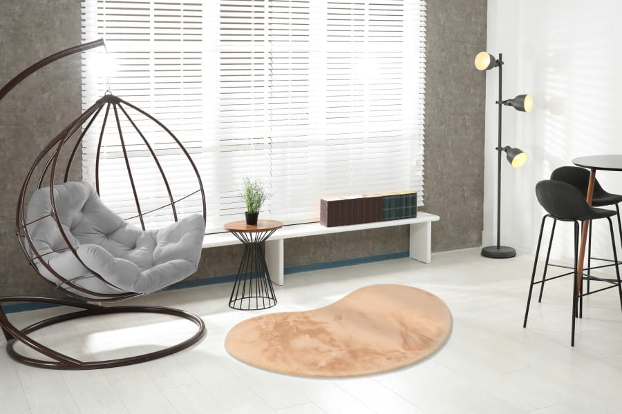 Super miękki i puszysty dywan o nietypowym kształcie, spód bawełniany, brzegi typu binding