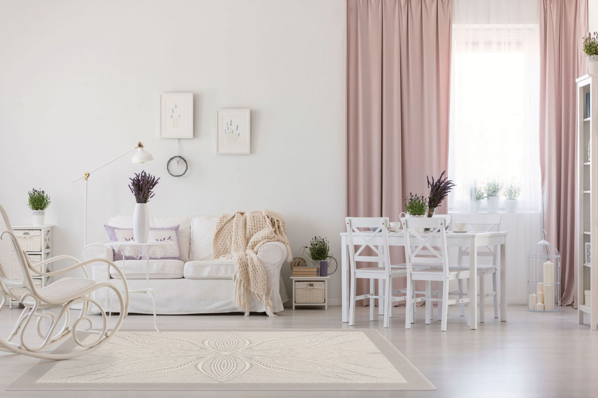 Wełna owcza klasy premium zapewnia luksusowy komfort. Delikatny, inspirowany przyrodą, kwiatowy wzór, na tle w kolorze złamanej bieli, dodaje elegancji i harmonii.