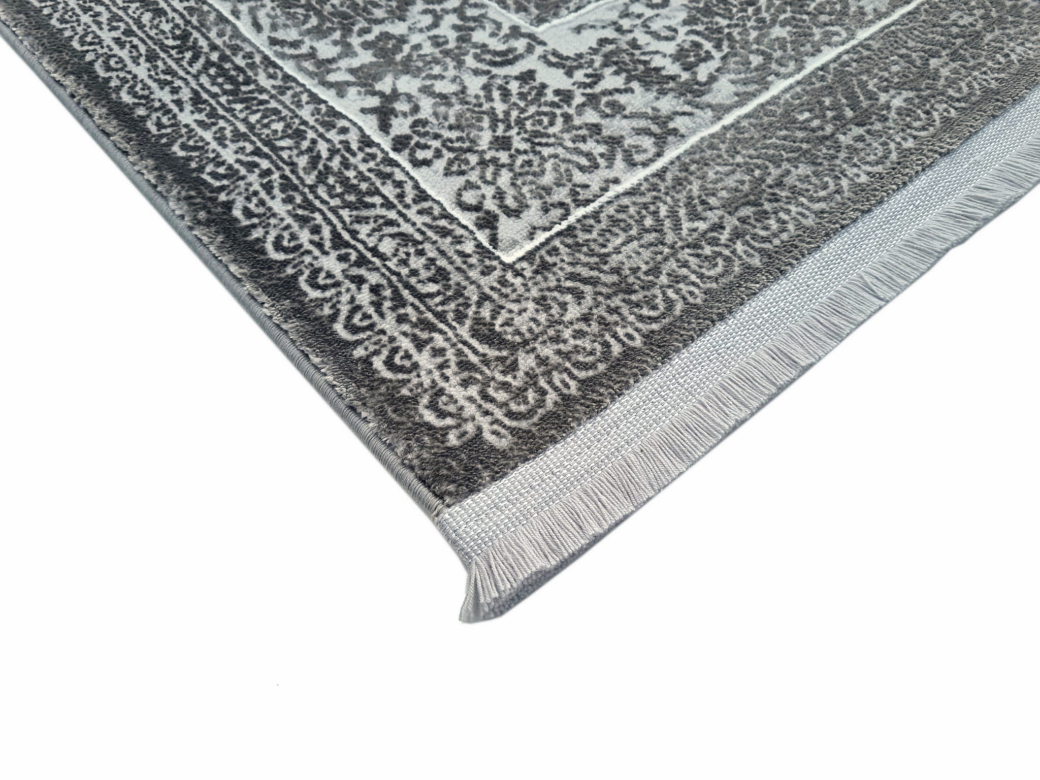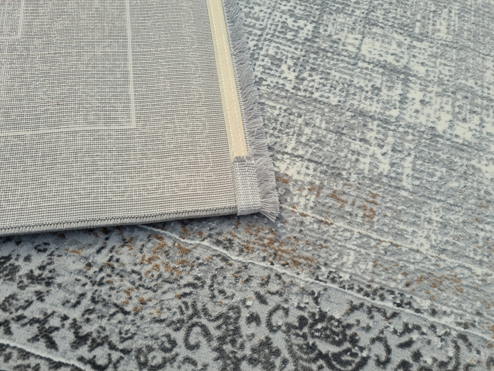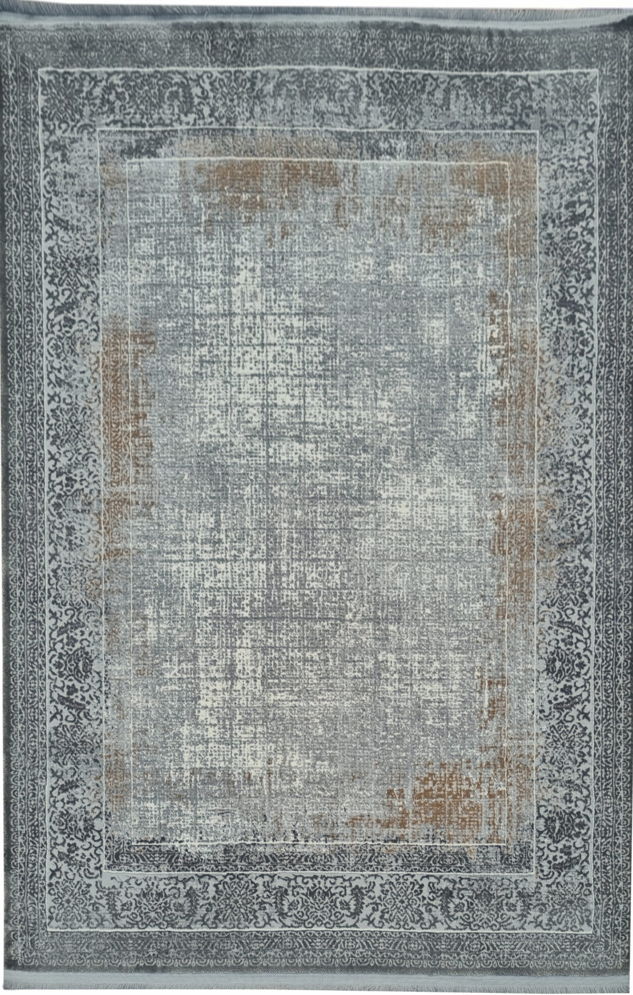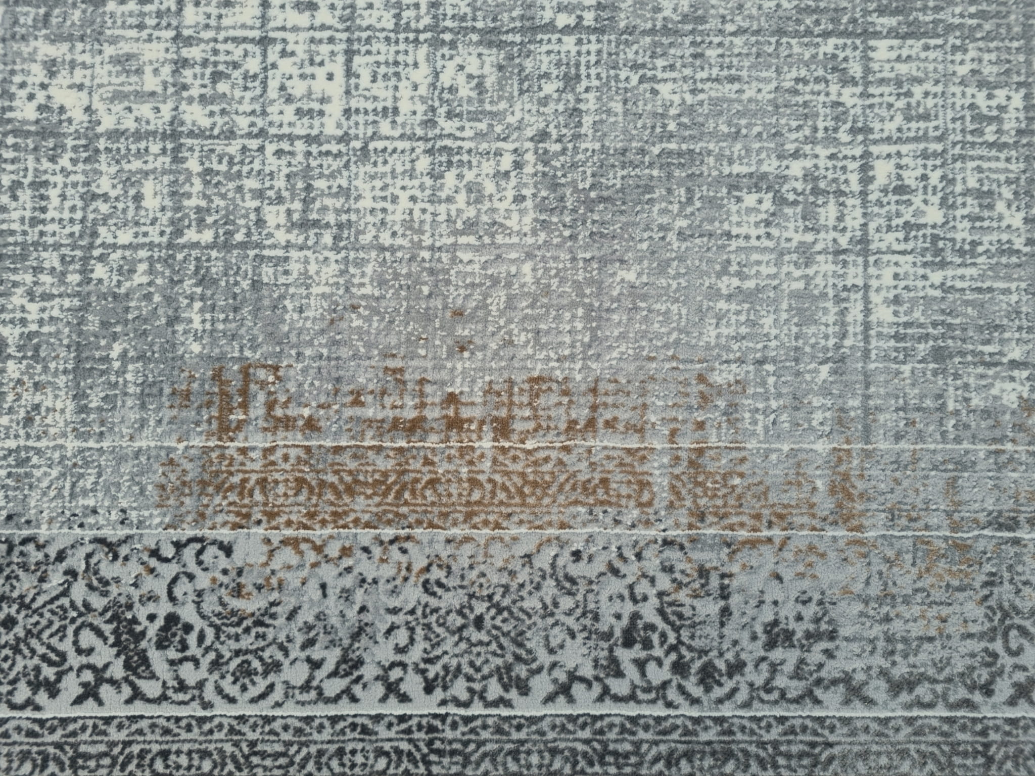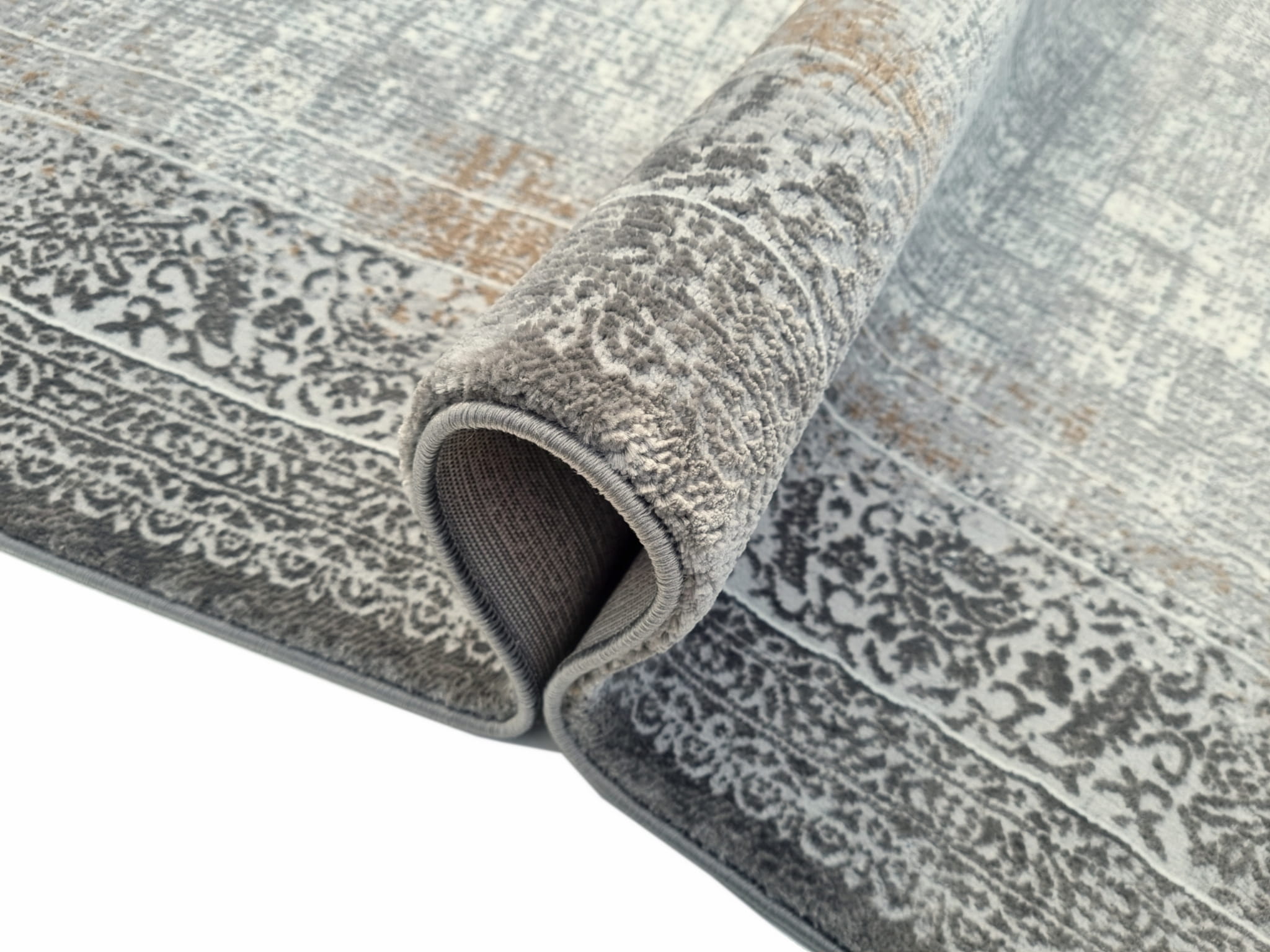 Dywan w kolorystyce szarości z delikatnymi przetarciami przez środek i wykończony ramą z pięknymi ornamentami. Dwupoziomowe runo tworzy trójwymiarowy efekt 3d, a całości dopełnia delikatny połysk runa.