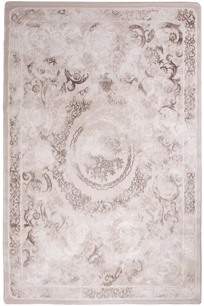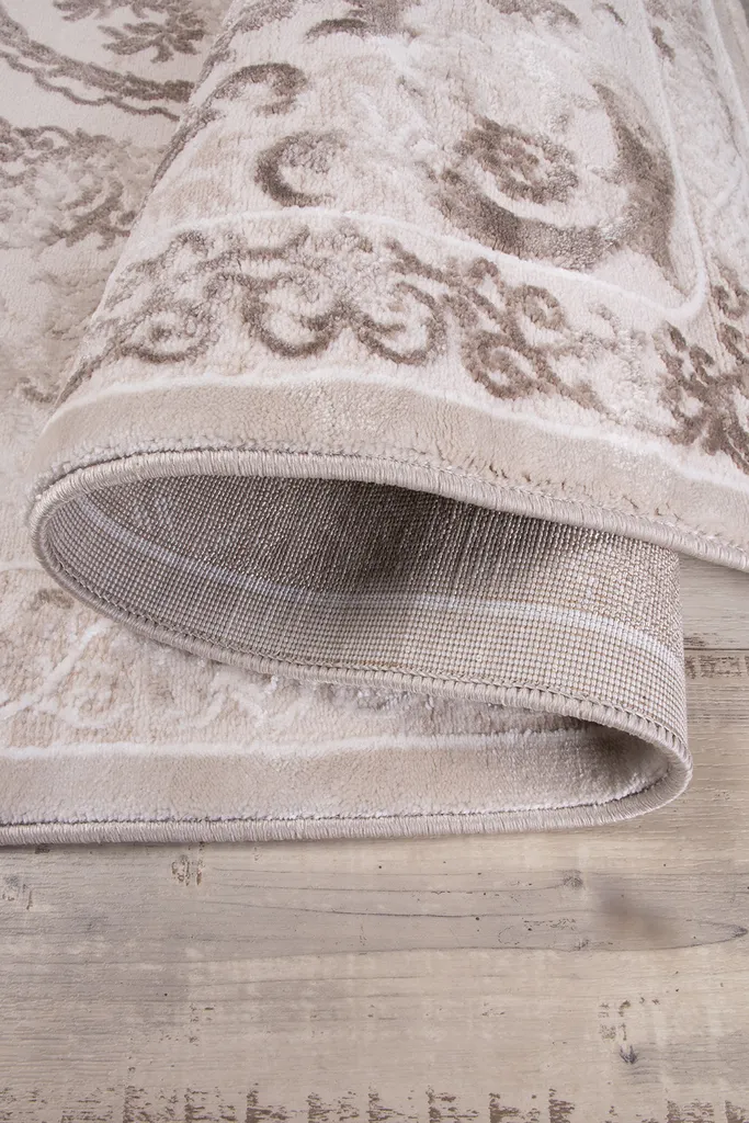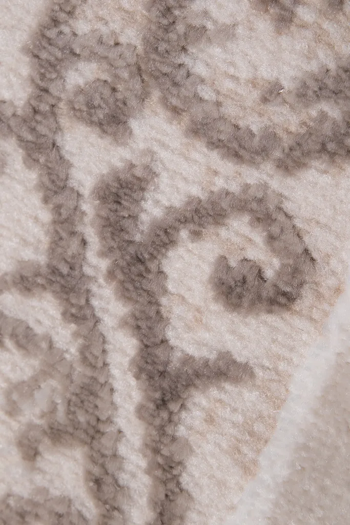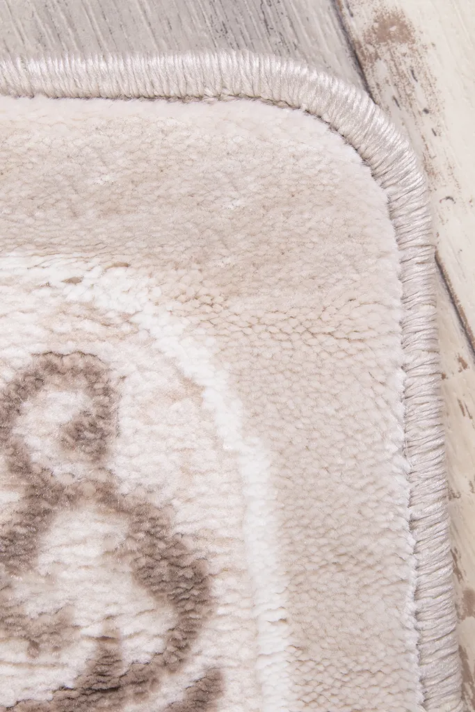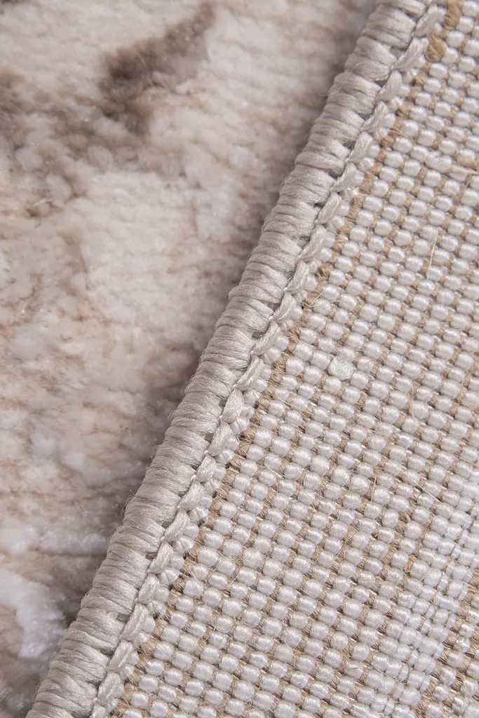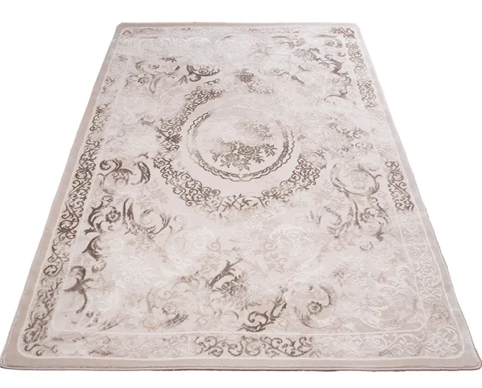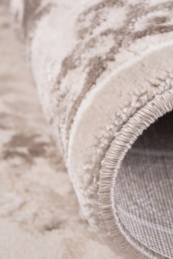 Tradycyjny dywan z poliestru i polipropylenu z dwupoziomowym runem tworzącym efekt 3d. Utrzymany w stonowanej kolorystyce beżu, brązu, nadaje wnętrzu elegancji i głębi. Miękki w dotyku, trwały i łatwy w pielęgnacji.
