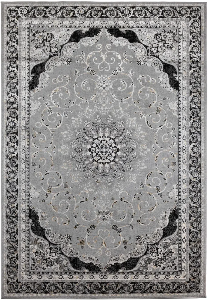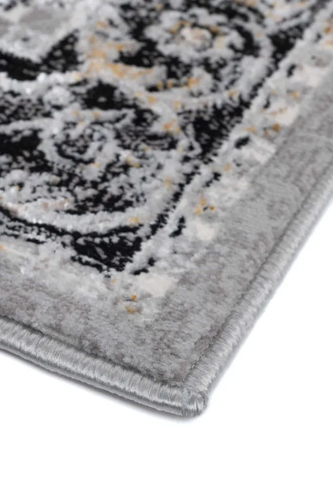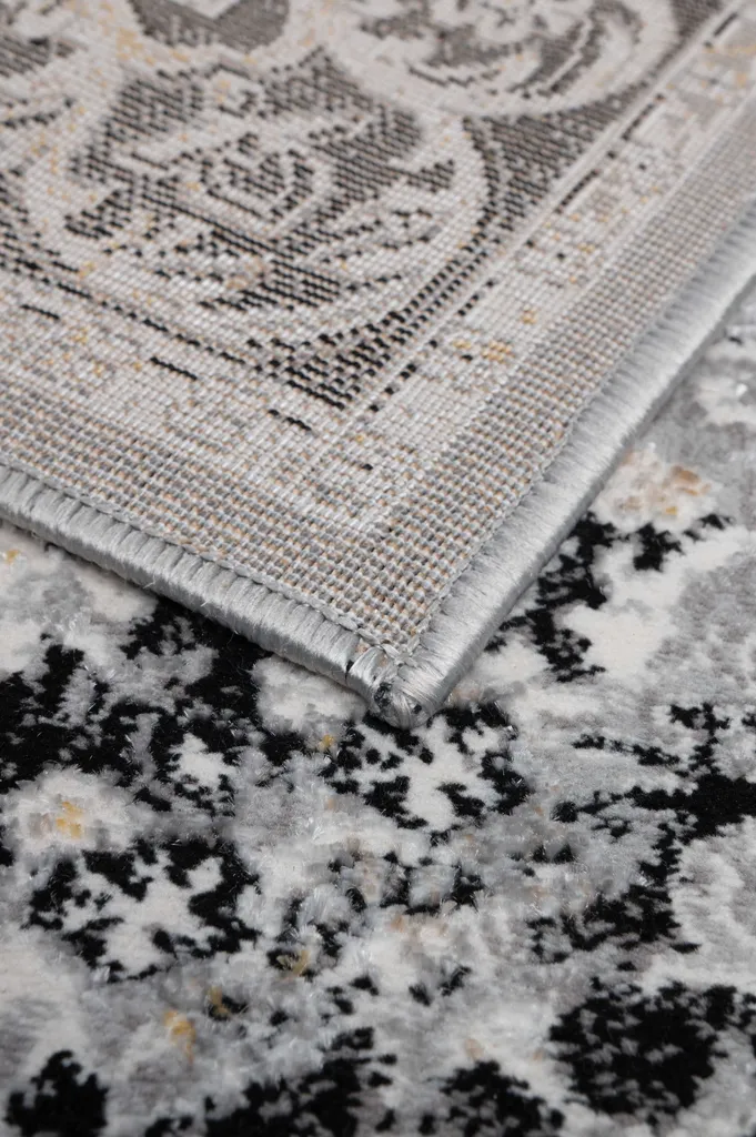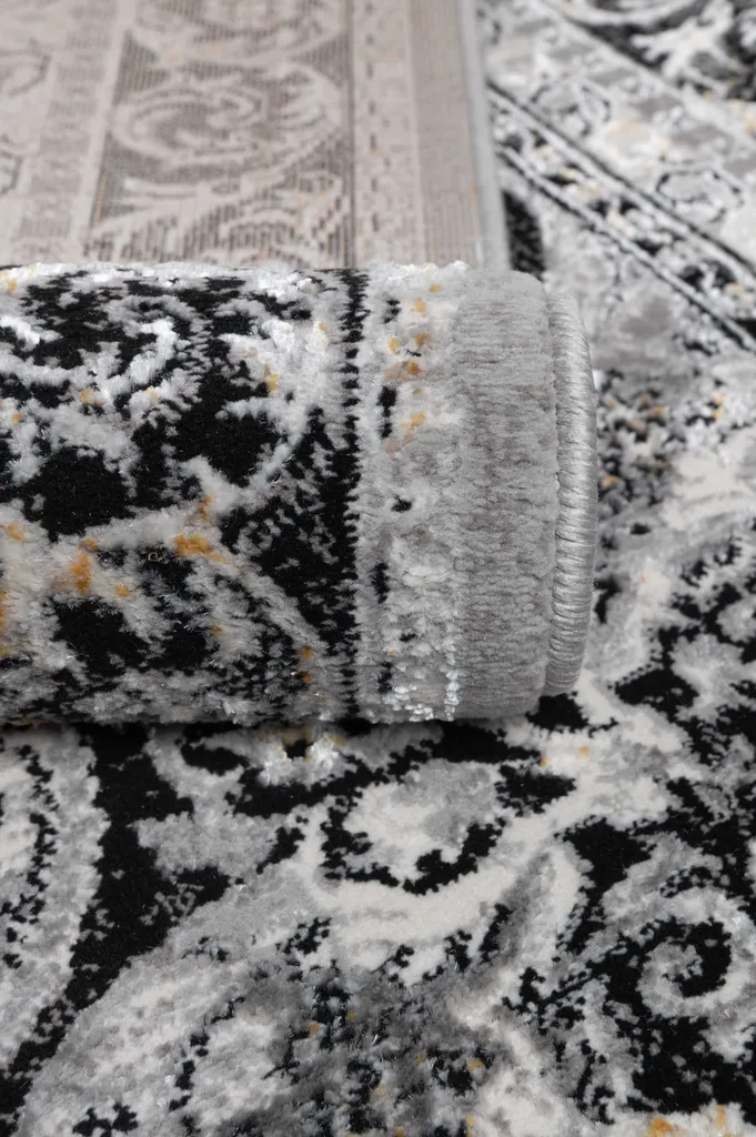 Elegancki dywan z wytrzymałego poliestru o subtelnym połysku. Klasyczny roślinny, koronkowy ornament w odcieniach czerni, bieli i szarości, otoczony dekoracyjną bordiurą, nadają mu ponadczasowego i szykownego charakteru.