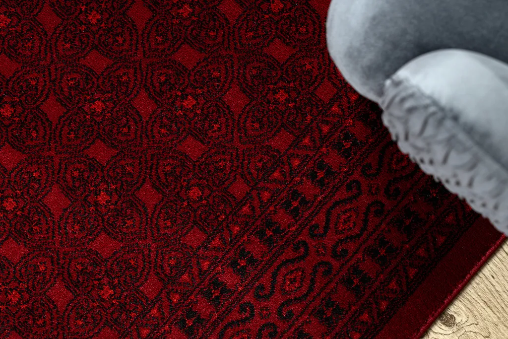 Elegancki dywan inspirowany bliskowschodnim wzornictwem zachwyca szlachetną czerwienią przełamaną akcentami czerni. Wykończony frędzlami na krótszych bokach, dodaje wnętrzu charakteru i ciepła. Wykonany z trwałych materiałów, odporny na zużycie.