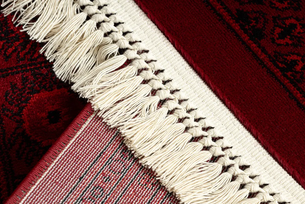 Elegancki dywan inspirowany bliskowschodnim wzornictwem zachwyca szlachetną czerwienią przełamaną akcentami czerni. Wykończony frędzlami na krótszych bokach, dodaje wnętrzu charakteru i ciepła. Wykonany z trwałych materiałów, odporny na zużycie.