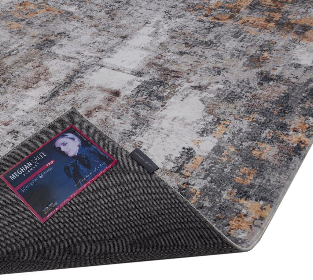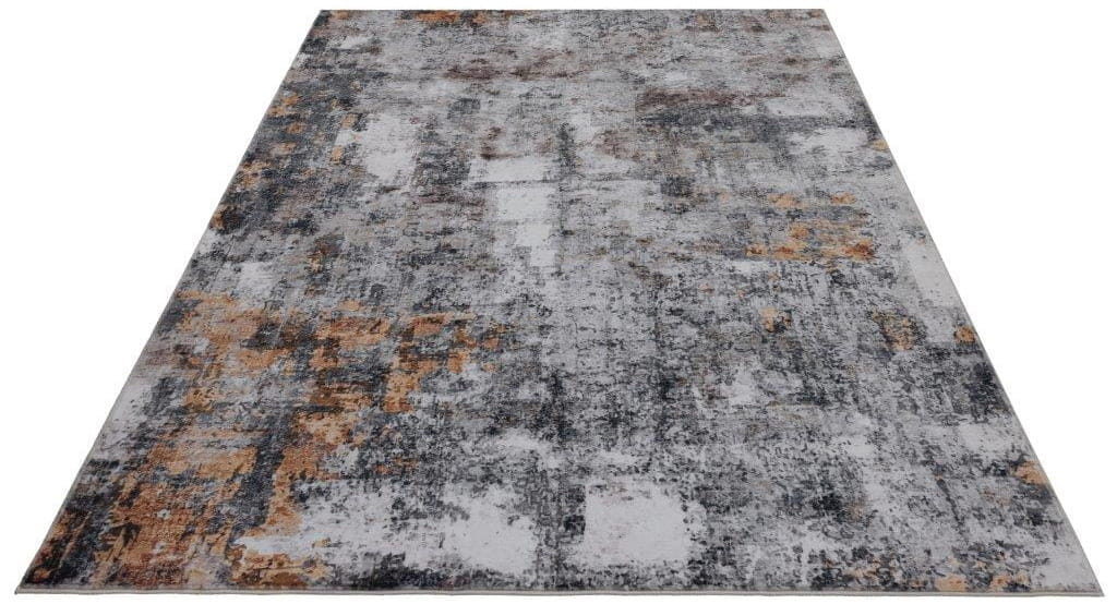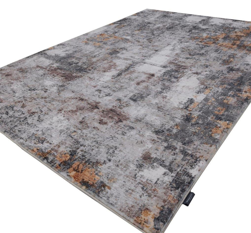 Miękki dywan z abstrakcyjnymi wzorami przypominającymi przetarte, postarzone powierzchnie z nieregularnym rozmieszczeniem barw. Jego design nawiązuje do nowoczesnego stylu vintage, tworząc efekt głębi i tekstury.