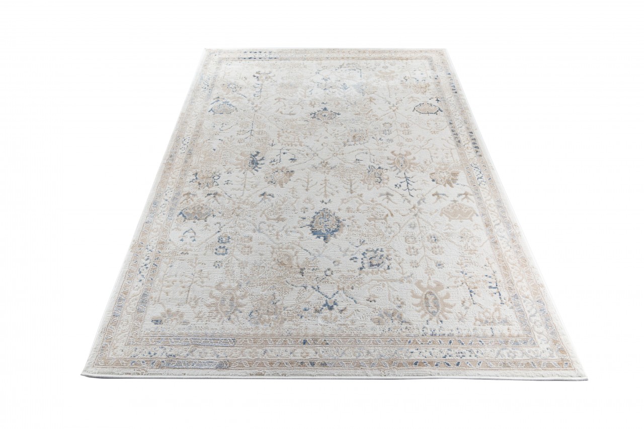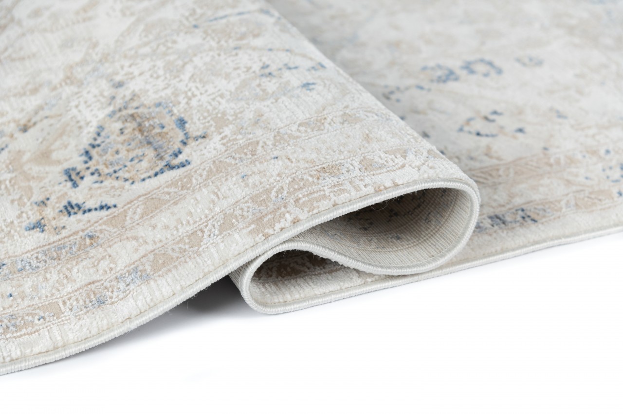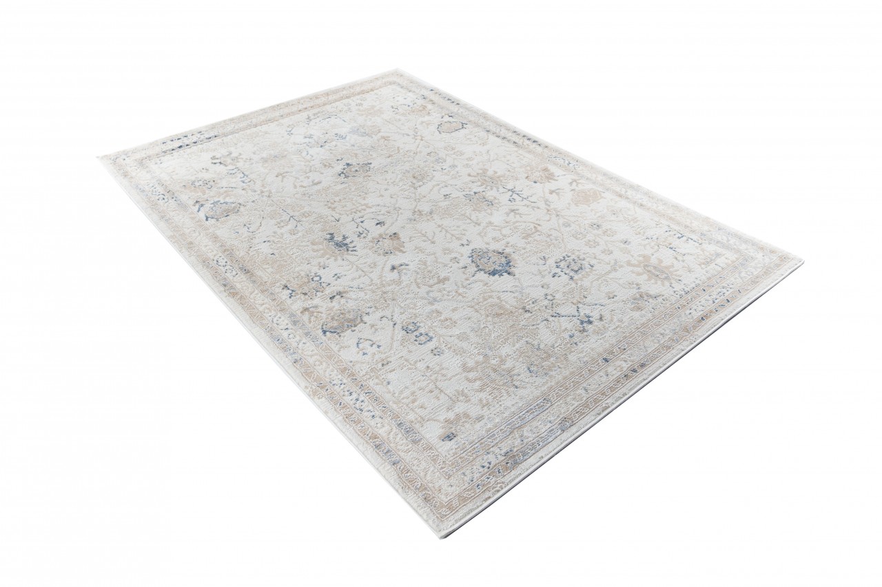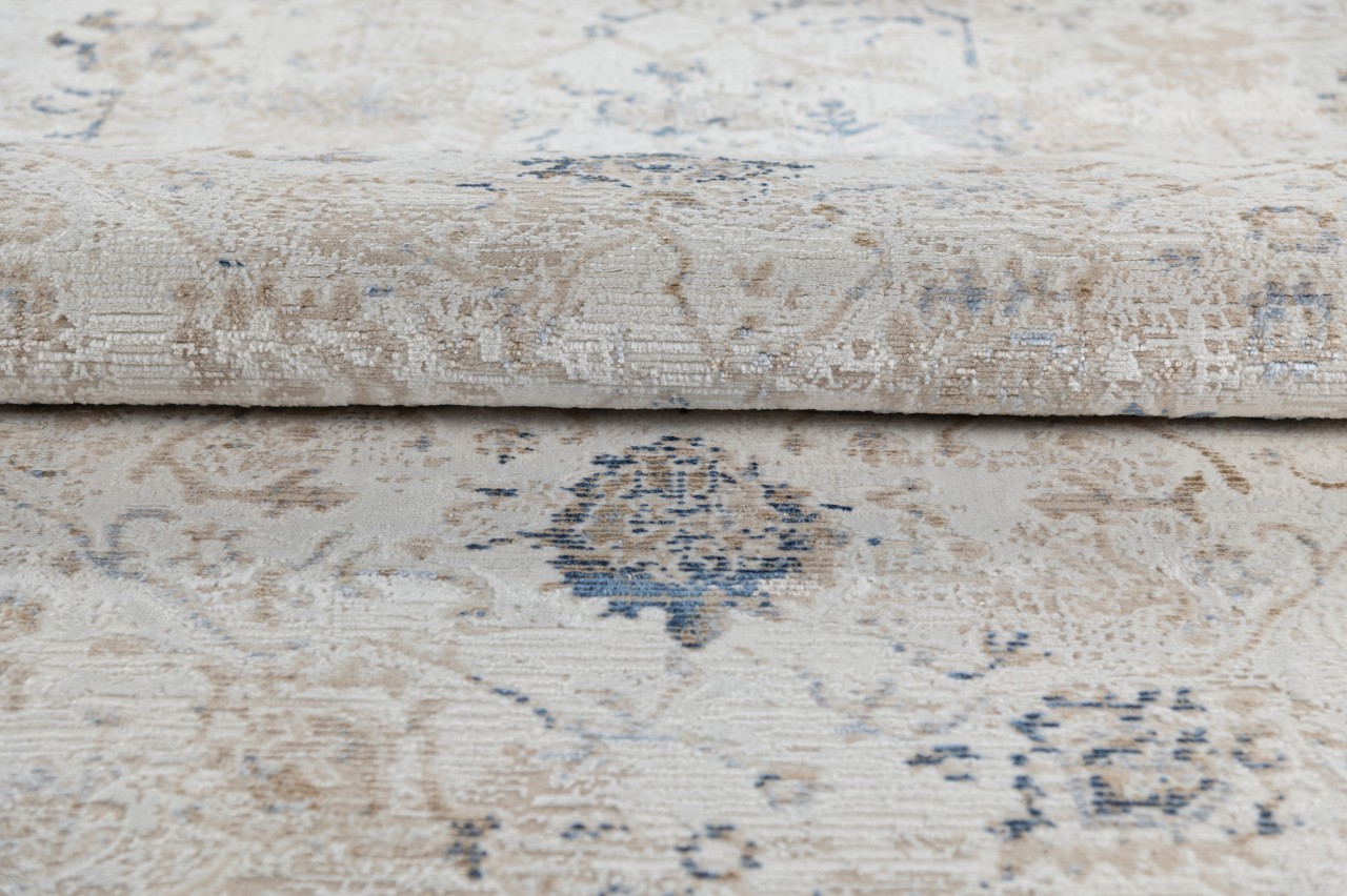 Dywan o dwupoziomowej strukturze z klasycznym, roślinnym wzorem w beżowo-kremowej tonacji z akcentami błękitu, inspirowany stylem vintage. Wykonany z wysokiej jakości włókien syntetycznych, gwarantuje trwałość i łatwość w utrzymaniu czystości.
